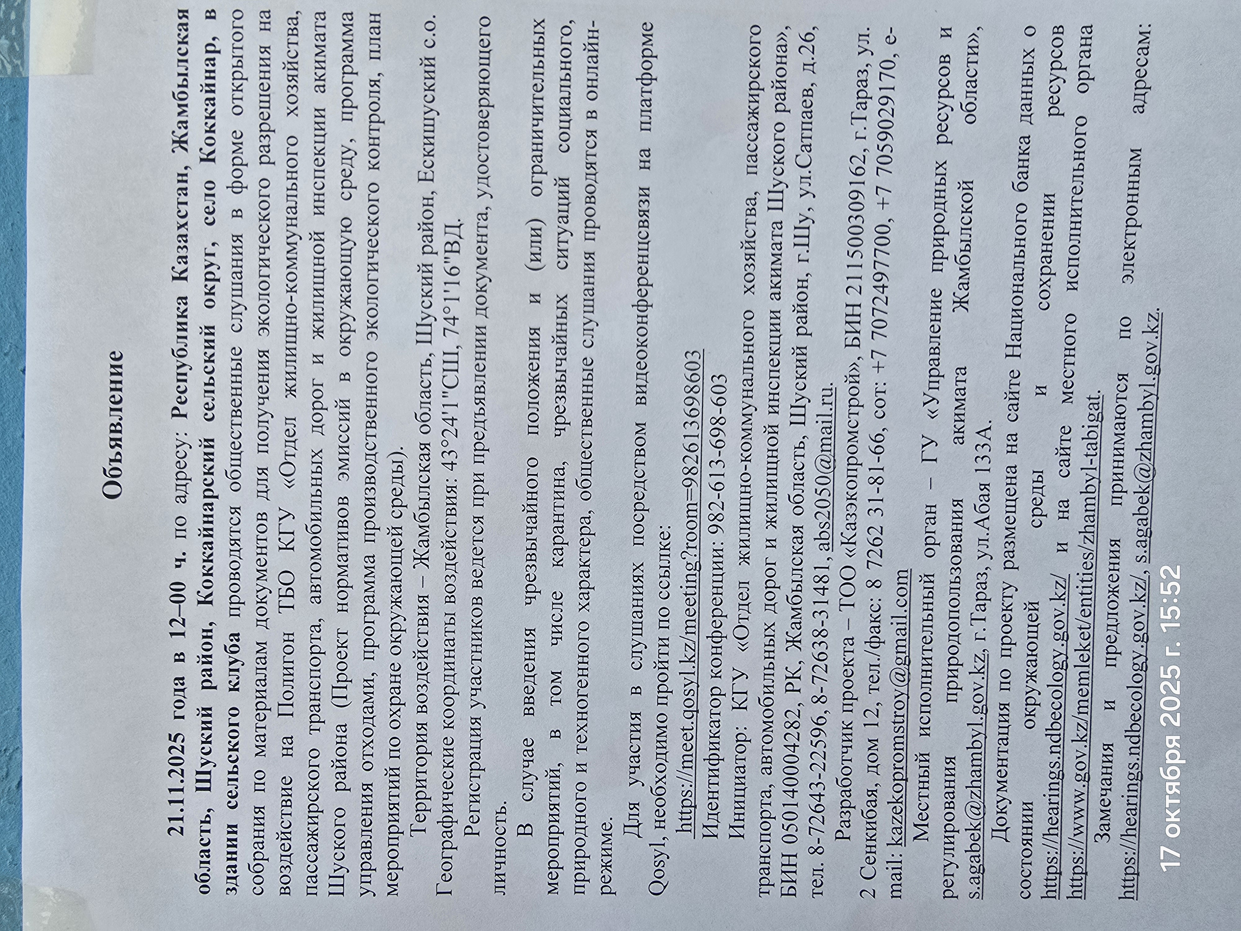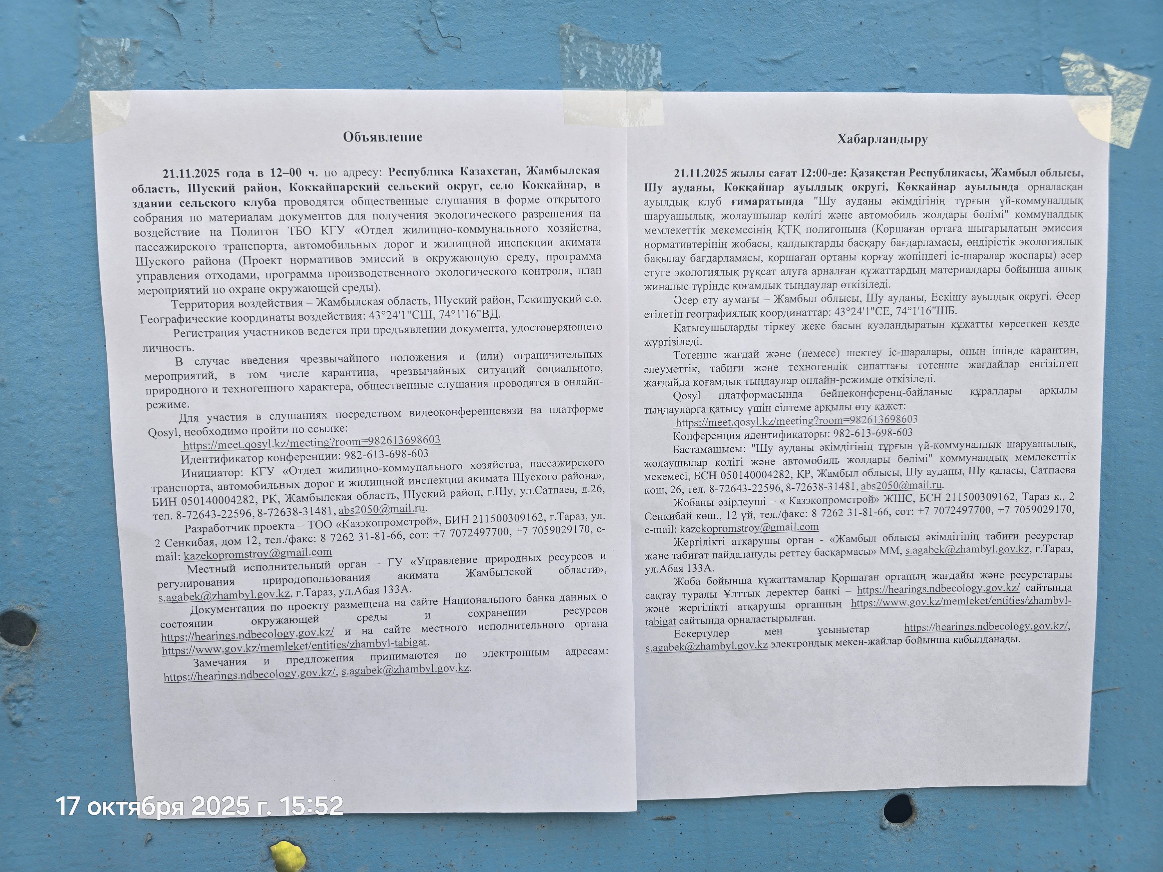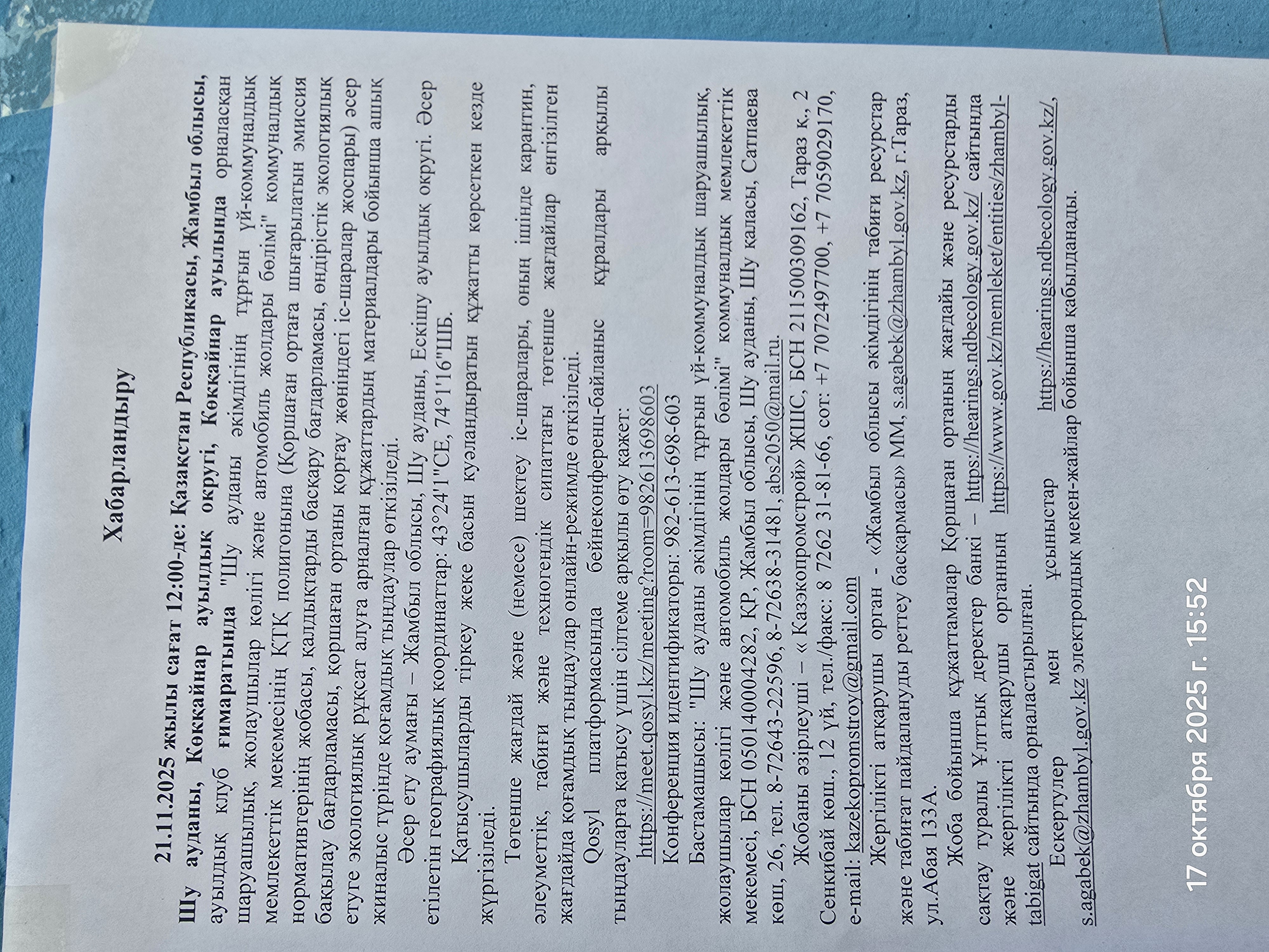 3. Общественные слушания организованны: Управление природных ресурсов и регулирования природопользования Жамбылской области, s.agabek@zhambyl.gov.kz,