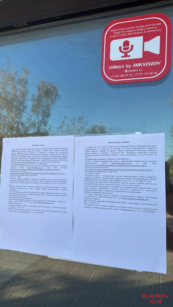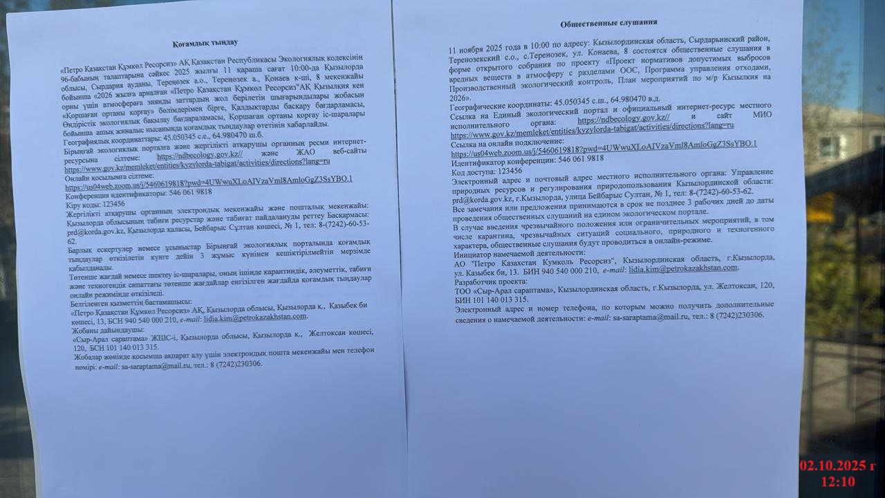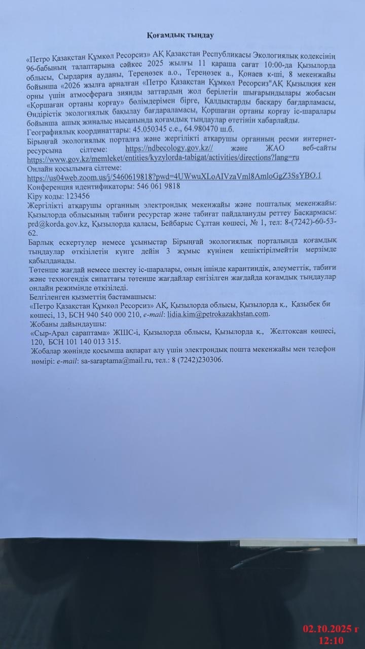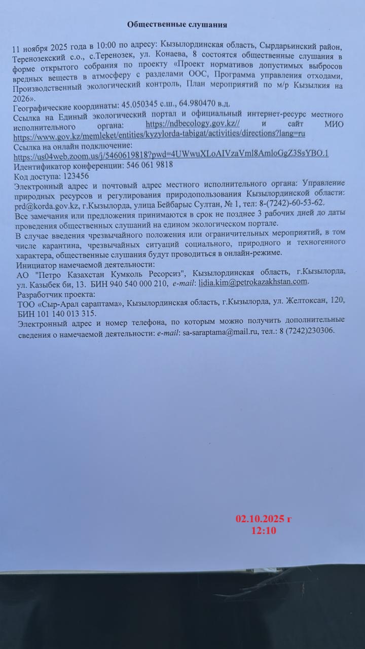 3. Общественные слушания организованны: Управление природных ресурсов и регулирования природопользования Кызылординской области, prd@korda.gov.kz 87242605362, 605369,