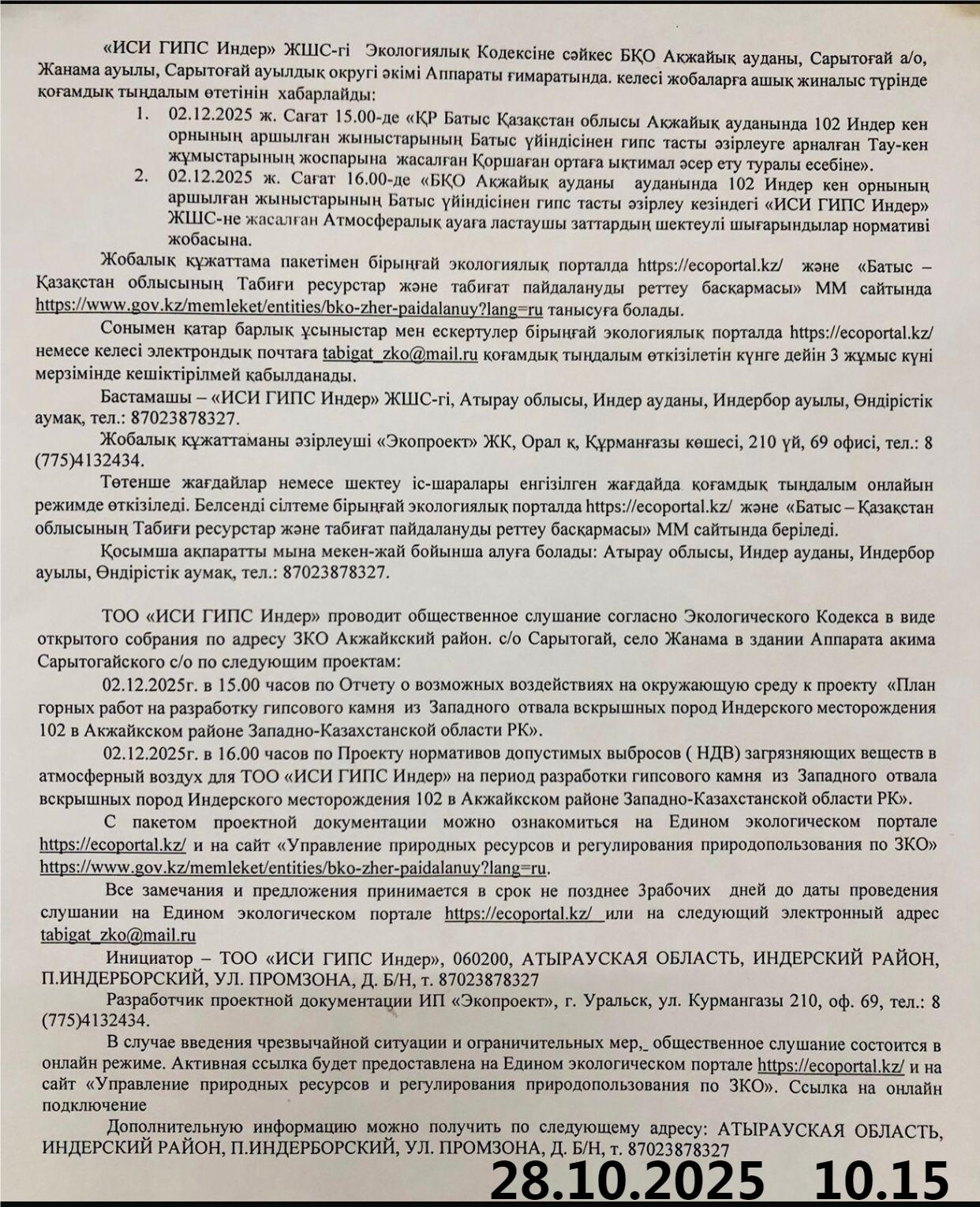 1.4. Описание для подключения к онлайн трансляции при прохождении общественного слушания: Тема: ИСИ ГИПС ИНДЕР - Отчет Время: 20 нояб. 2025 03:00 PM Asia/Oral Подключиться к конференции Zoom https://us05web.zoom.us/j/2416842362?pwd=Ifinb6l0qrXQtJ1FJytZqn60Vtj0NB.1&omn=88195950659 Идентификатор конференции: 241 684 2362 Код доступа: H6C3KA