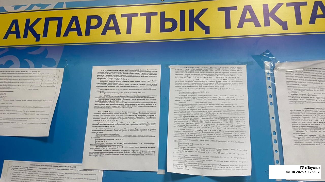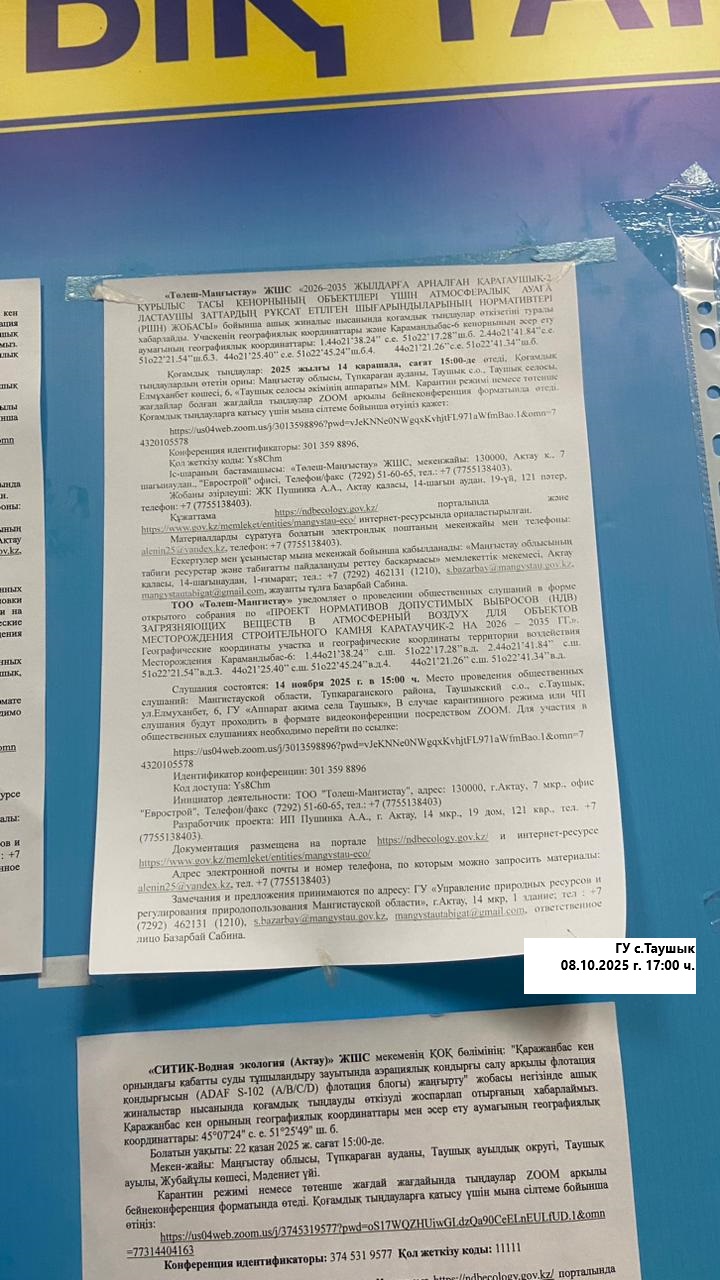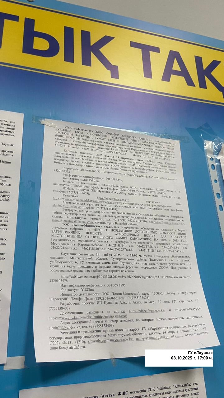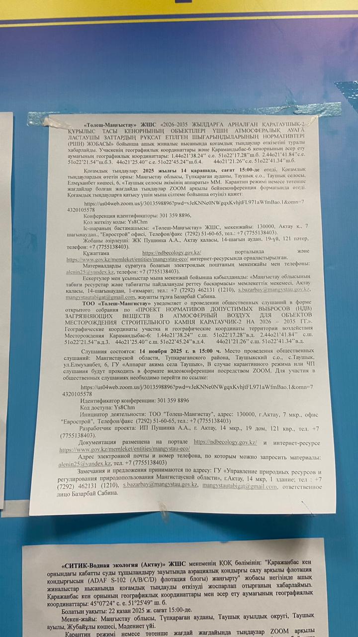 3. Общественные слушания организованны: Управление природных ресурсов и регулирования природопользования Мангистауской области, s.bazarbay@mangystau.gov.kz,