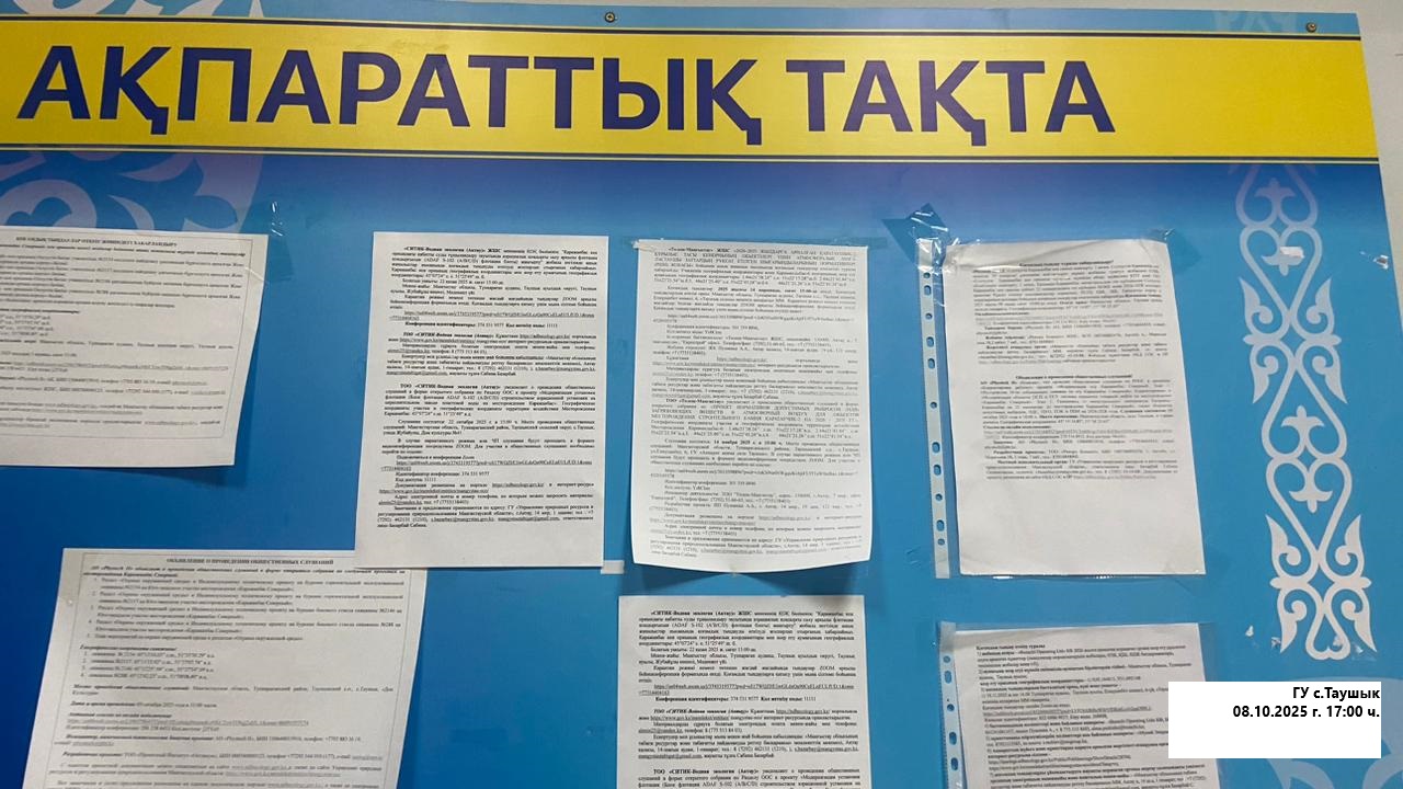 6.3. расположение мест, специально предназначенных для Размещения печатных объявлений (доски объявлений): ГУ «Аппарат акима села Таушык»