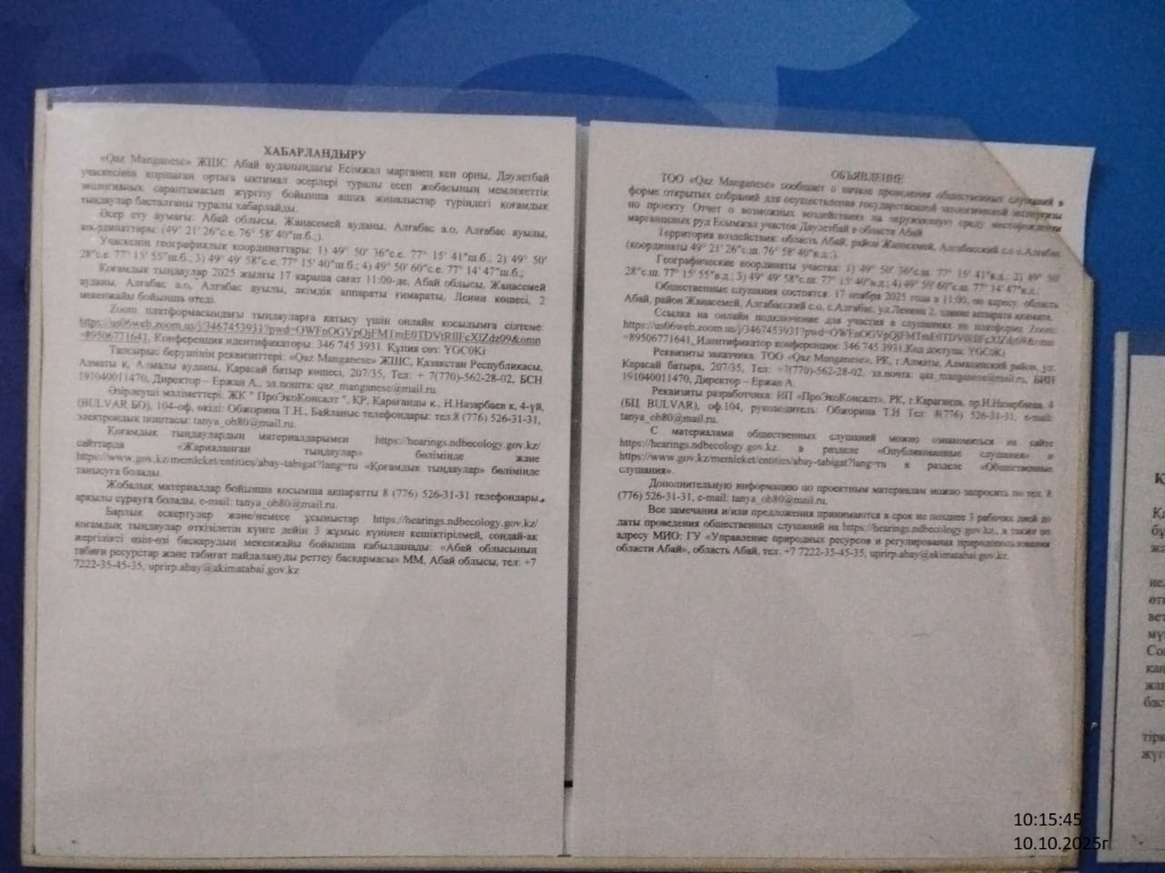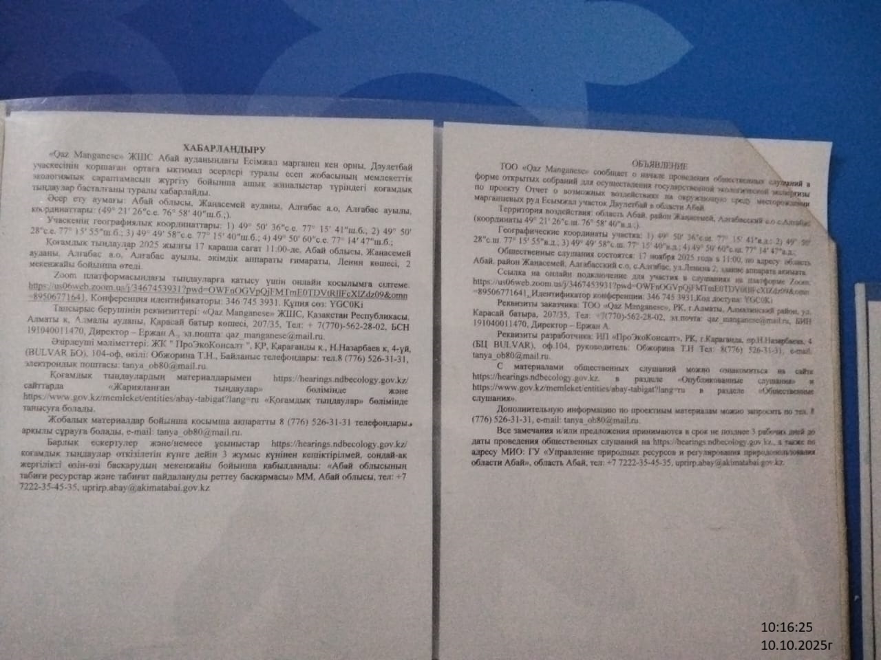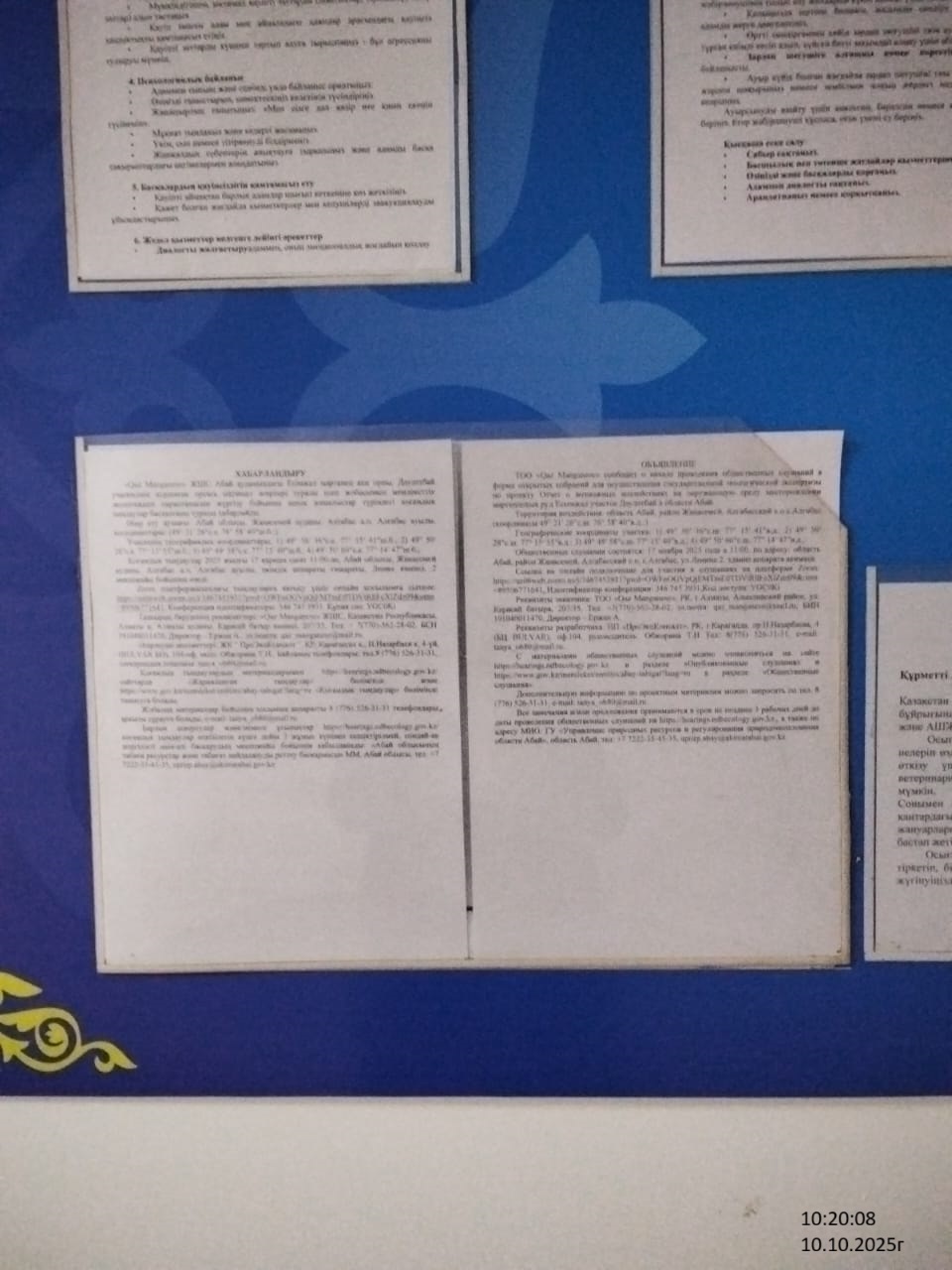 3. Общественные слушания организованны: Главный специалист УПР и ПР область Абай, prirodnyye_resursy_obl.abay@mail.ru,