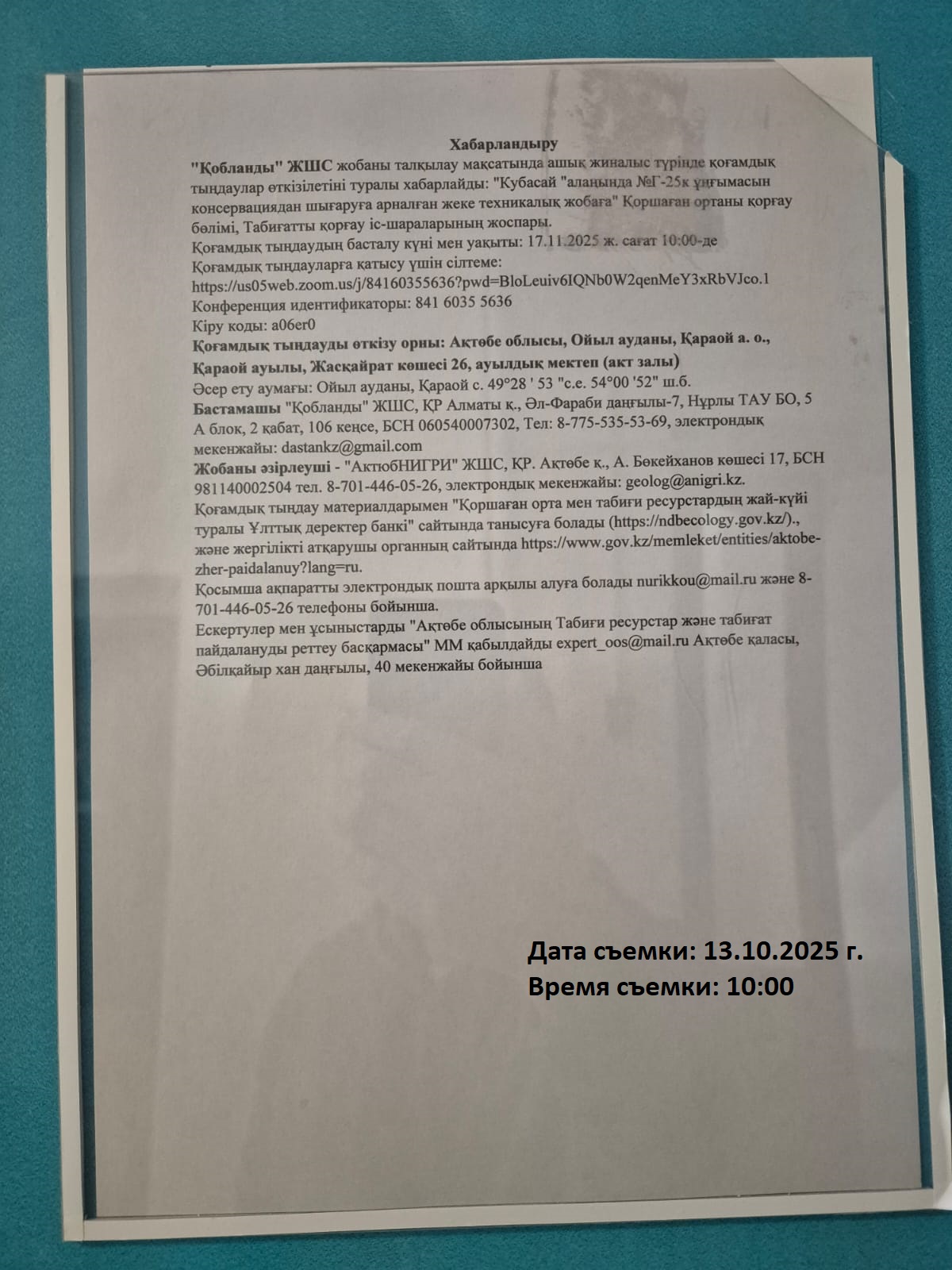 3. Общественные слушания организованны: Управление природных ресурсов и регулирования природопользования Актюбинской области, expert_oos@mail.ru,