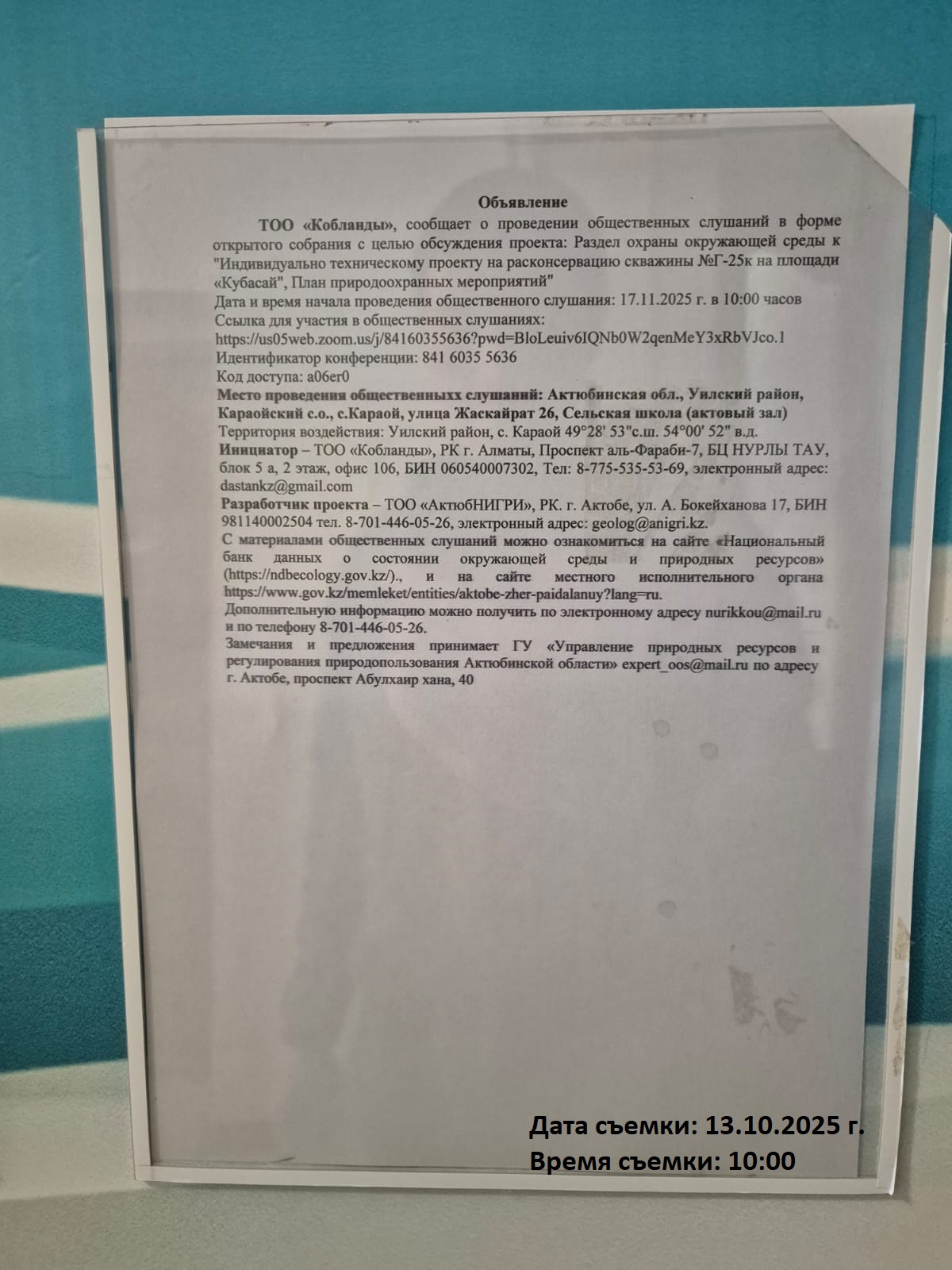 4. Повестка дня общественных слушаний: Компания ТОО «Кобланды» проводит работы на контрактной территории ограниченной границами Геологического отвода, расположенного в пределах блоков XIX-15-В (частично), С (частично), F (частично), 16-А (частично), D (частично), согласно Контракту № 1528 от 15 октября 2004г. До 2008 года на площади Кубасай правом недропользования на разведку углеводородного сырья обладало ТОО «Кен-Ай-Ойл-Кызылорда» (Контракт №1528 от 15 октября 2004г.). В 2008 году «Дополнением № 1 к Контракту №1528 от 15 октября 2004г.» право недропользования передано ТОО «Кобланды» (рег.№2671 от 4 июня 2008 года). В 2010 году между ТОО «Кобланды» и Компетентным органом заключено «Дополнение №2… от 03.03.2010г.» с продлением периода разведки на 2 года до 15.10.2011г. В 2010 году составлено «Дополнение №3… от 15.10.2010г.» в связи с принятием нового Закона РК «О недрах и недропользования» от 24.06.2010г. и согласованием Рабочей программы на период 2010 года с учетом невыполненных контрактных условий в период разведки контракта. В административном плане участок проведения изоляционно-ликвидационных работ месторождение «Кубасай» расположена в Уилском районе Актюбинской области. Местность ровная полупустынная, с резко континентальным климатом. Координаты Горного отвода в Приложении №1. Координаты расконсервируемой скважины Г-25к. Скв. № Г-25к – c.ш. = 49° 30' 56,50" с.ш. 54° 03' 36,99". Ближайшим населенным пунктом к месту работ является поселок Караой, находящийся на расстоянии более 5 км от места скважины № Г-25к. Цель работы – промывка, чистка скважин до подошвы, проведение ГИС и других исследований, охрана недр и окружающей среды, рациональное и комплексное использование недр при расконсервации скважины Г-25к. Данный проект определяет установление порядка и технических требований по проведению восстановительных работ с обеспечением выполнения условий охраны недр и окружающей среды с переводом скважины в состояние, обеспечивающее безопасность жизни и здоровья населения, охрану окружающей природной среды, а также сохранность недр. При производстве работ на рассматриваемой территории основное воздействие на атмосферу будет происходить в процессе работы дизель-генераторных установок. Расконсервация планируется провести с буровой установки ZJ-30 или аналог Ссылка для участия в общественных слушаниях посредством программы ZOOM: https://us05web.zoom.us/j/84160355636?pwd=BloLeuiv6IQNb0W2qenMeY3xRbVJco.1 Идентификатор конференции: 841 6035 5636 Код доступа: a06er0