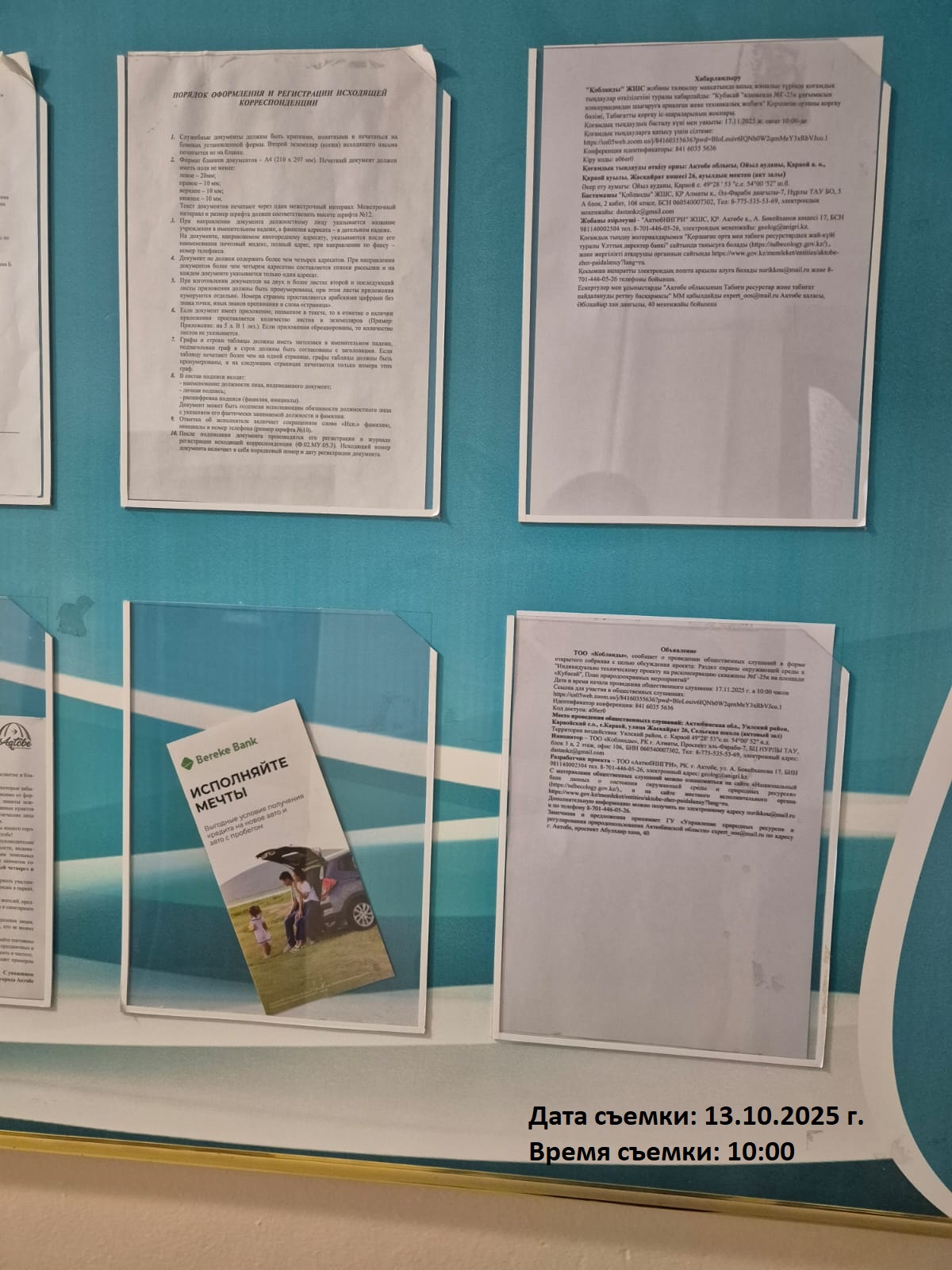 6.3. расположение мест, специально предназначенных для Размещения печатных объявлений (доски объявлений): Актюбинская область, Уилский район, Караойский с.о., с.Караой, улица Жаскайрат 26, Сельская школа (актовый зал)