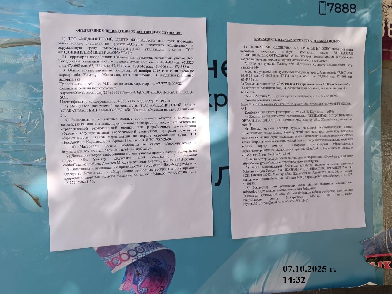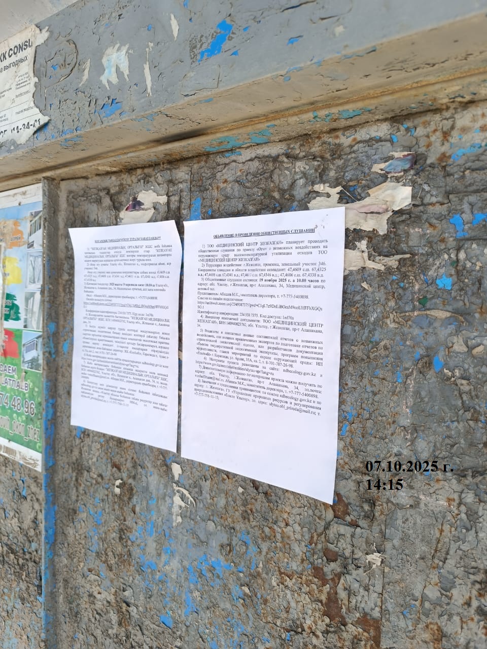 1.4. Описание для подключения к онлайн трансляции при прохождении общественного слушания: в соответствии с пп.4, п.11 прил. 3 Правил, информация о проведении общественных слушаний должна быть распространена на государственном и русском языках на досках объявлений местных исполнительных органов административно-территориальных единиц и в местах, специально предназначенных для размещения объявлений. В связи с чем необходимо дополнительно разместить печатные объявления на досках объявлений в акимате и в местах, специально предназначенных для размещения объявлений.