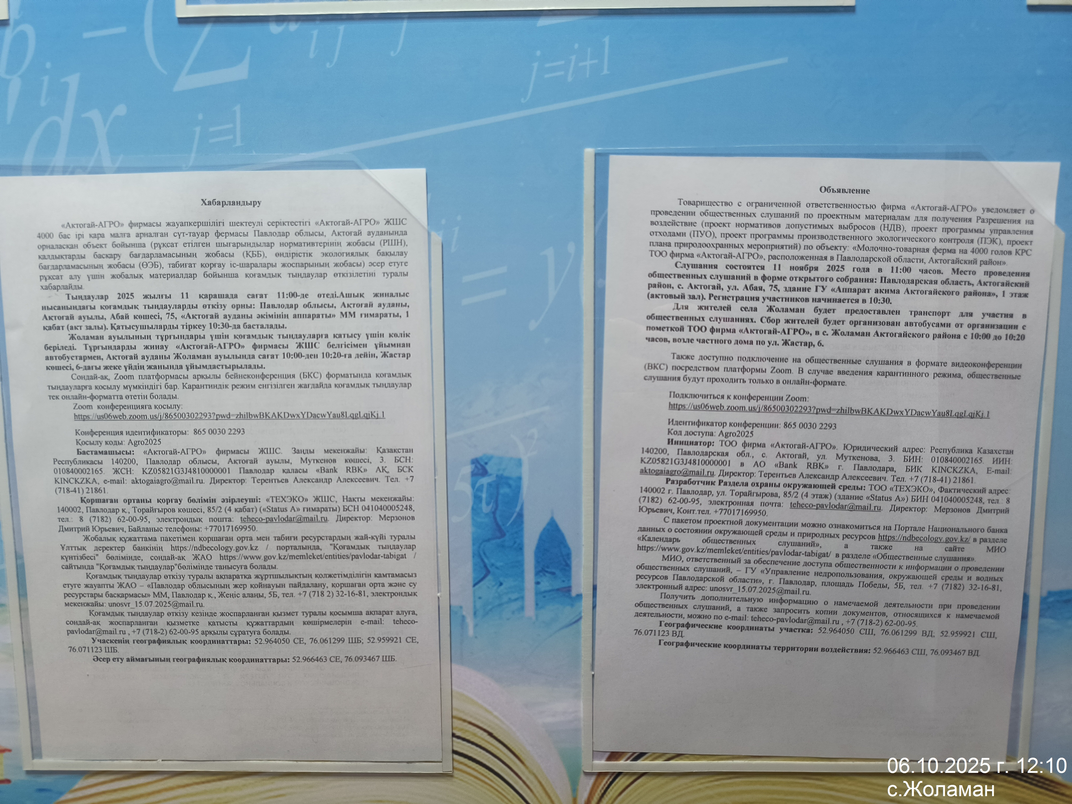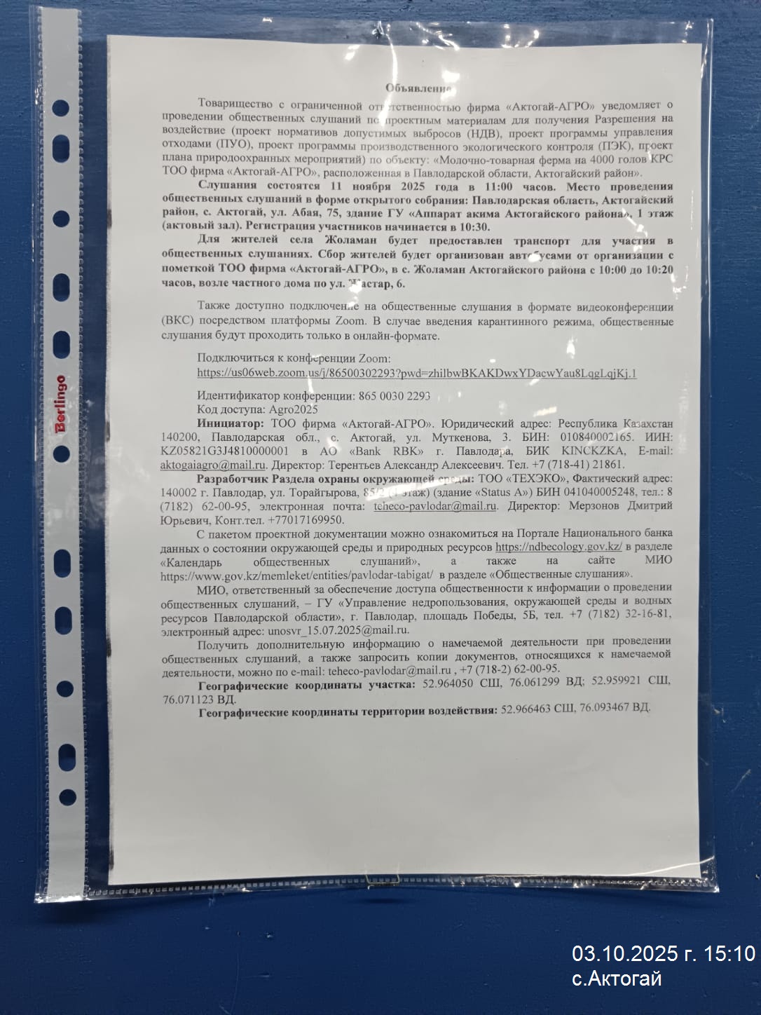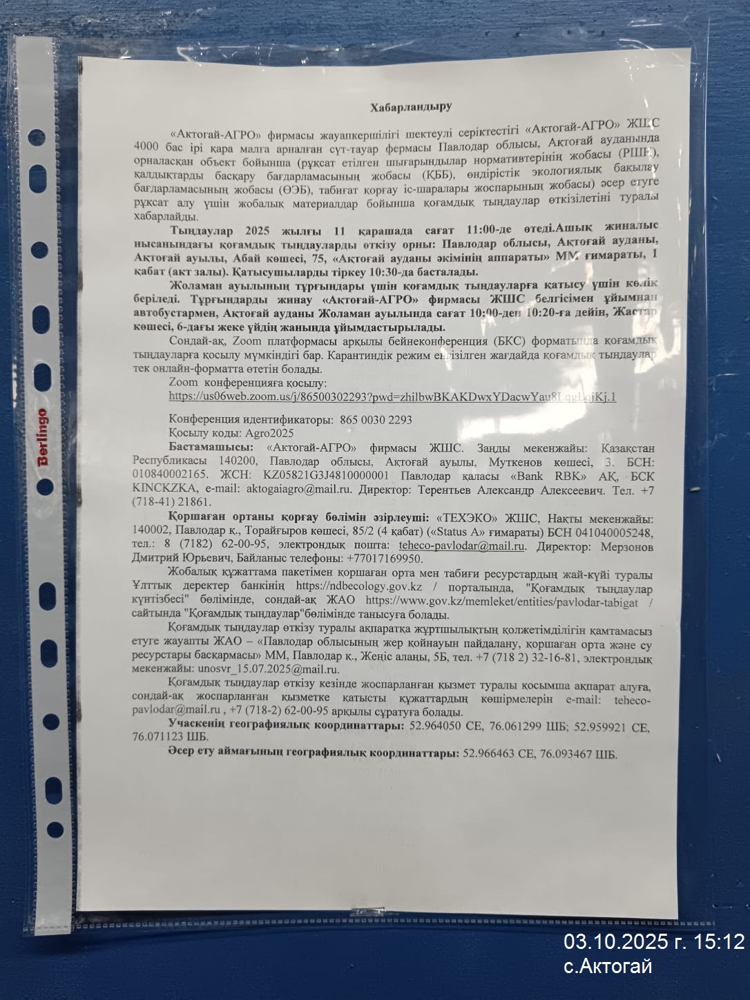 1.4. Описание для подключения к онлайн трансляции при прохождении общественного слушания: https://us06web.zoom.us/j/86500302293?pwd=zhilbwBKAKDwxYDacwYau8LqgLqjKj.1 Идентификатор конференции: 865 0030 2293 Код доступа: Agro2025