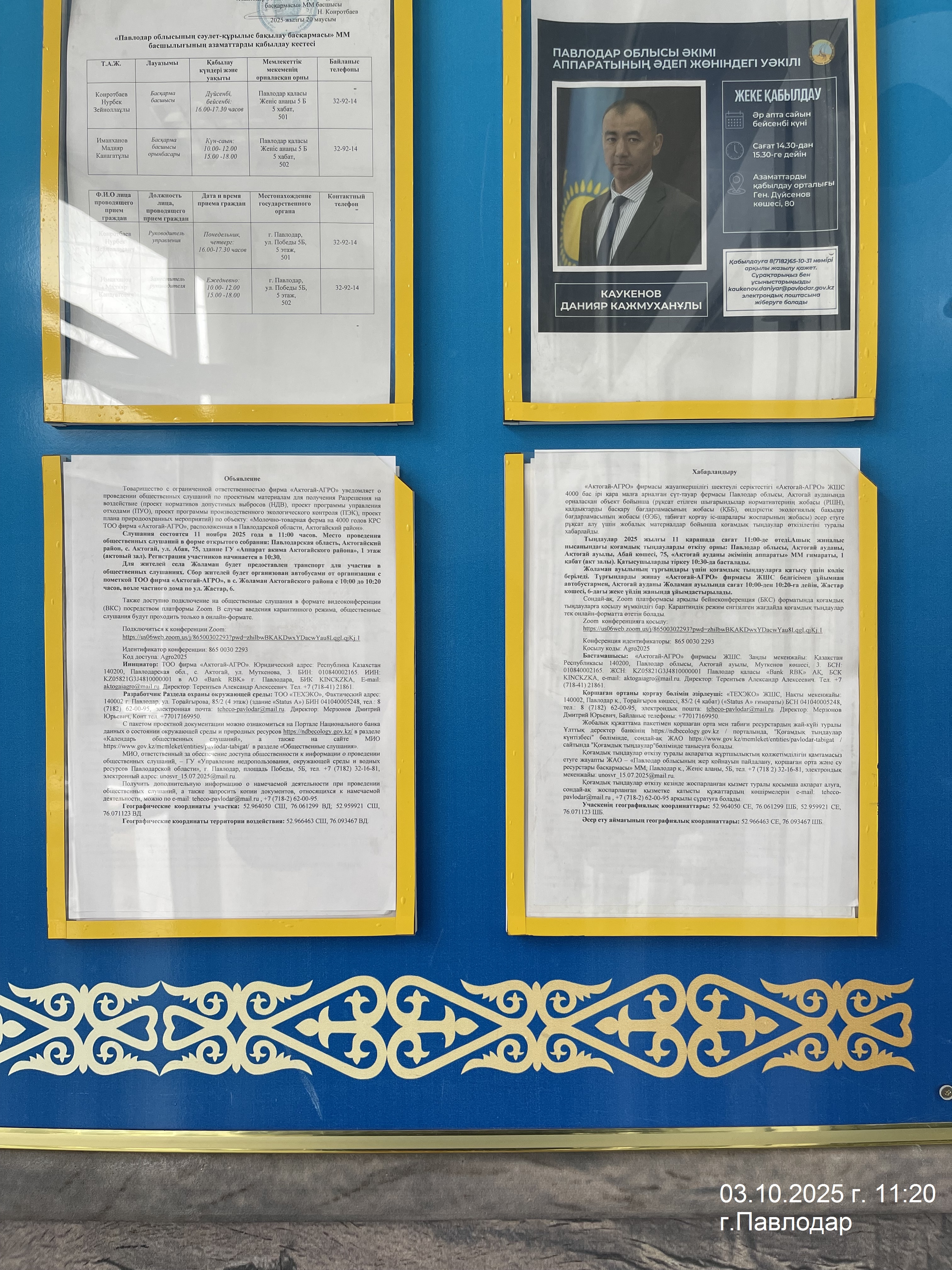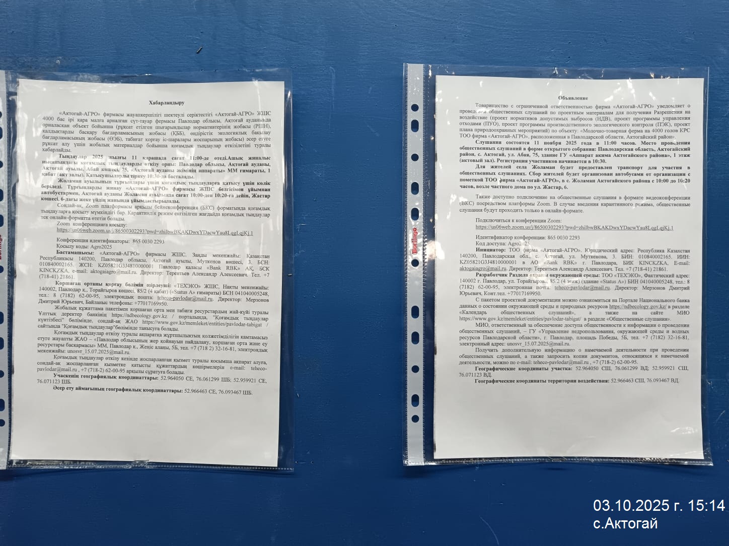 1.2. Место проведения: Павлодарская область, Актогайский район, Актогайский с.о., с.Актогай, ул. Абая, 75, здание ГУ «Аппарат акима Актогайского района», 1 этаж (актовый зал). Регистрация участников начинается в 10:30. Для жителей села Жоламан будет предоставлен транспорт для участия в общественных слушаниях. Сбор жителей будет организован автобусами от организации с пометкой ТОО фирма «Актогай-АГРО», в с. Жоламан Актогайского района с 10:00 до 10:20 часов, возле частного дома по ул. Жастар, 6.