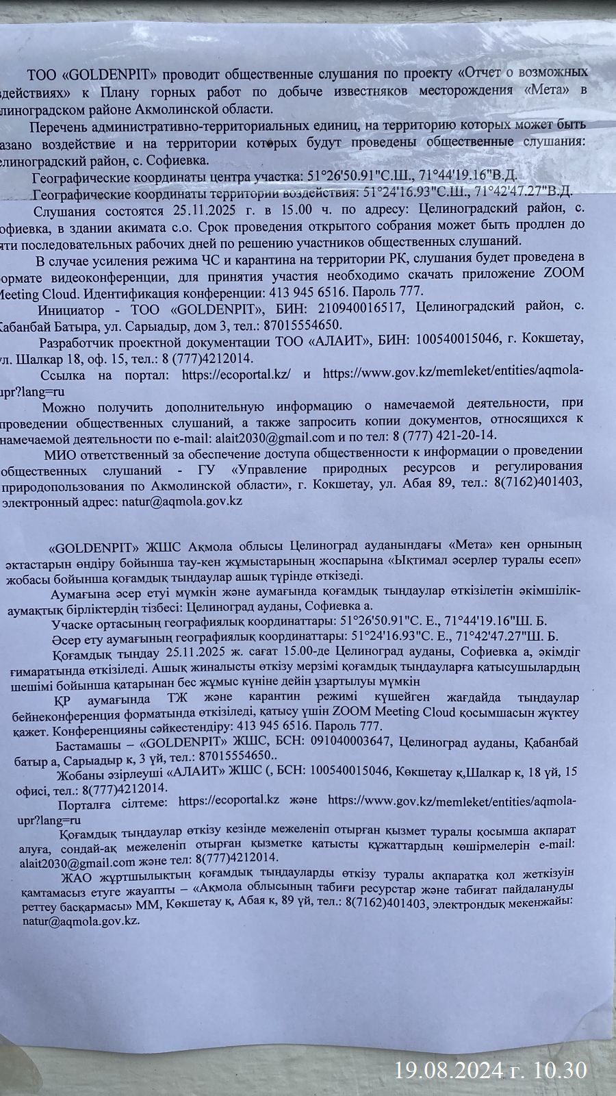 3. Общественные слушания организованны: Управление природных ресурсов и регулирования природопользования Акмолинской области, expeco@mail.ru,