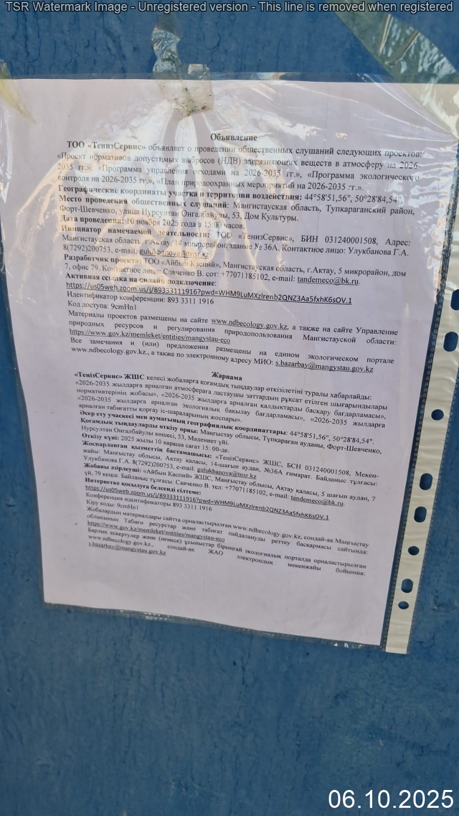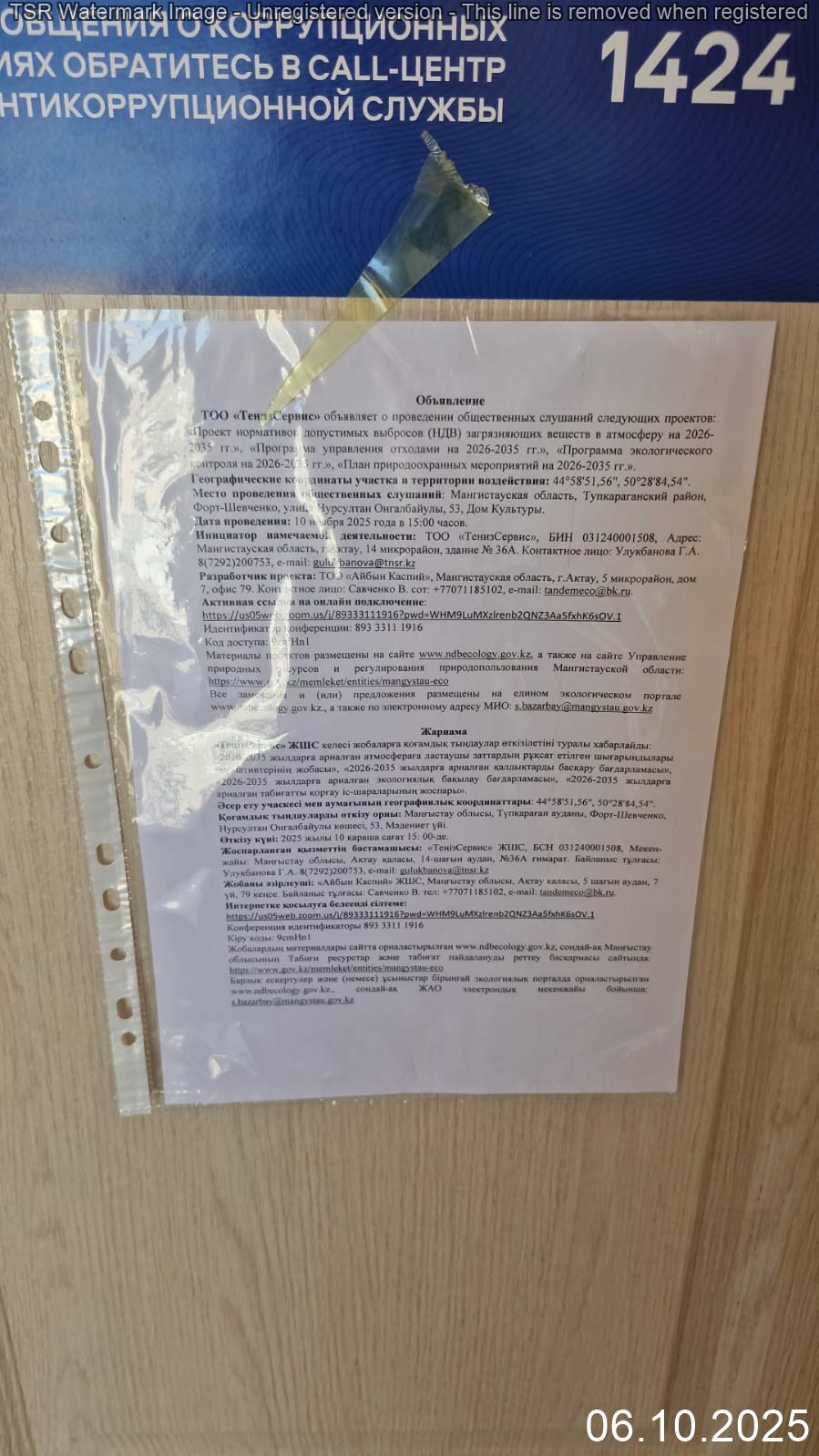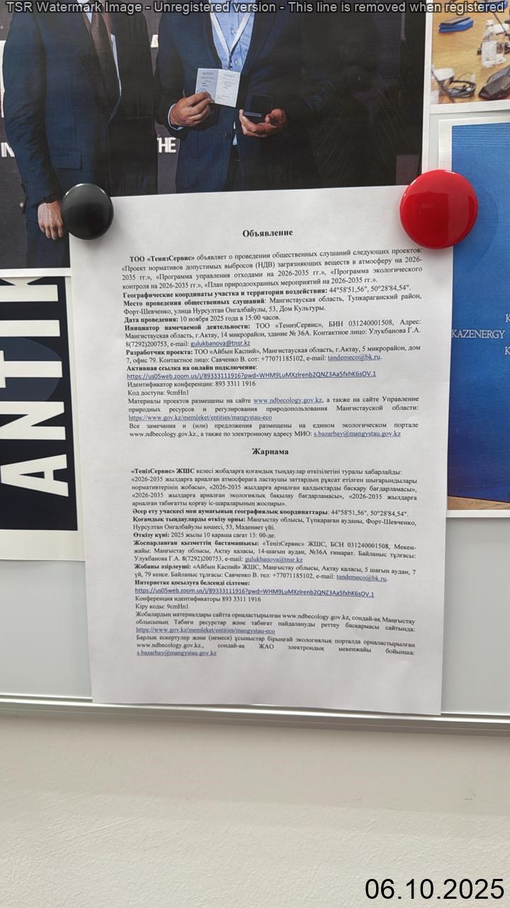 3. Общественные слушания организованны: Управление природных ресурсов и регулирования природопользования Мангистауской области, s.bazarbay@mangystau.gov.kz,