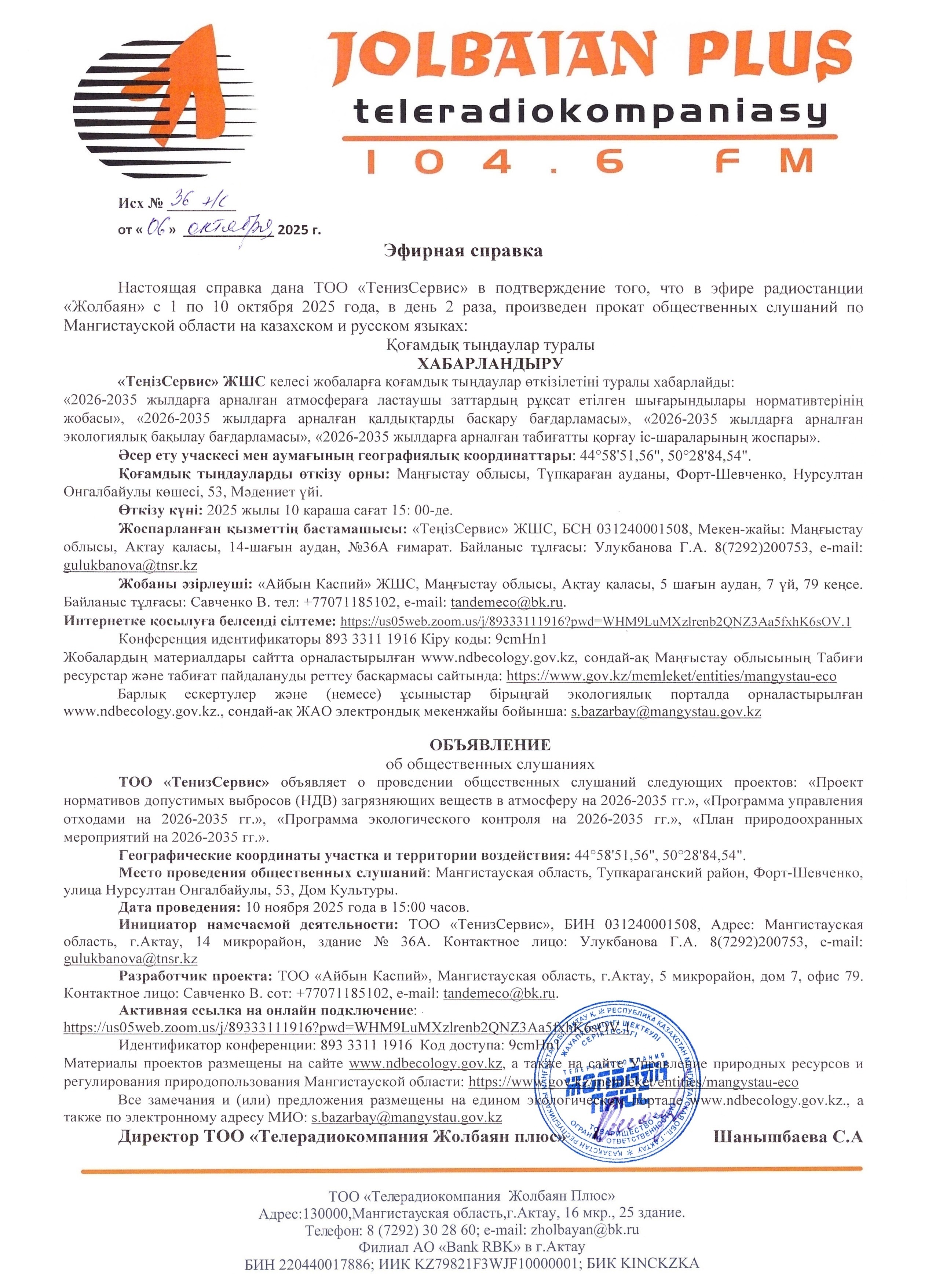 По проекту: ПРОЕКТ НОРМАТИВОВ ДОПУСТИМЫХ ВЫБРОСОВ ЗАГРЯЗНЯЮЩИХ ВЕЩЕСТВ В АТМОСФЕРУ, ПРОГРАММА УПРАВЛЕНИЯ ОТХОДАМИ, Программа экологического контроля, План природоохранных мероприятий для объектов ТОО «ТЕНИЗСЕРВИС» (БПМНО И ПОЛИГОН) НА 2026-2035 Г.Г.