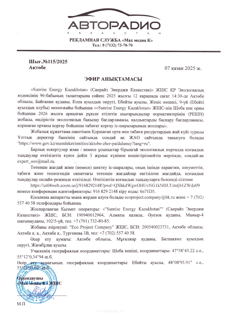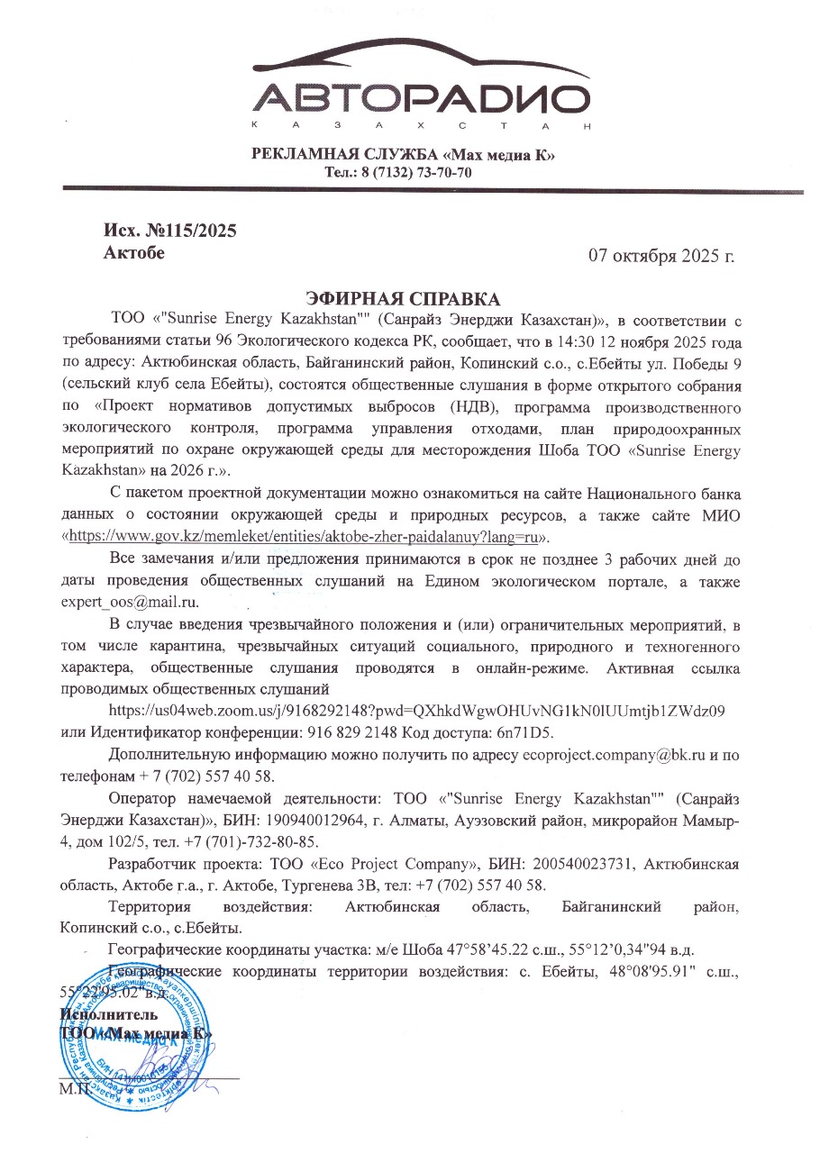 По проекту: Проект нормативов допустимых выбросов (НДВ), программа производственного экологического контроля, программа управления отходами, план природоохранных мероприятий по охране окружающей среды для месторождения Шоба ТОО «Sunrise Energy Kazakhstan» на 2026 г.