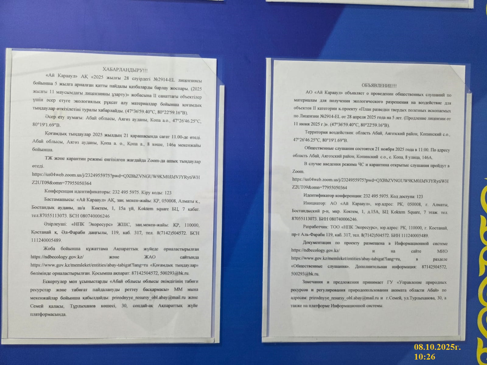 3. Общественные слушания организованны: Главный специалист УПР и ПР область Абай, prirodnyye_resursy_obl.abay@mail.ru,