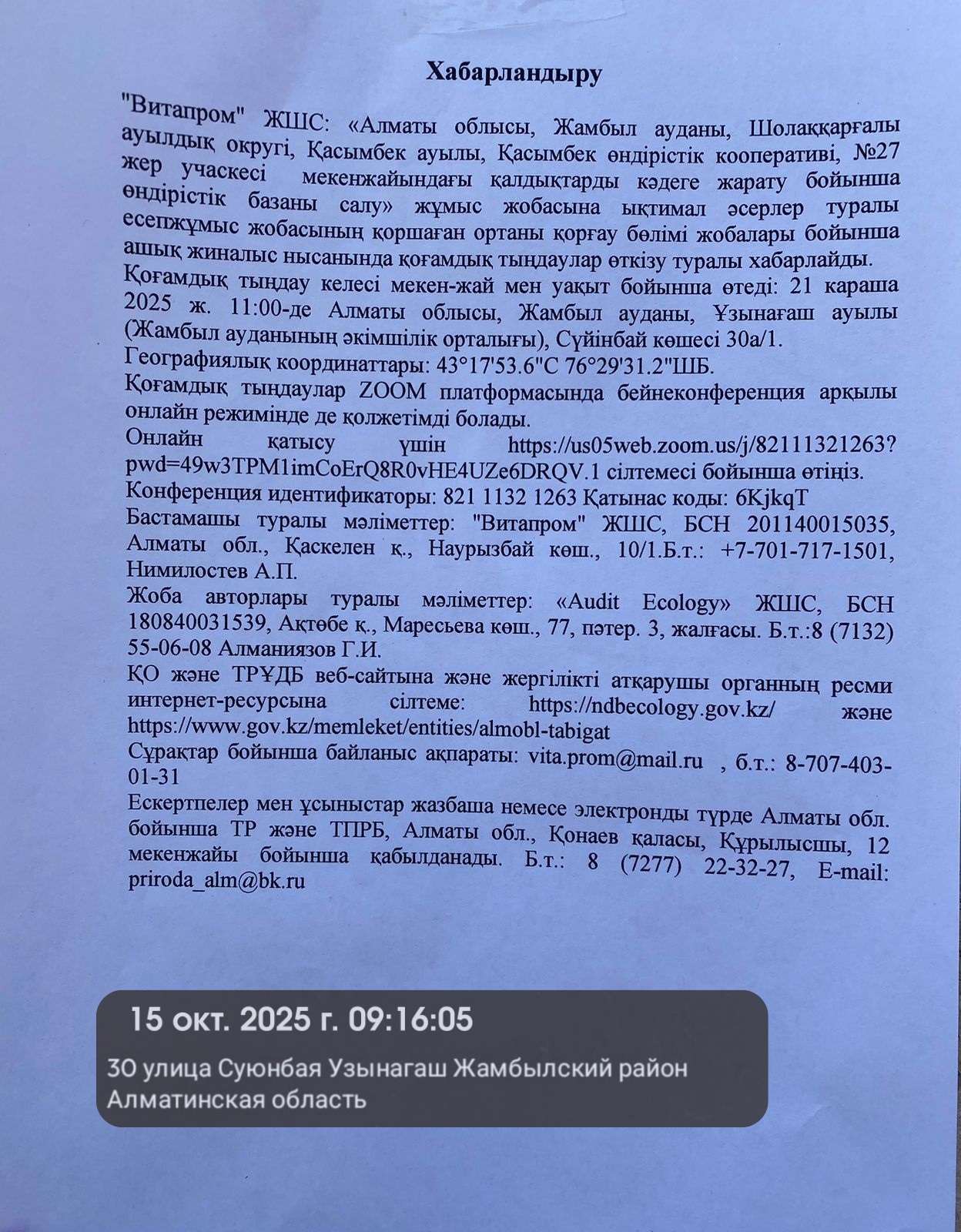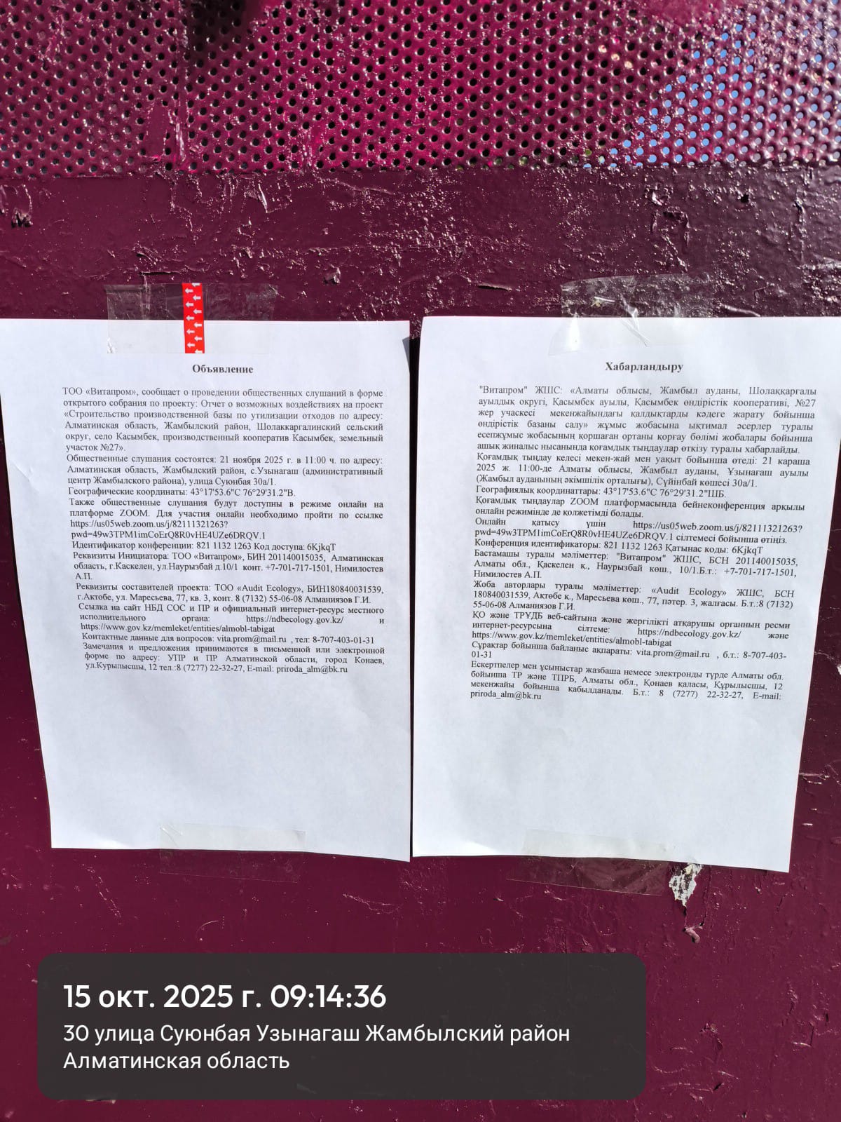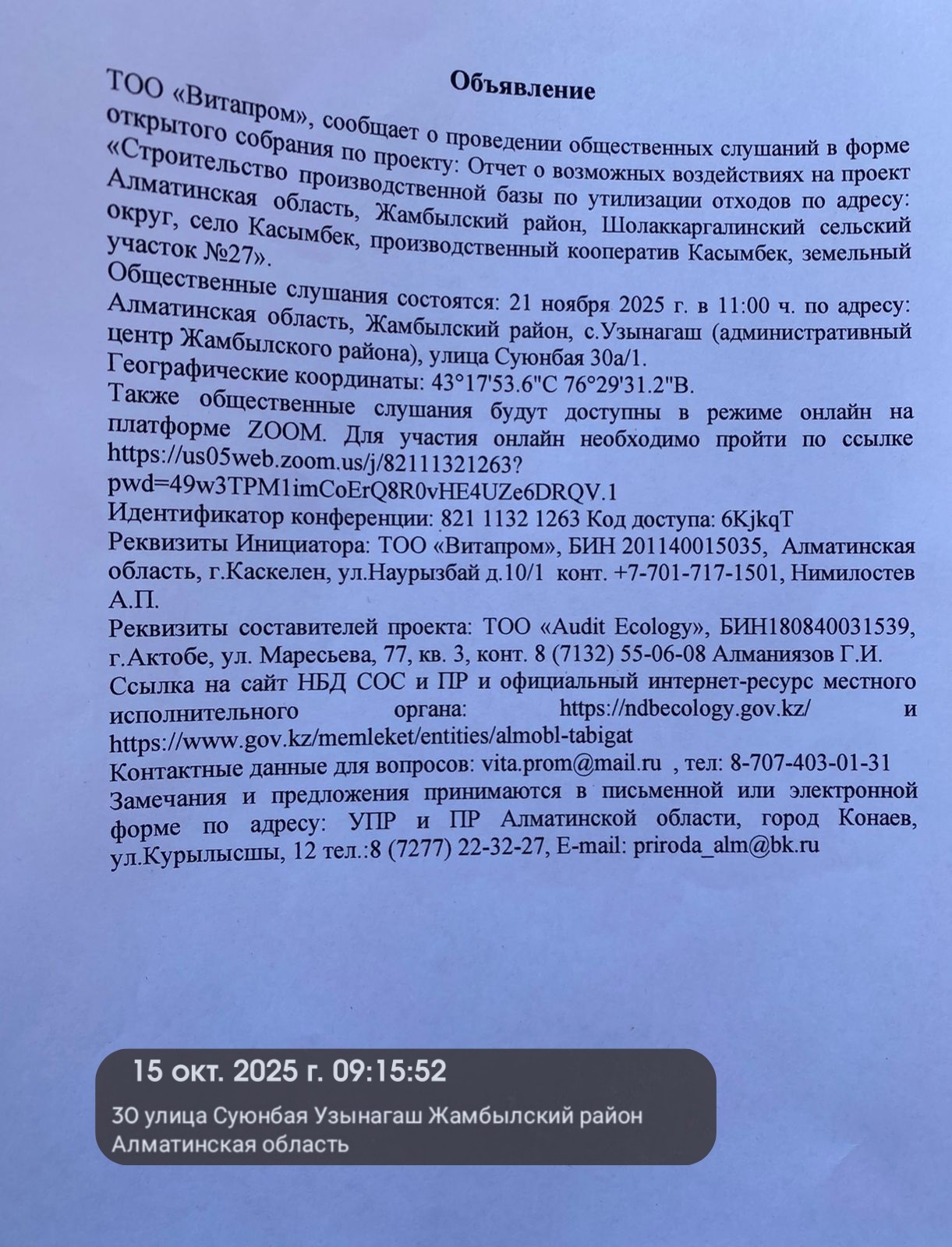 4. Повестка дня общественных слушаний: Краткое нетехническое резюме отчет о возможных воздействиях к «Строительство производственной базы по утилизации отходов по адресу: Алматинская область, Жамбылский район, Шолаккаргалинский сельский округ, село Касымбек, производственный кооператив Касымбек, земельный участок №27» 1. Описание предполагаемого места осуществления намечаемой деятельности, план с изображением его границ Основная деятельность ТОО «Вита Пром» - прием, сортировка, переработка, удаление и утилизация опасных и неопасных отходов. Производственная база по приему, переработке и утилизации опасных и неопасных отходов расположен по адресу: Алматинская область, Жамбылский район, Шолаккаргалинский сельский округ, село Касымбек, производственный кооператив Касымбек, земельный участок №27. Компания оказывает услуги по обращению с отходами уже более 5-и лет и имеет действующую лицензию на утилизацию отходов Данным проектом предусмотрено строительство и эксплуатация новой производственной базы и установка нового оборудования по обращению с отходами. С северо-восточной стороны от производственной базы на расстоянии 647 м располагается территория планируемого кирпичного завода, далее на расстоянии 1495 м располагаются Турарские дачи. С южной стороны на расстоянии 1229 м от производственной базы расположена СТО для грузовой техники. Режим работы – непрерывный, 365 дней в году (2 смены). Координаты - 43°17'53.6"N 76°29'31.2"E. 2. Описание затрагиваемой территории с указанием численности ее населения, участков, на которых могут быть обнаружены выбросы, сбросы и иные негативные воздействия намечаемой деятельности на окружающую среду, с учетом их характеристик и способности переноса в окружающую среду; участков извлечения природных ресурсов и захоронения отходов Ближайшая жила зона – п. Мынбаево с юго-западной и западной стороны от производственной базы на расстоянии 2800 м. Санитарно-защитная зона предприятия составляет 500 м от границы территории. Концентрация загрязняющих веществ, согласно проведенным расчетам рассеивания составляет менее 1 ПДК на границе СЗЗ, что подтверждает, что влияние на население производиться не будет. 3. Наименование инициатора намечаемой деятельности, его контактные данные ТОО «Вита Пром» Алматинская область, Карасайский район, г. Каскелен, ул. Наурызбай, д. 10/1. Телефон +7 701 71 71 501 4. Краткое описание намечаемой деятельности: 4.1. Вид деятельности. Прием, временное хранение (не более 6 месяцев), сортировка и переработка отходов. 4.2. Объект, необходимый для ее осуществления, его мощность, габариты (площадь занимаемых земель, высота), производительность, физические и технические характеристики, влияющие на воздействия на окружающую среду Земельный участок располагается в Алматинской области, Жамбылский район. Акт на землю №2025-3922737 от 06.03.2025 г. Кадастровый номер 03:045:093:2131. Вид право на земельный участок: частная собственность. Площадь земельного участка составляет 0,5 га. Категория земель: земли промышленности, транспорта, связи, для нужд космической деятельности, обороны, национальной безопасности, зоны ядерной безопасности и иного несельскохозяйственного назначения. Целевое назначение: для строительства и эксплуатации полигона по захоронению и утилизации опасных и неопасных отходов. Ограничений в использов