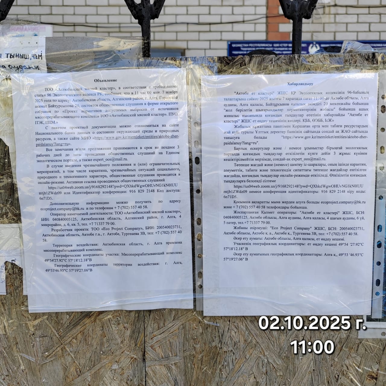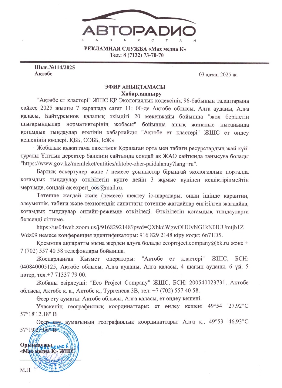 4. Повестка дня общественных слушаний: Мясоперерабатвающий комплекс расположен в Алгинском районе, г. Алга. С северной, северо-западной и северо-восточной стороны на расстоянии 630 и 660 от территории предприятия расположены территории животноводдческого комплекса ТОО «Актеп». С юго-восточной стороны от территории предприятия на расстоянии 1140 м располагается территории ТОО «АкРоссПищепром», также на расстоянии 1470 м от территории предприятия расположена жилая зона. По остальным сторонам света пустырь. Проект нормативов предельно-допустимых выбросов выполнен ТОО «Eco Project Company» В данной работе рассчитаны нормативы предельно-допустимых выбросов загрязняющих веществ (ПДВ) от источников мясоперерабатывающего комплекса ТОО «Актюбинский мясной кластер». Проект выполнен в соответствии с требованиями экологического кодекса РК от 2 января 2021 года, законами и нормативными актами по охране окружающей среды, действующими в РК на момент разработки настоящего проекта. Инициатором (Заказчиком) разработки настоящего проекта является ТОО «Актюбинский мясной кластер». Целью разработки данного проекта является введение в эксплуатацию нового мясоперерабатывающего комплекса. Также ранее в проекте «Оценка воздействия на окружающую среду» не были учтены следующие источники: завальная яма для барды с приямком для нории, пневмотранспорт корма, охладительная колонка, лаборатория На основании представленных проектных данных были выявлены стационарные источники выбросов, рассчитаны выбросы. Всего настоящим проектом определено 5 стационарных источника выбросов загрязняющих веществ, в том числе, 4 неорганизованных и 5 организованных. Основными источниками выбросов загрязняющих веществ в атмосферу являются: • Отопительный котел Buran Cronos • Отопительный котел Buran Cronos(Резервный) • ГРПШ • Загон на 100 голов скота • Навозохранилище • Пневмотранспорт корма • Охладительная колонка • Лаборатория • Завальная яма для барды с приямком для нории Суммарно в год от 9-ми стационарных источников в атмосферу выбрасываются загрязняющие вещества 23-х наименований: основная часть из них, 21 загрязняющее вещество – газообразные, жидкие и 2 загрязняющих вещества – твердые. Активная ссылка проводимых общественных слушаний https://us04web.zoom.us/j/9168292148?pwd=QXhkdWgwOHUvNG1kN0lUUmtjb1ZWdz09 или Идентификатор конференции: 916 829 2148 Код доступа: 6n71D5.