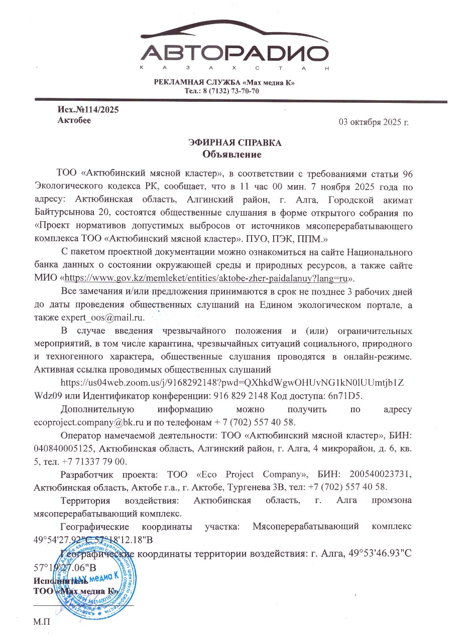 По проекту: «Проект нормативов допустимых выбросов от источников мясоперерабатывающего комплекса ТОО «Актюбинский мясной кластер». ПУО, ПЭК, ППМ.»
