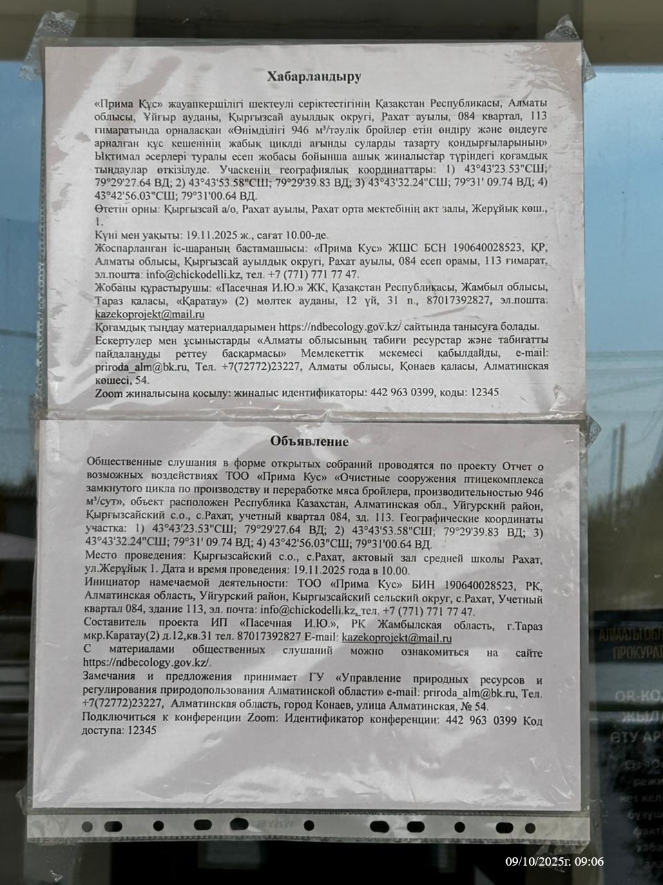 4. Повестка дня общественных слушаний: Отчет о возможных воздействиях рассматривает комплекс очистных сооружений предназначенный для осуществления механической, биологической и, при необходимости, физико-химической стадии очистки хозяйственно-бытовых и производственных сточных вод до нормативных показателей, с последующим отведением очищенных стоков в пруд накопитель (в зимний период) и в мелиорационный канал (в вегетационный период) от птицекомплекса ТОО «Прима Кус». В соответствии с проектным решением, после очистки сточные воды будут направляться в пруд-накопитель в зимний период с расчетным объемом загрязняющих веществ в количестве - 369,0103 тонн/год, а в вегетационный период — в мелиорационный канал в количестве - 46,9379 тонн/год, что позволяет снизить нагрузку на окружающую среду и повысить экологическую безопасность деятельности предприятия. Производительность комплекса очистных сооружений составляет 946м³/сут (0.946 тыс.м³/сут). Вид намечаемой хозяйственной комплекс очистных сооружений для ТОО «Прима Кус» относится к объектам I категории согласно п.7.10. раздела 1 приложения 2 Экологического кодекса Республики Казахстан от 02.01.2021 года №400-VI, комплексы очистных сооружений сточных вод, сбрасываемых объектами I категории, кроме очистки коммунальных стоков. ТОО «Прима Кус» является одним из ведущих производителей продукции из мяса птицы в Казахстане. Так же более 53% продукции экспортируется в Россию, Узбекистан, Кыргызстан. Производственный комплекс ТОО «Прима Кус» включает в себя: инкубатор, площадки откорма бройлеров напольного содержания, завод по убою, мясопереработке и производству колбасных изделий, цех по утилизации и переработке боенских отходов, очистные сооружения, склад подстилочного материала, пометохранилище, площадка скважин артезианской воды, завод по производству комбикормов. Производственная мощность птицекомплекса замкнутого цикла по производству и переработке мяса бройлера составляет 46 000 голов/смену, 13 800 060 голов/год, при среднем весе одной тушки -2,6 кг, производственная мощность составляет 1 435,200 т/сутки, 38640,168 т/год. На территории птицекомплекса по выращиванию и переработке мяса бройлера имеется 4 площадки, каждая площадка включает в себя 12 птичников, один санпропускник с отдельно стоящим дезбарьером. Общее количество птичников – 48 штук. Технологическая оборачиваемость каждого птичника – 7 раз в год. Общее количество откармливаемых бройлеров на каждой площадке 4,032 млн голов в год. В административном отношении объект расположен Республика Казахстан, Алматинская обл., Уйгурский район, Қырғызсайский сельский округ, с.Рахат, учетный квартал 084, зд. 113. Очистные сооружения птицекомплекса замкнутого цикла по производству и переработке мяса бройлера расположены непосредственно в границах основной производственной площадки ТОО «Прима Кус». Кадастровый номер участка: 03-052-084-113. Площадь территории Птицекомплекса составляет 537,0 гектар, в том числе площадь площадки биологической очистки стоков составляет 1,54 гектара. Координаты угловых точек: 1. 43°43'23.53"СШ; 79°29'27.64 ВД; 2. 43°43'53.58"СШ; 79°29'39.83 ВД; 3. 43°43'32.24"СШ; 79°31' 09.74 ВД; 4. 43°42'56.03"СШ; 79°31'00.64 ВД. Ближайшая жилая застройка расположено в северо-западном направлении с.Рахат на расстоянии 1.5км, в том же направлении расположено с.Ташкарасу на расстоянии 4.3км, в южном нап