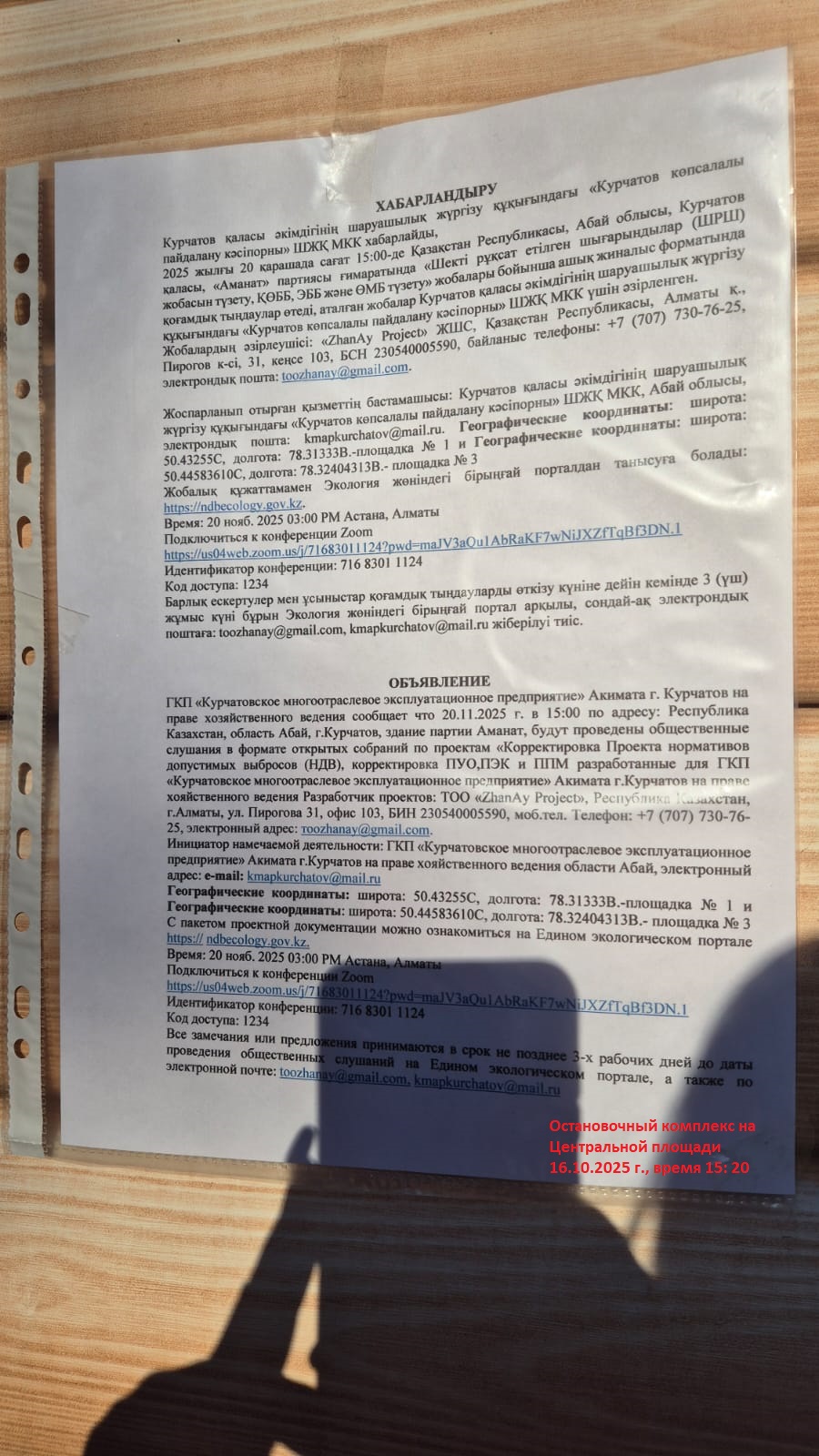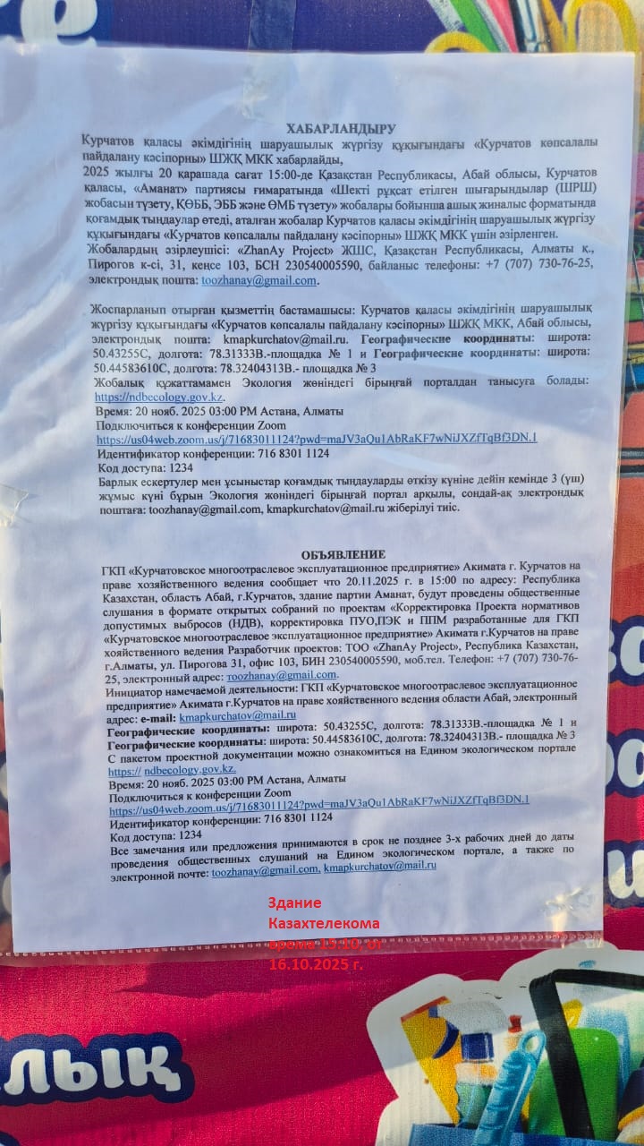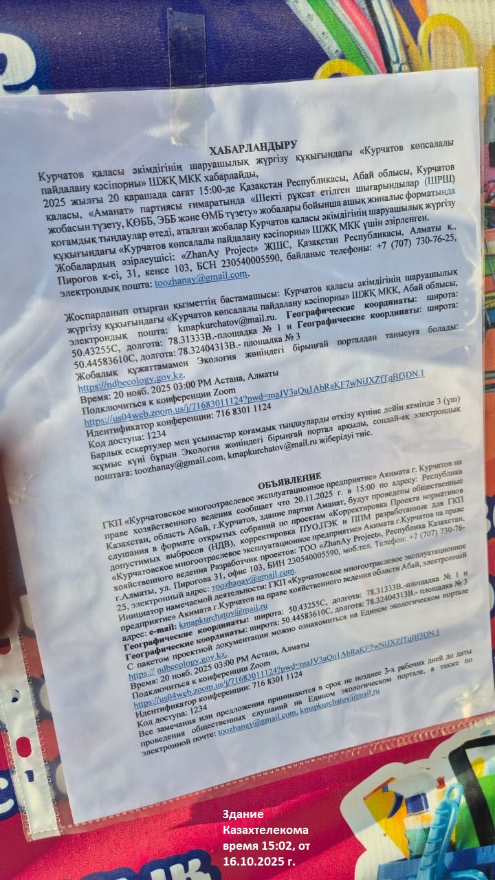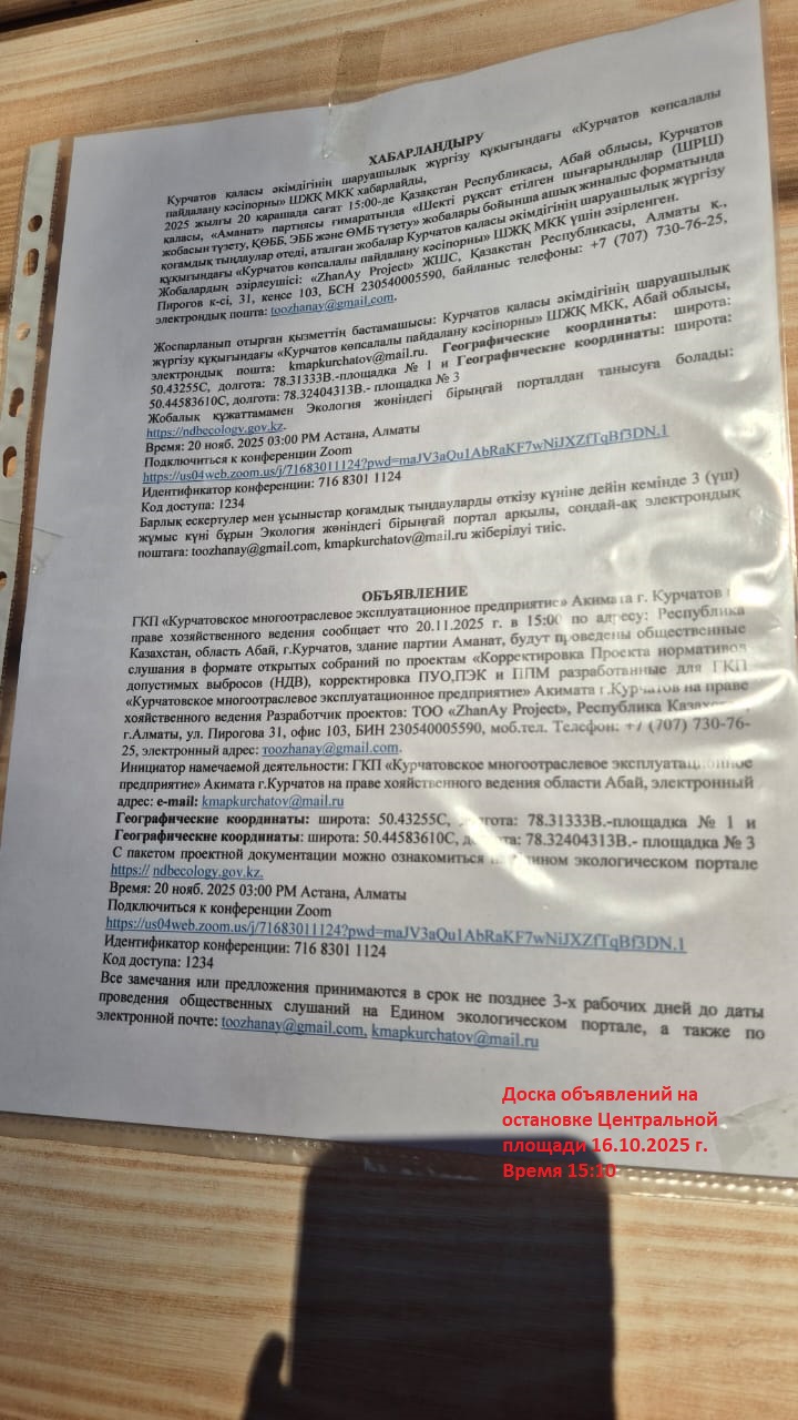 3. Общественные слушания организованны: Главный специалист УПР и ПР область Абай, prirodnyye_resursy_obl.abay@mail.ru,