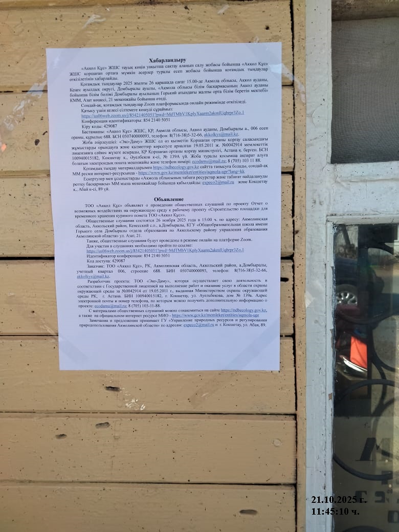 3. Общественные слушания организованны: Управление природных ресурсов и регулирования природопользования Акмолинской области, expeco@mail.ru,