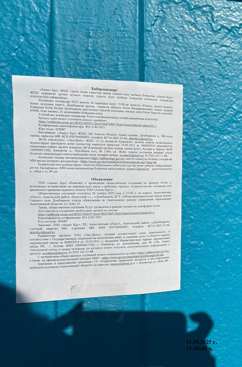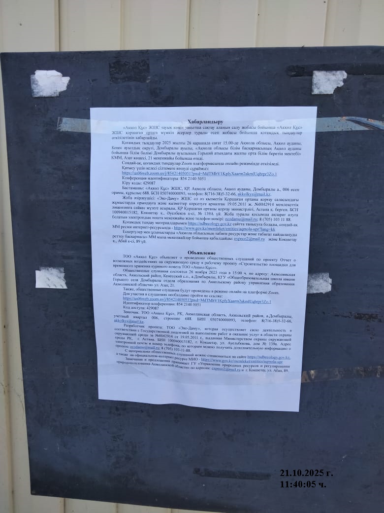 4. Повестка дня общественных слушаний: ТОО «Ақкөл Құс» действующее предприятие которая реализует яйца качественной племенной сельскохозяйственной птицы кур яичных кроссов оптом и в розницу. Птицефабрика мощностью 90млн. штук в год, а также дополнительной продукции – 300 тонн куриного мяса в год. Птицефабрика рассчитана на содержание кур-несушек поголовье 237500 голов, поголовье ремонтного молодняка 142 500 голов. ТОО «Ақкөл Құс» планирует строительство новой площадки временного хранения и переработки куриного помета в удобрение, образующиеся от птицефабрики предприятия. Новая площадка временного хранения и переработки куриного помета является производственным подразделением, которое располагается по адресу: Акмолинская область, Аккольский район, Кенеский сельский округ, село Домбыралы. Отведенная территория под объекты площадки, составляет – 10.0 га. Обоснование выбора места: акт на земельный участок за № 2025-3999083 от 19 марта 2025 года. Режим эксплуатации площадки круглогодичный. Планируемое строительство вызвано потребностью птицефабрики во временном хранении куриного помета, образующегося в процессе жизнедеятельности кур-несушек при производстве товарного яйца. В процессе временного хранения помета будет осуществляться производство ценнейшего естественного органического удобрения, которое будет реализовываться предприятиям сельскохозяйственного направления. СМР. В процессе строительства будут проведены следующие виды работ: снятие ПРС, планировка территории, выемочно-погрузочные работы, устройство грунтового покрытия, устройство песчаного покрытия, устройство щебеночного покрытия, строительство КПП. Эксплуатация. На площадке временного хранения помета будут выполняться следующие виды работ: прием, складирование, изоляция помета, вывоз органического удобрения. На территории площадки будут приниматься только твердые фракции помета, где их будут складировать в бурты шириной – 6,27 м, высотой – 2,1 м, длинной – 71 м. всего рабочих карт будет -13. Объем складирование одной карты – 750 м3, средняя продолжительность складирования – 6 дней.