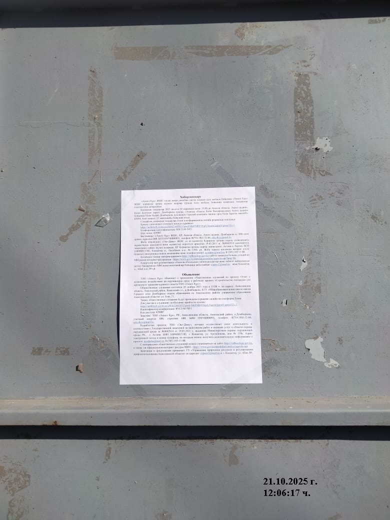 6. Объявление о проведении общественных слушаний на казахском и русском языках будет распространено следующими способами: