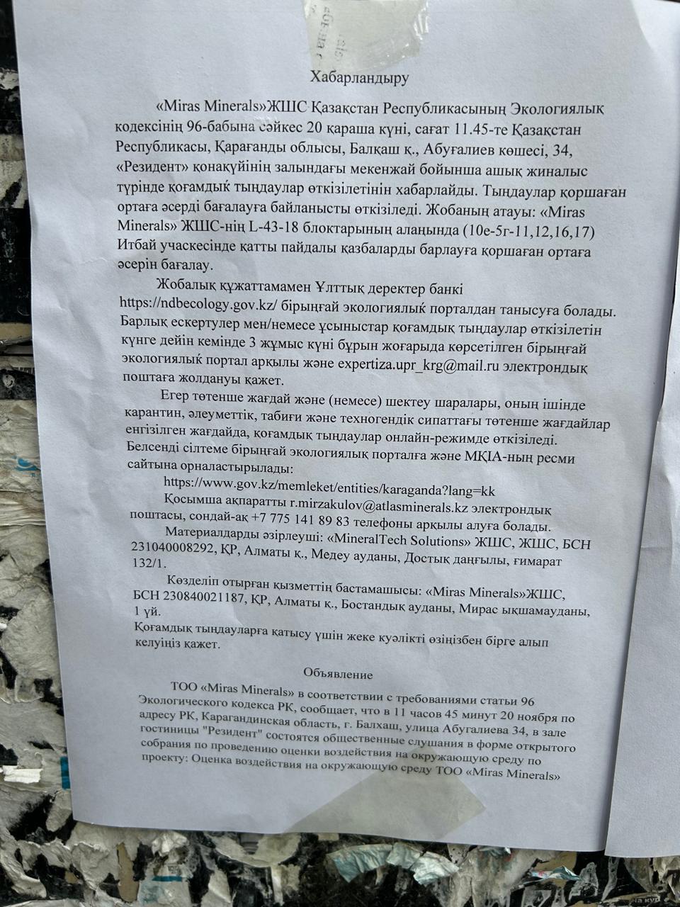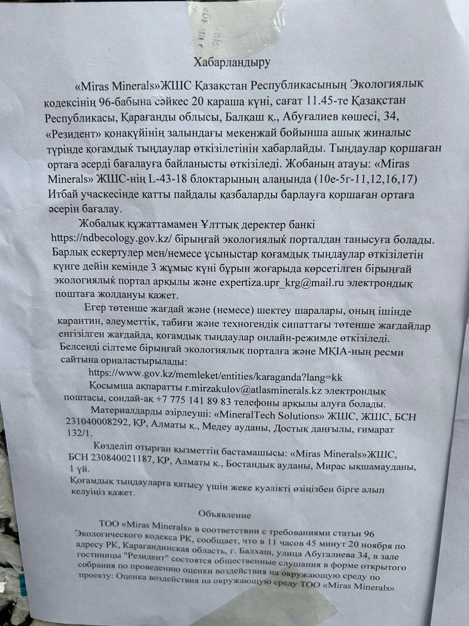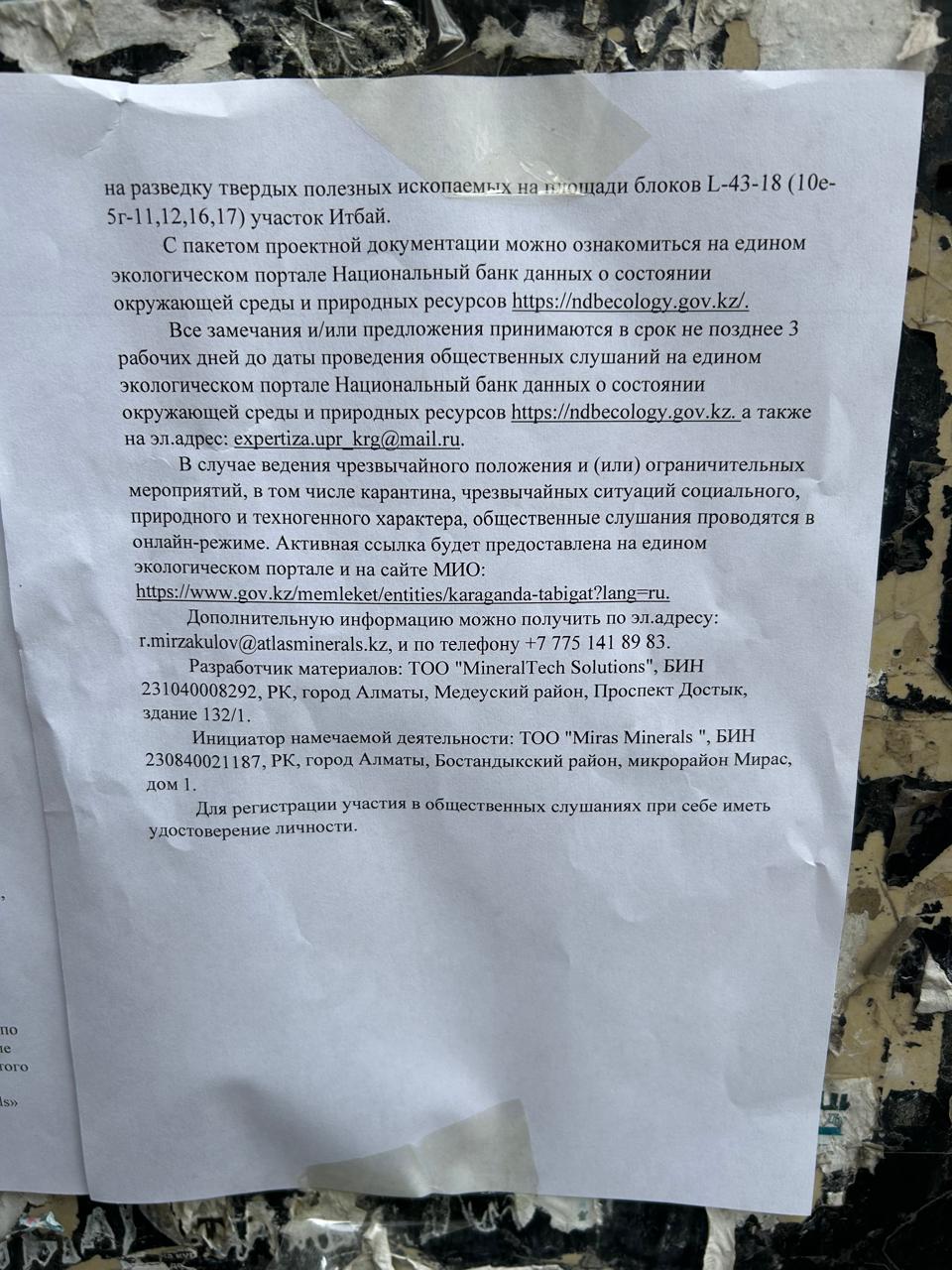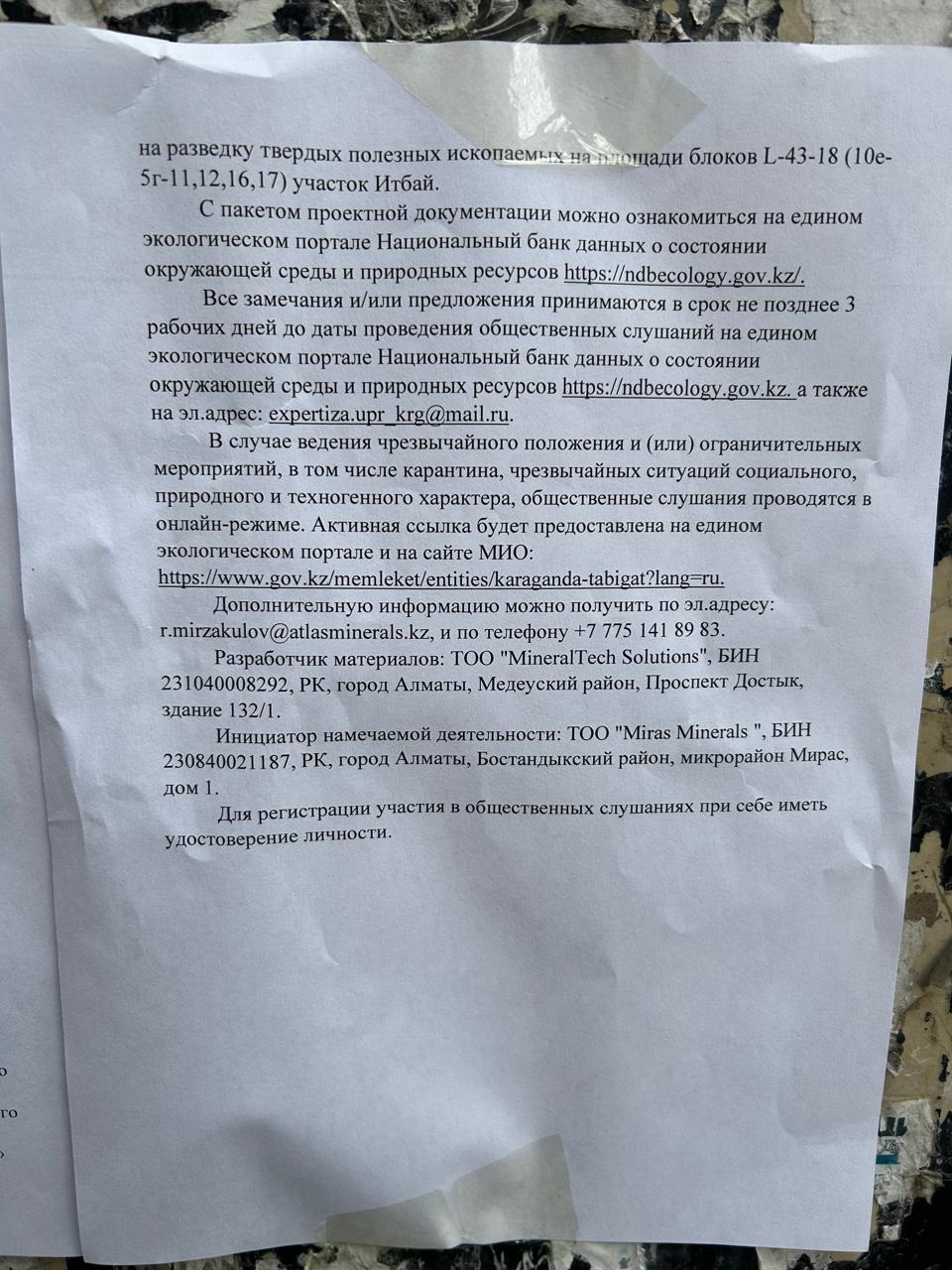 3. Общественные слушания организованны: Управление природных ресурсов и регулирования природопользования Карагандинской области, expertiza.upr_krg@mail.ru,
