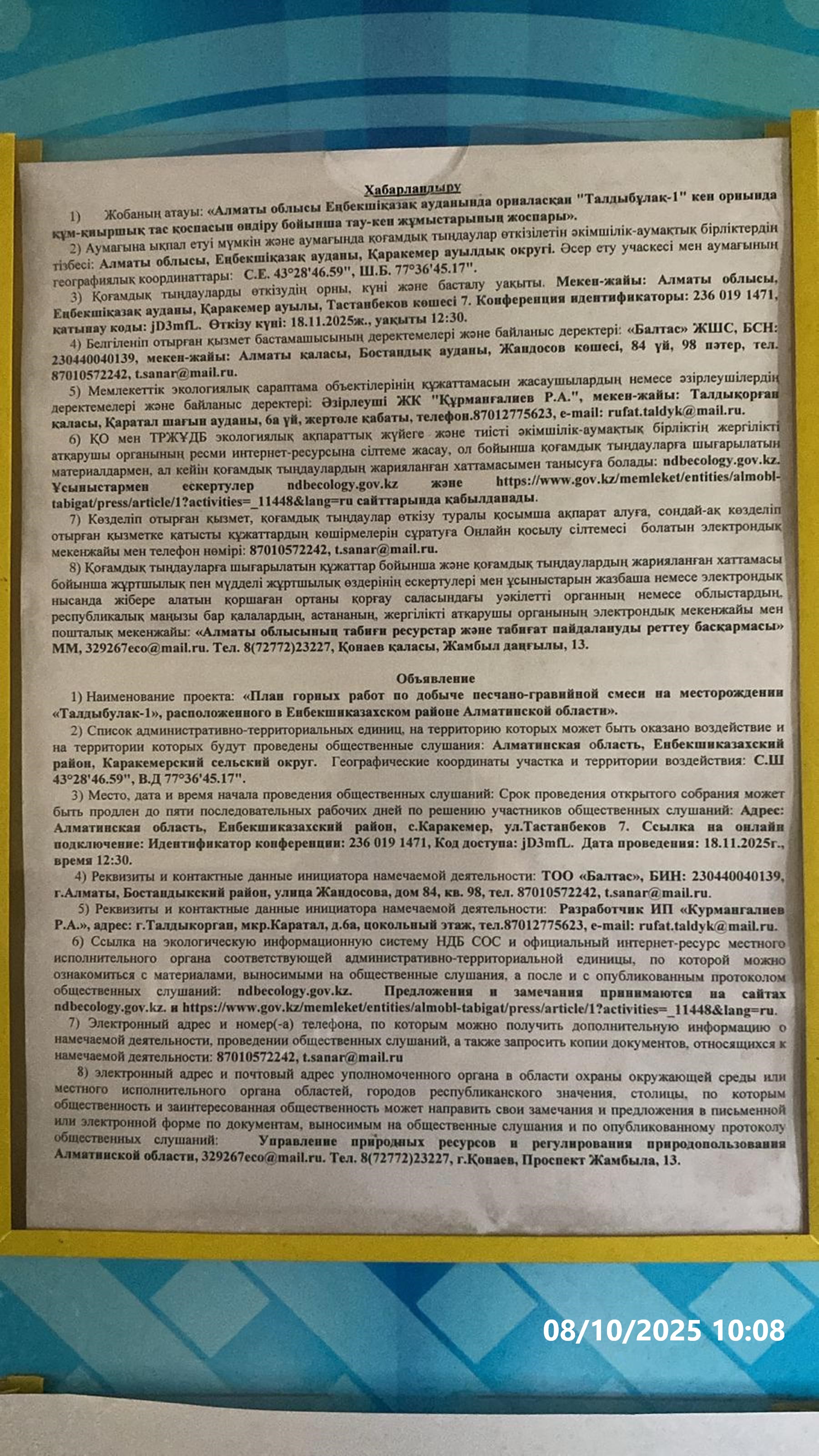 3. Общественные слушания организованны: Управление природных ресурсов и регулирования природопользования Алматинской области, 329267eco@mail.ru,