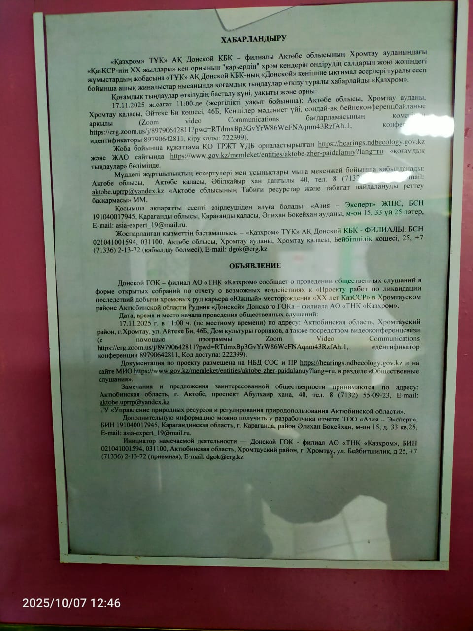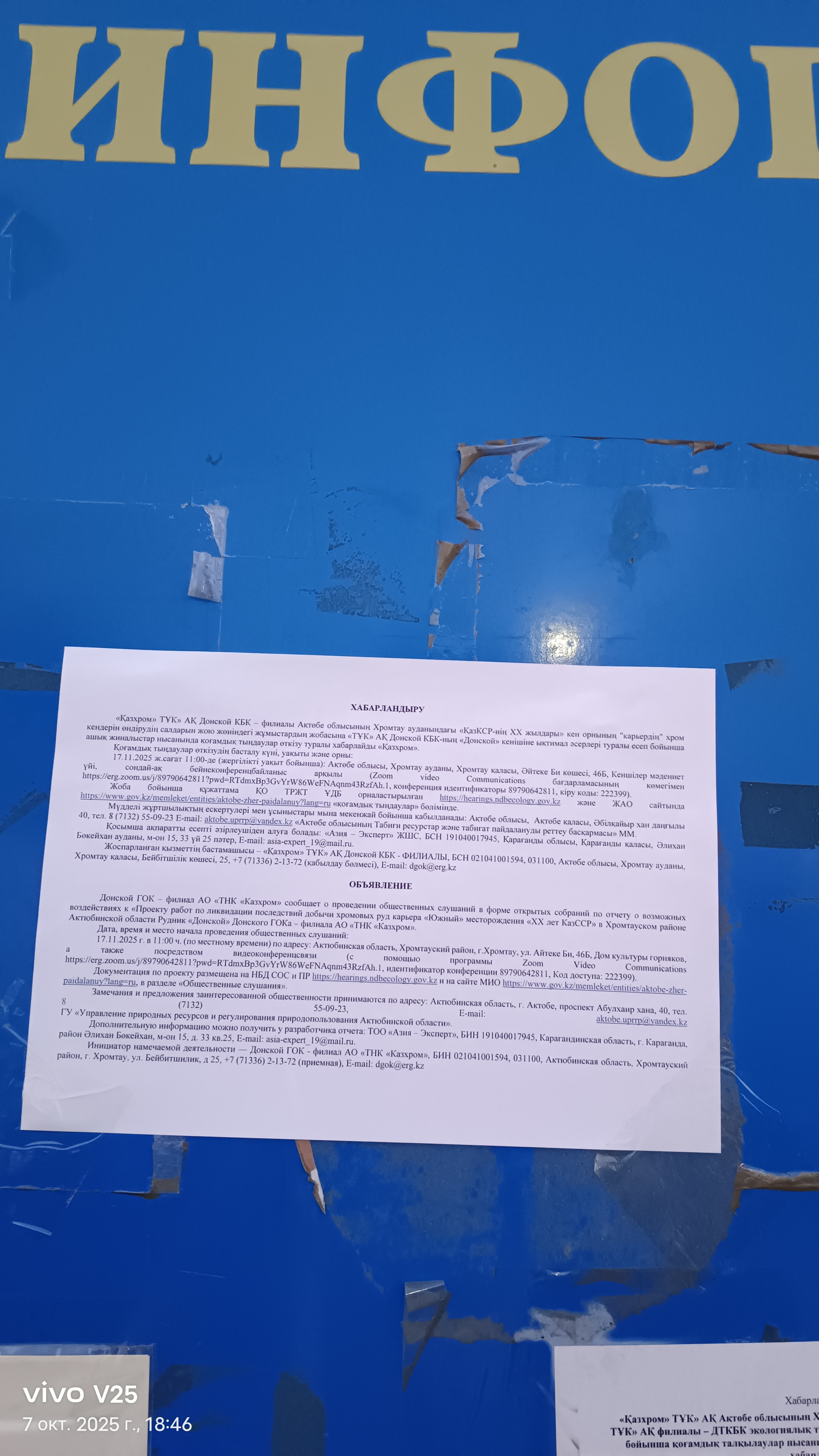 4. Повестка дня общественных слушаний: При разработке отчета о воздействие были предусмотрены все выводы указанные в заключение об определение сферы охвата оценки воздействия на окружающую среду. Общая площадь участка ликвидационных работ – 108,265 га, из них: ликвидация внешних отвалов - 10,565 га, ликвидация карьера - 97,7 га По данным календарного графика отработки запасов операции по недропользованию на карьере «Южный» месторождения «ХХ лет КазССР» заканчиваются в 2027 году. Учитывая данный факт и время на подготовку к ликвидационным работам предусматривается начать ликвидацию последствий добычи хромовых руд в 2028 году. Все работы займут 2 месяца. Отчетом о возможных воздействиях рассматривается год ликвидации последствий добычи хромовых руд и разработан на один год -2028. В ходе планируемой деятельности определено 13 источников выбросов загрязняющих веществ. Из них: 1 - организованный и 12 - неорганизованных источников выбросов вредных веществ. В ходе планируемой деятельности будут выбрасываться загрязняющие вещества 1-4 класса опасности порядка 13-ти наименований. Максимальный валовый объем загрязняющих веществ, выделяемых в атмосферу от работ по ликвидации последствий добычи хромовых руд карьера «Южный» месторождения «ХХ лет КазССР», составит: на 2028 год – 8,242364176 тонн. В процессе ликвидации последствий добычи хромовых руд карьера «Южный» месторождения «ХХ лет КазССР» будет образовываться 1 вид неопасного отхода (смешанные коммунальные отходы). В Приложении 2 к Экологическому кодексу Республики Казахстан намечаемая деятельность отсутствует. В соответствии с приказом Министра экологии, геологии и природных ресурсов Республики Казахстан от 13 июля 2021 года № 246 «Об утверждении Инструкции по определению категории объекта, оказывающего негативное воздействие на окружающую среду» (далее - Приказ) работы по ликвидации последствий добычи хромовых руд карьера «Южный» месторождения «XX лет Казахской ССР» относятся к I категории (пп. 3 п. 10 приказа). Географические координаты участка и географические координаты территории воздействия: 1) 50°19'44.54"С; 58°27'12.28"В 2) 50°20'2.22"С; 58°27'40.76"В 3) 50°18'55.82"С; 58°27'35.86"В 4) 50°18'58.11"С; 58°27'0.32"В Ссылка для видеоконференцсвязи https://erg.zoom.us/j/89790642811?pwd=RTdmxBp3GvYrW86WeFNAqnm43RzfAh.1 Идентификатор конференции: 89790642811 Код доступа: 222399