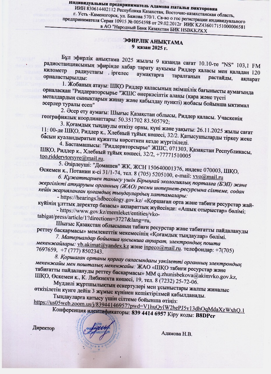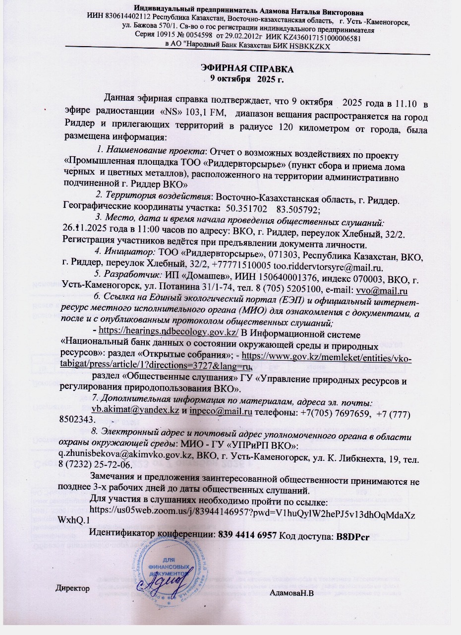 По проекту: Отчет о возможных воздействиях по проекту «Промышленная площадка ТОО «Риддервторсырье» (пункт сбора и приема лома черных и цветных металлов), расположенного на территории административно подчиненной г. Риддер ВКО»