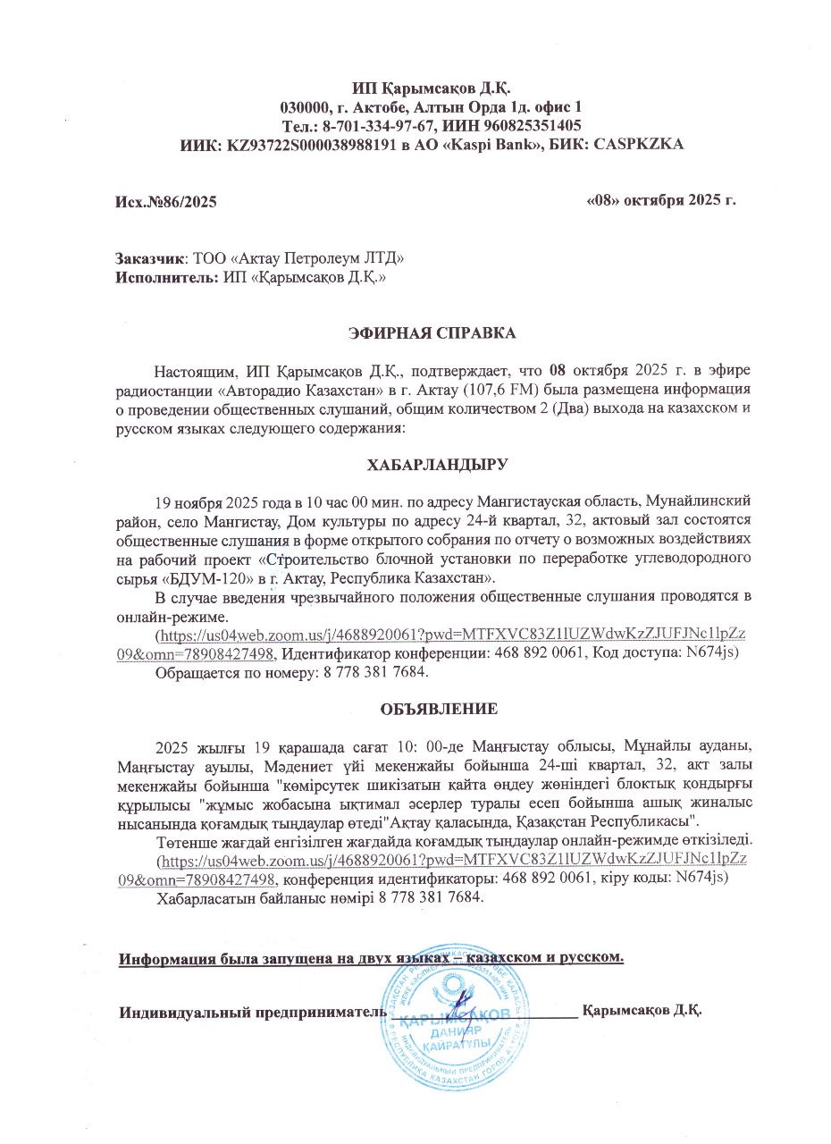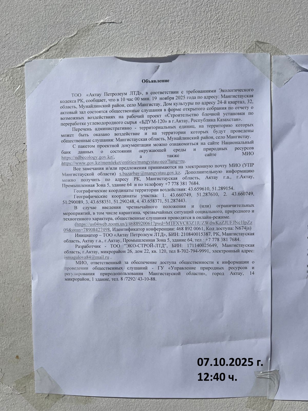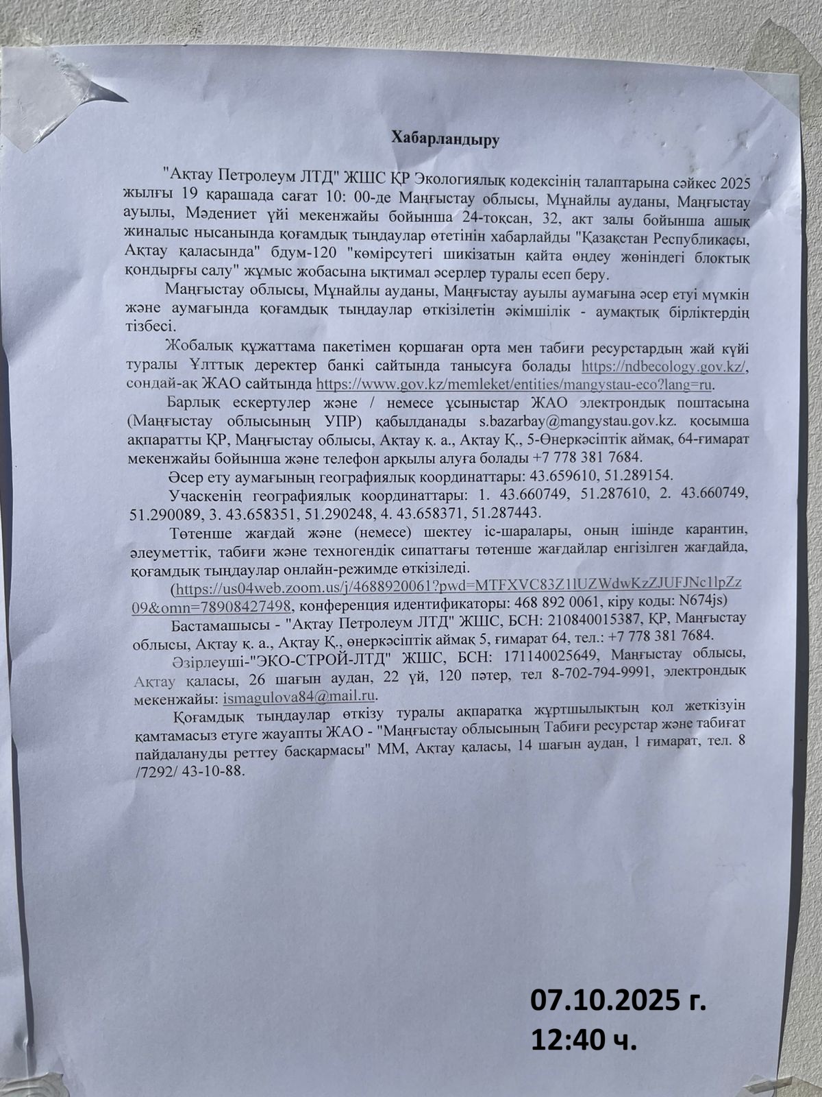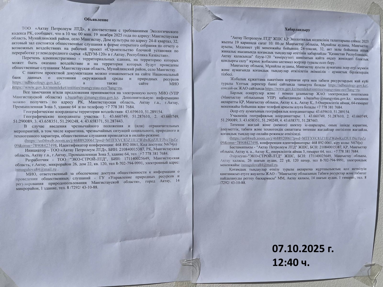 3. Общественные слушания организованны: Управление природных ресурсов и регулирования природопользования Мангистауской области, s.bazarbay@mangystau.gov.kz,