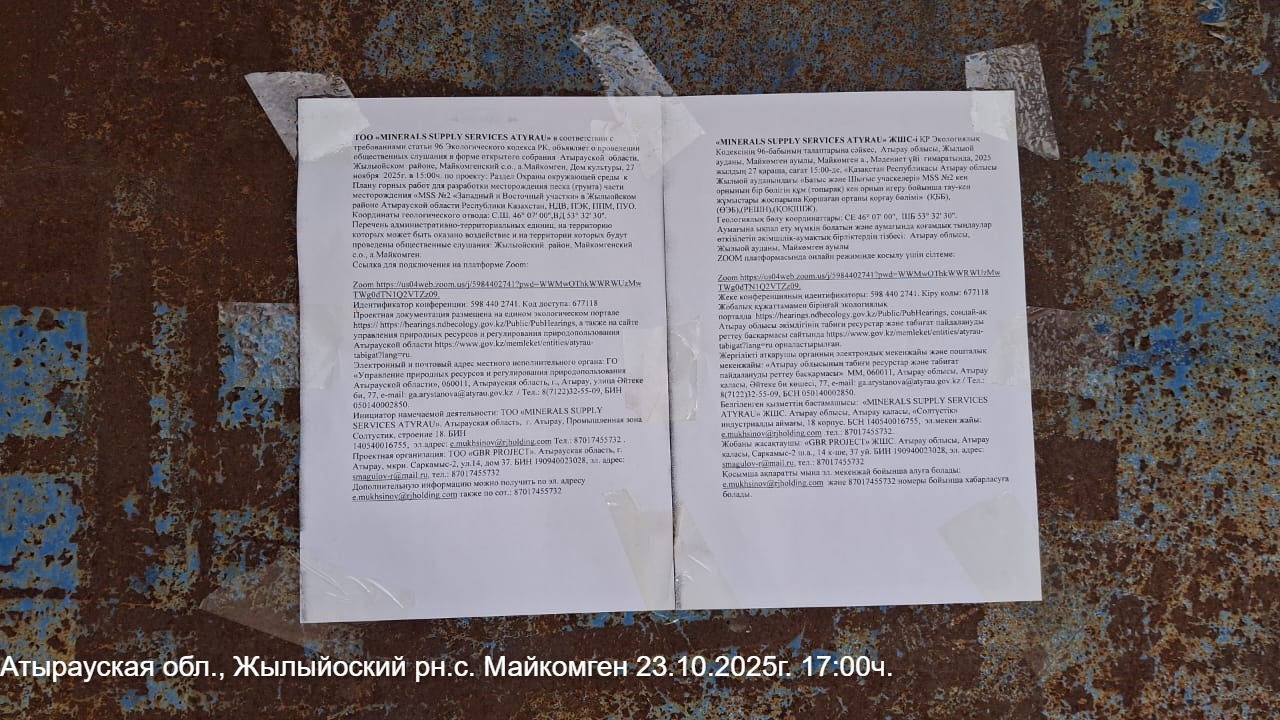 3. Общественные слушания организованны: Управление природных ресурсов и регулирования природопользования Атырауской области, atr.priroda@atyrau.gov.kz,