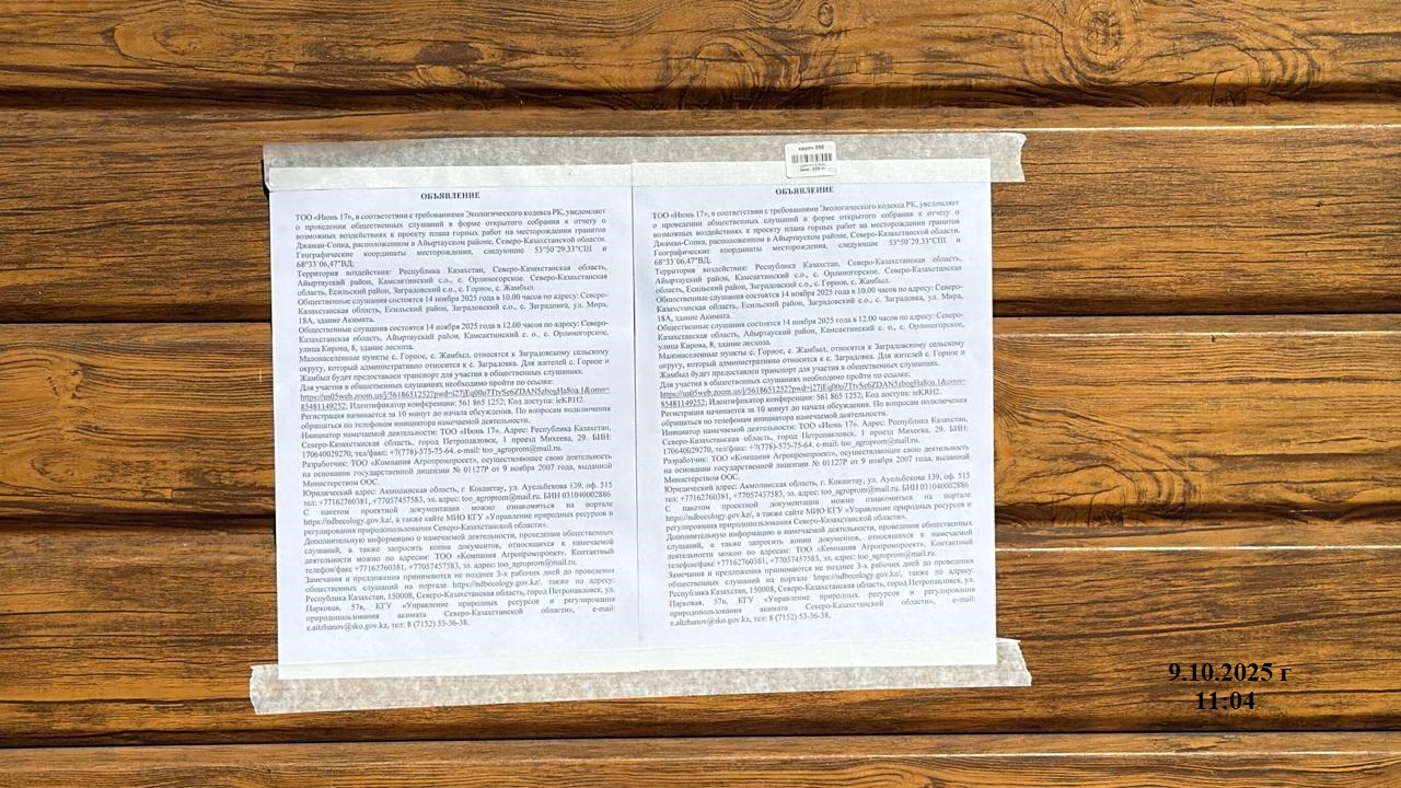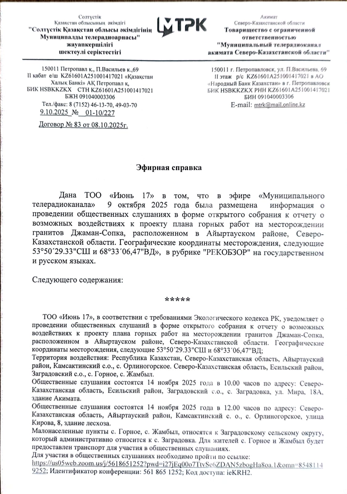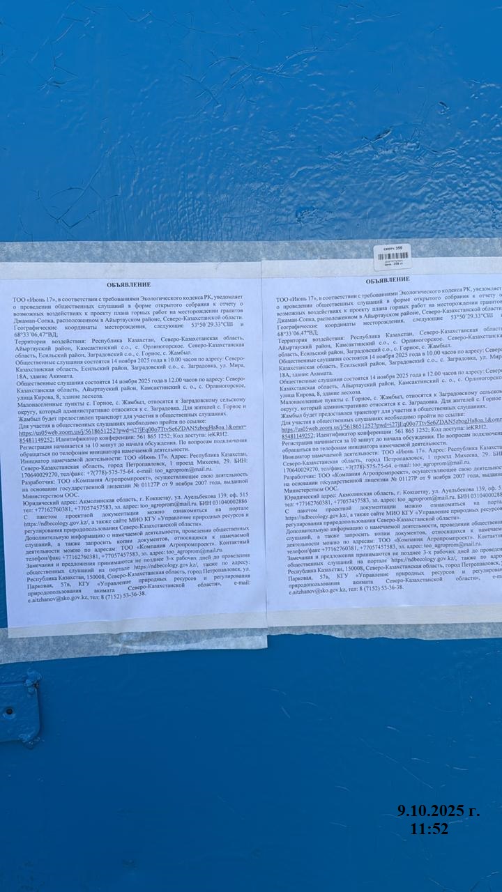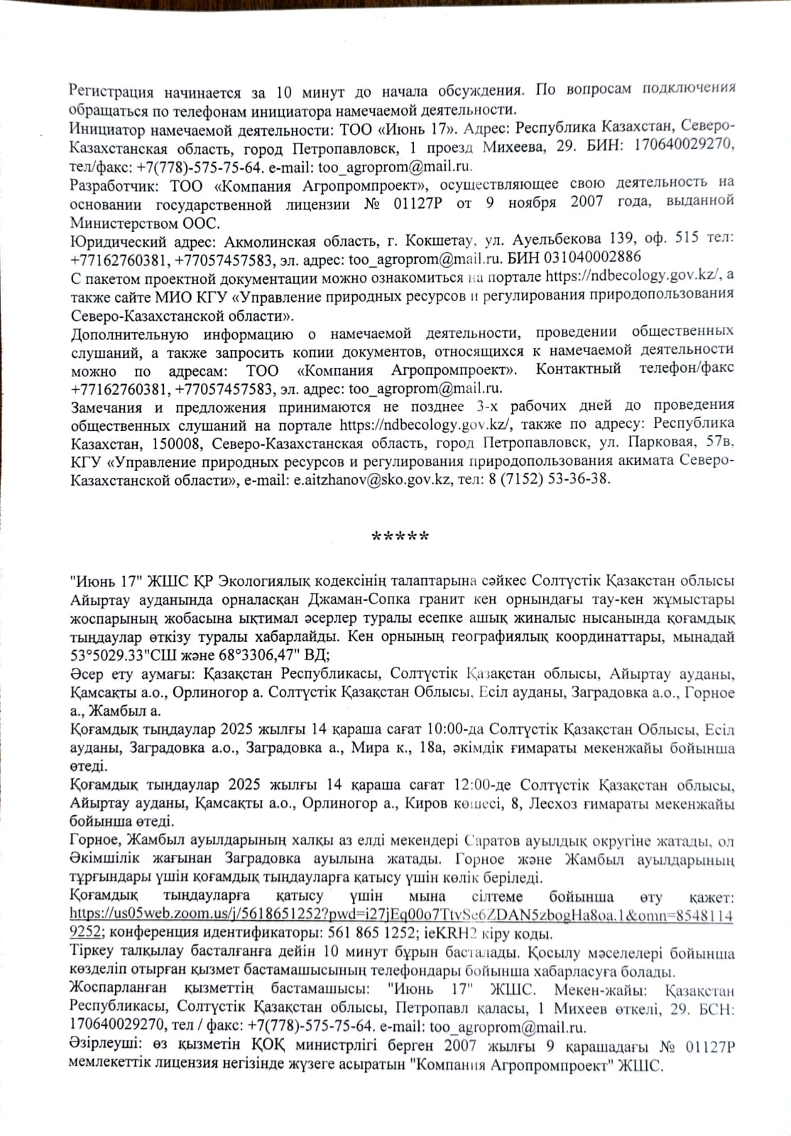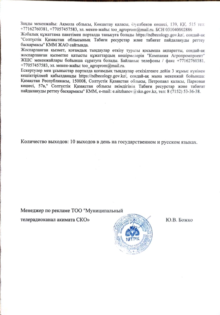 3. Общественные слушания организованны: Управление природных ресурсов и регулирования природопользования Северо-Казахстанской области, e.aitzhanov@sko.gov.kz,