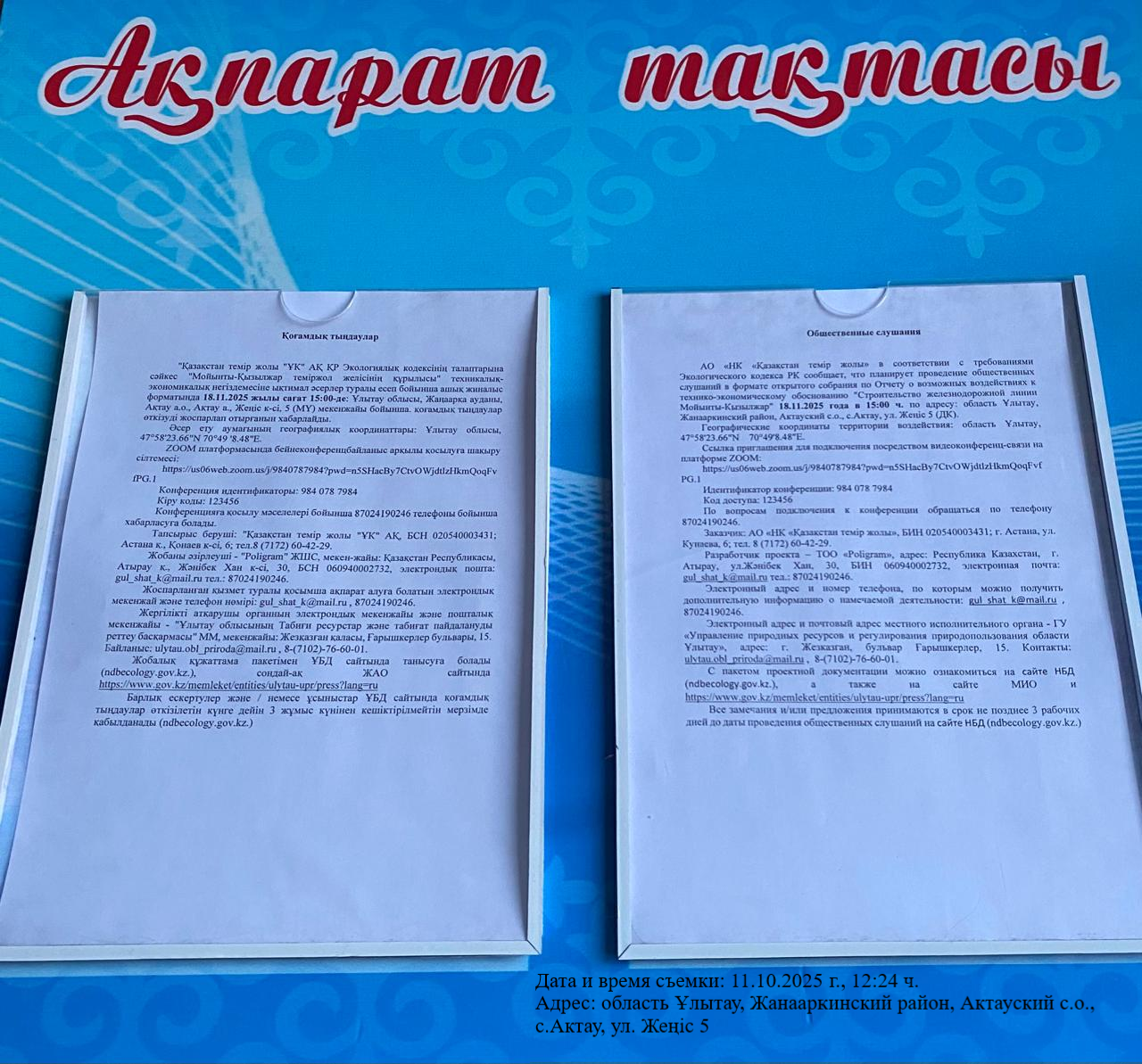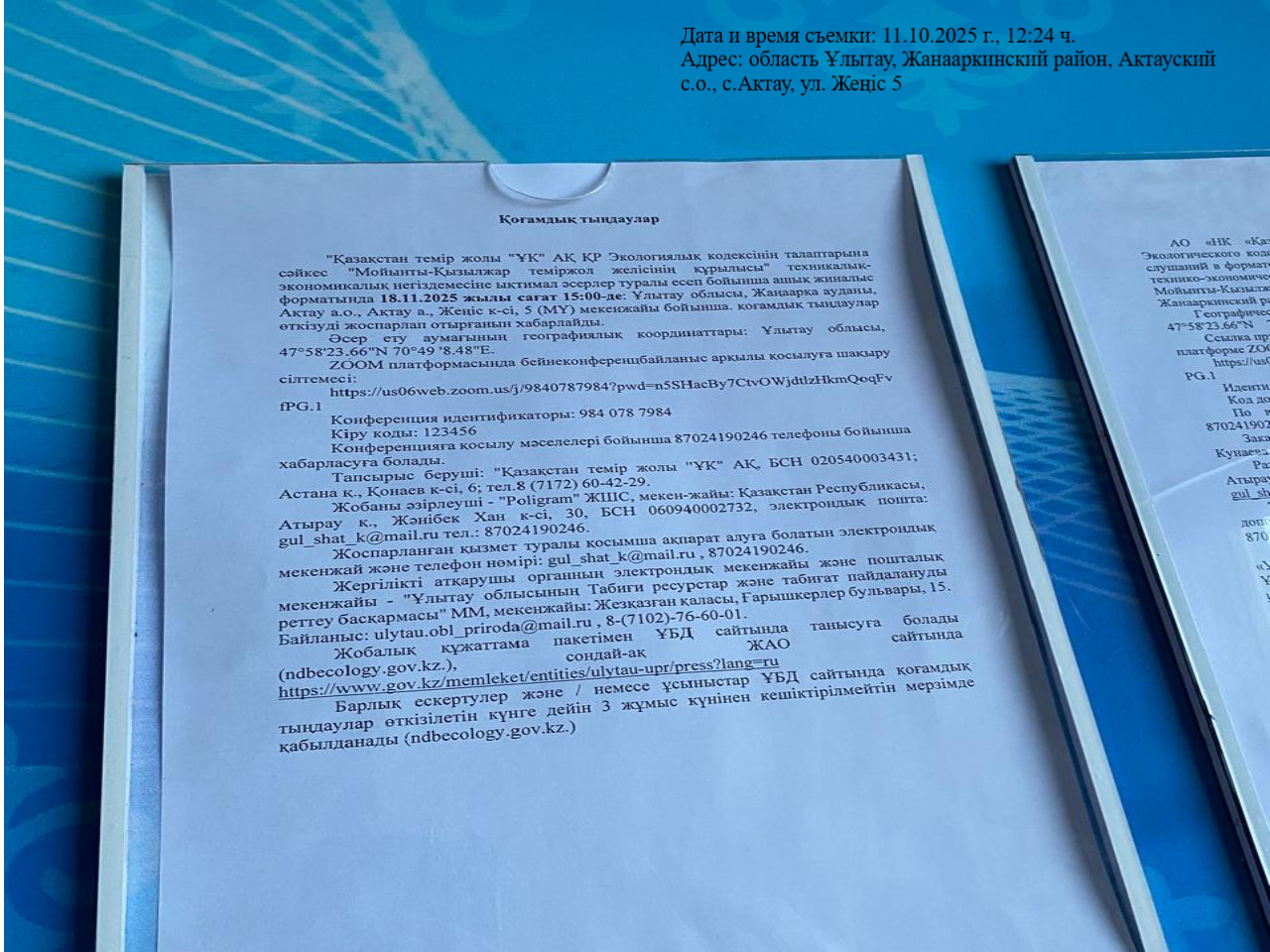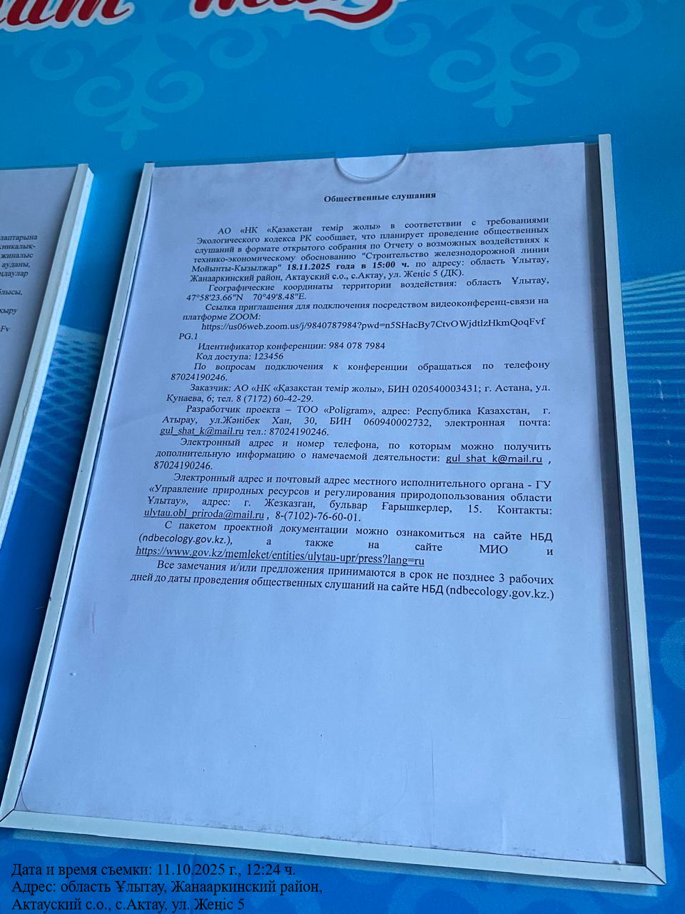 5.4. Дополнительная информация о административно-территориальных единиц: Железнодорожный участок Мойынты - Кызылжар расположен в Шетском районе Карагандинской области и Жанааркинском районе Улытауской области. Ссылка приглашения для подключения посредством видеоконференц-связи на платформе ZOOM: https://us06web.zoom.us/j/9840787984?pwd=n5SHacBy7CtvOWjdtlzHkmQoqFvfPG.1 Идентификатор конференции: 984 078 7984 Код доступа: 123456