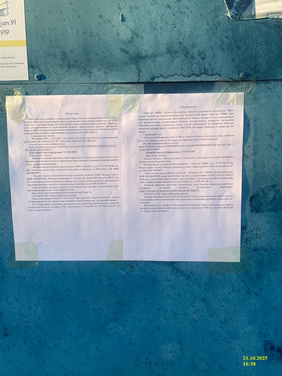 4. Повестка дня общественных слушаний: Предприятие ТОО «Adal tas» является действующим и осуществляет деятельность на основании экологического разрешения на выбросы в окружающую среду, выданного на период с 2024 по 2025 годы (№ KZ49VCZ03447568 от 20.03.2024 г.). Основной вид деятельности — добыча отделочного и строительного камня. Согласно решению Департамента экологии по Акмолинской области от 13.09.2021 г. и в соответствии с п.п. 2.11 п. 2 раздела 2 приложения 2 Экологического кодекса Республики Казахстан, объект отнесён ко II категории по степени воздействия на окружающую среду. ТОО «Adal tas» является правопреемником контракта № 262 от 28 марта 2007 года на проведение работ по совмещённой разведке и добыче магматических пород (строительного камня) на месторождении «Шоптыколь» (Аршалынский район, Акмолинская область), ранее принадлежавшего ТОО «Акмола комплект». Срок действия контракта — до 28 марта 2032 года. Карьер месторождения «Шоптыколь» расположен в 2,5 км к юго-востоку от посёлка Аршалы. Координаты угловых точек земельного отвода Номер точек Координаты Северная широта Восточная долгота 1 50˚ 50' 24,32" 72˚ 14' 10,43" 2 50˚ 50' 40,54" 72˚ 14' 40,43" 3 50˚ 50' 34,87" 72˚ 14' 50,22" 4 50˚ 50' 31,81" 72˚ 14' 54,95" 5 50˚ 50' 29,84" 72˚ 14' 52,06" 6 50˚ 50' 27,12" 72˚ 14' 56,19" 7 50˚ 50' 12,16" 72˚ 14' 28,7" Согласно календарному плану корректировки рабочего проекта «Разработка месторождения строительного камня Шоптыколь», объём добычи установлен в размере: • с 2026 по 2029 годы — по 500,0 тыс. м³ в год, • в 2030 году — 260,0 тыс. м³. Проектом установлены нормативы эмиссий загрязняющих веществ в атмосферу: • на период 2026–2029 гг. — 33,2938 т/год, • на 2030 год — 16,64604 т/год. Согласно санитарным правилам «Санитарно-эпидемиологические требования к санитарно-защитным зонам объектов, являющихся объектами воздействия на среду обитания и здоровье человека» (приказ и.о. Министра здравоохранения РК от 11.01.2022 г. № ҚР ДСМ-2), размер санитарно-защитной зоны для карьеров нерудных строительных материалов установлен 1000 м (раздел 3, п. 11, пп. 1). По характеру производства предприятие относится к I классу санитарной классификации. Объект ТОО «Adal tas», включающий карьер и промплощадку, расположен в одном расчётном прямоугольнике и представлен в период 2026–2030 гг. тремя неорганизованными источниками выбросов в атмосферу. В составе выбросов предприятия содержится 7 загрязняющих веществ: • диоксид азота (NO₂), • оксид азота (NO), • углерод (сажа, углерод чёрный), • диоксид серы (SO₂), • оксид углерода (CO), • керосин, • пыль неорганическая (70–20% двуокиси кремния). На предприятии образуются 4 вида отходов, из которых: • 1 вид относится к опасным, • 3 вида — к неопасным. Отходы временно размещаются на территории предприятия и передаются специализированной организации для дальнейшей утилизации на основании заключённого договора.