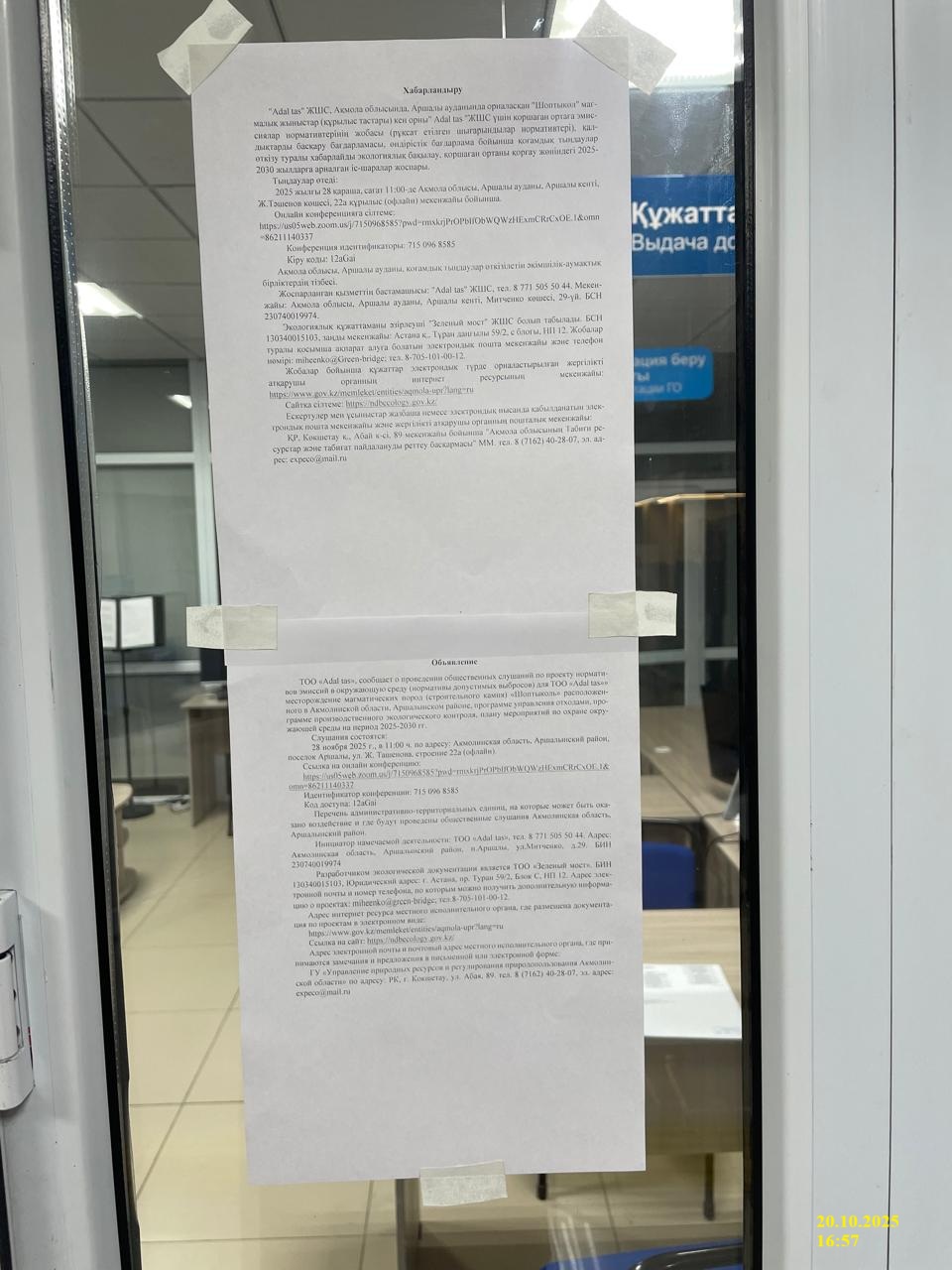 По проекту: Проект нормативов эмиссий в окружающую среду (Нормативы допустимых выбросов) для ТОО «Adal tas»» месторождение магматических пород (строительного камня) «Шоптыколь» расположенного в Акмолинской области, Аршалынском районе. Программа производственного экологического контроля ТОО «Adal tas» на 2025 – 2030 гг, Программа управления отходами ТОО «Adal tas» на 2025 – 2030 гг., план мероприятий по охране окружающей среды на период 2025-2030 годы