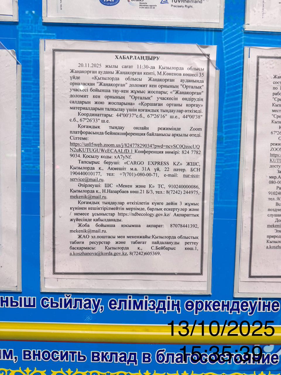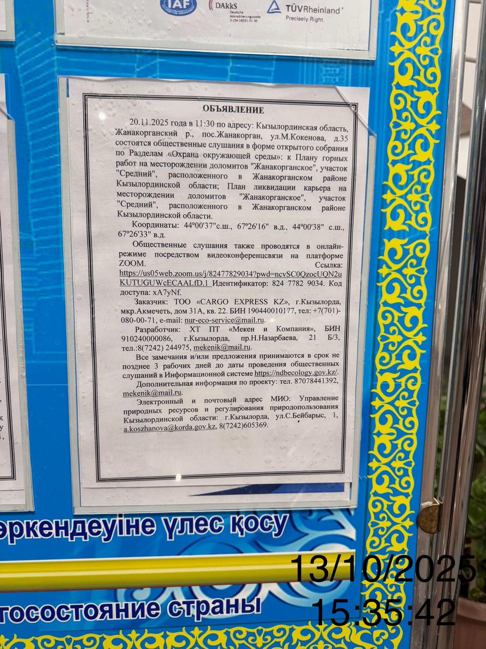 3. Общественные слушания организованны: Управление природных ресурсов и регулирования природопользования Кызылординской области, prd@korda.gov.kz 87242605362, 605369,