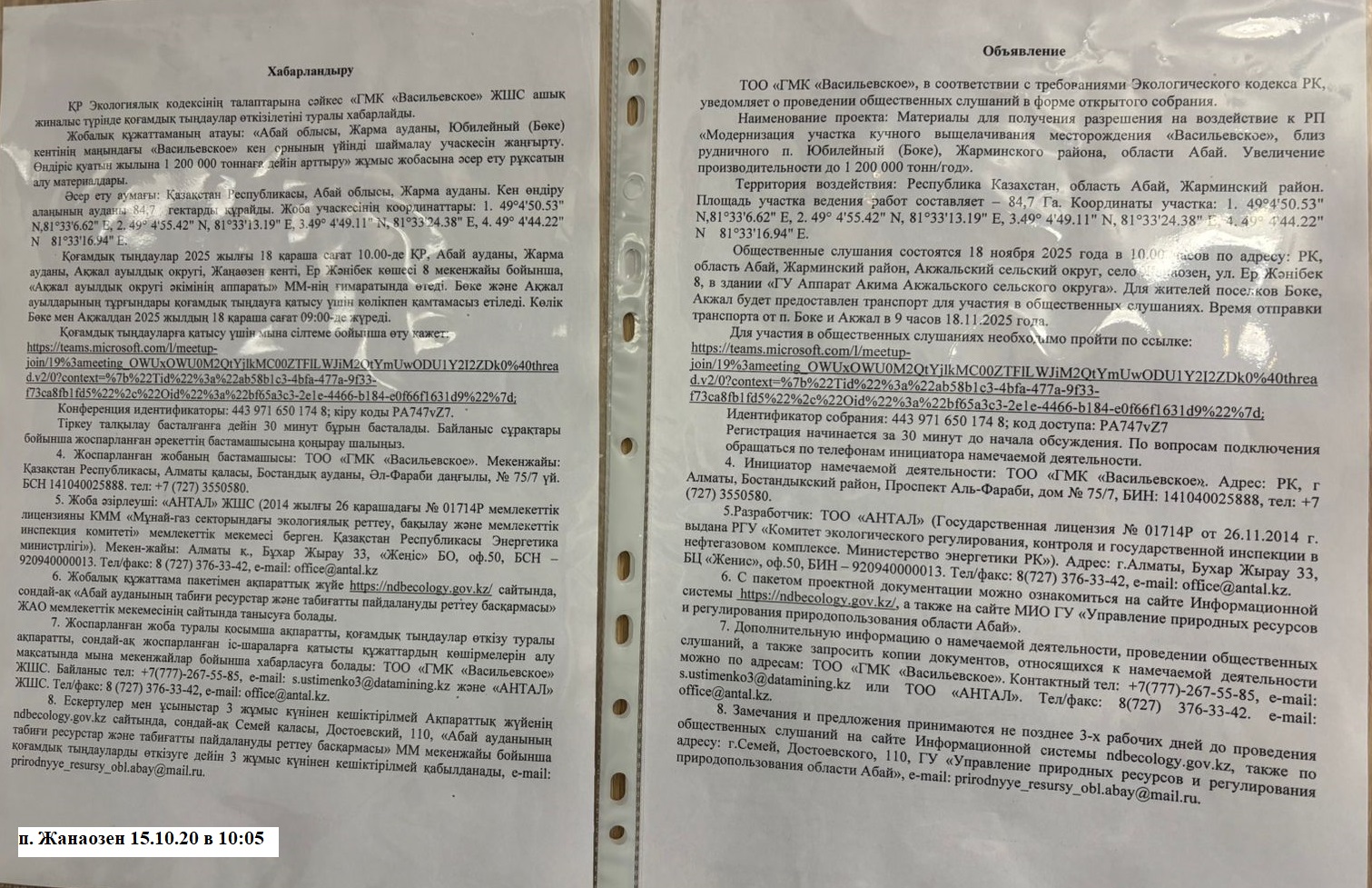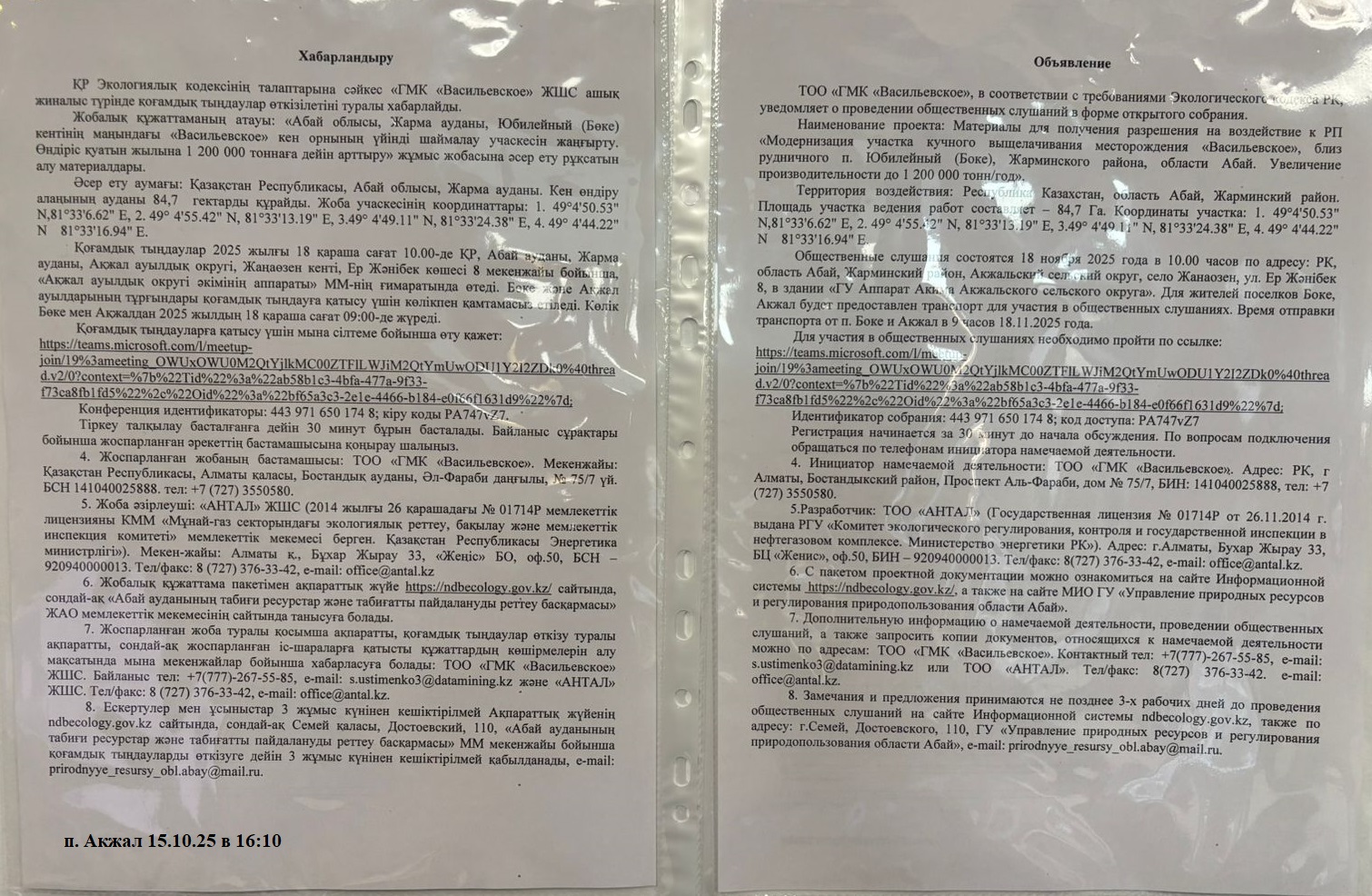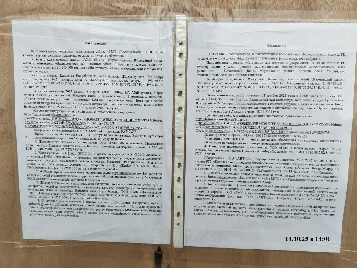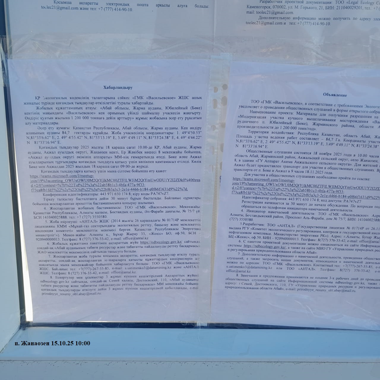 3. Общественные слушания организованны: Главный специалист УПР и ПР область Абай, prirodnyye_resursy_obl.abay@mail.ru,