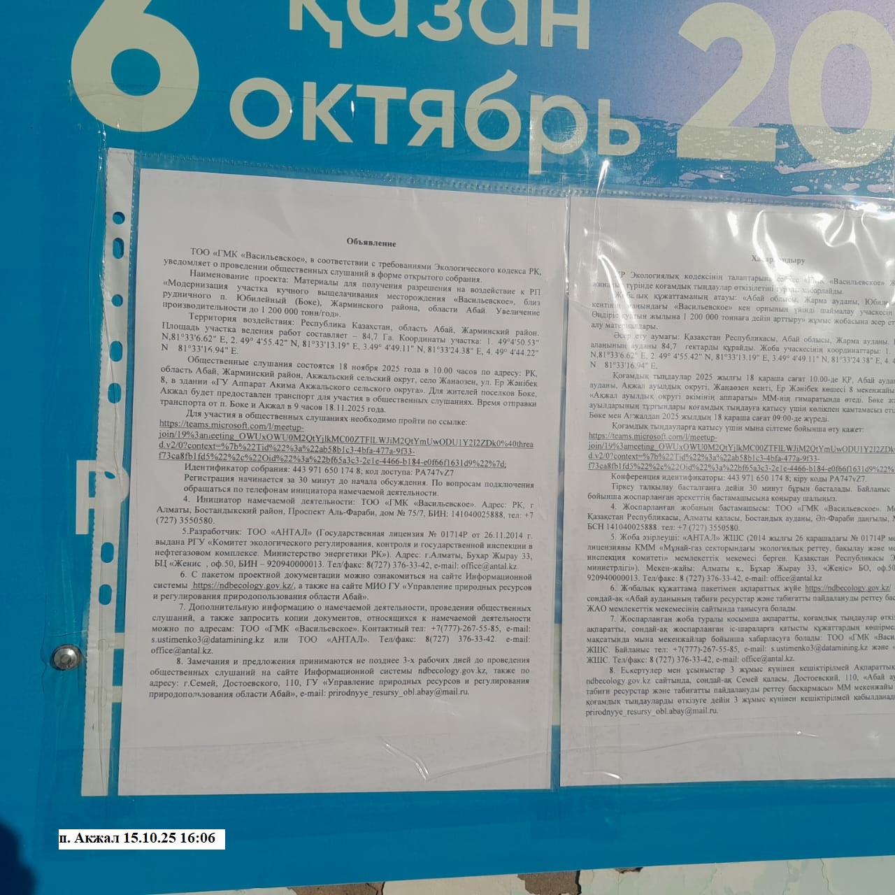 6. Объявление о проведении общественных слушаний на казахском и русском языках будет распространено следующими способами: