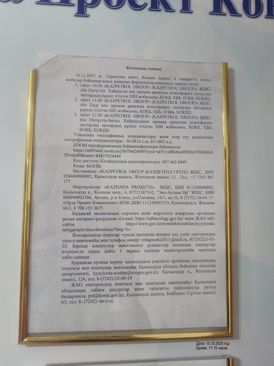 3. Общественные слушания организованны: Управление природных ресурсов и регулирования природопользования Кызылординской области, prd@korda.gov.kz 87242605362, 605369,