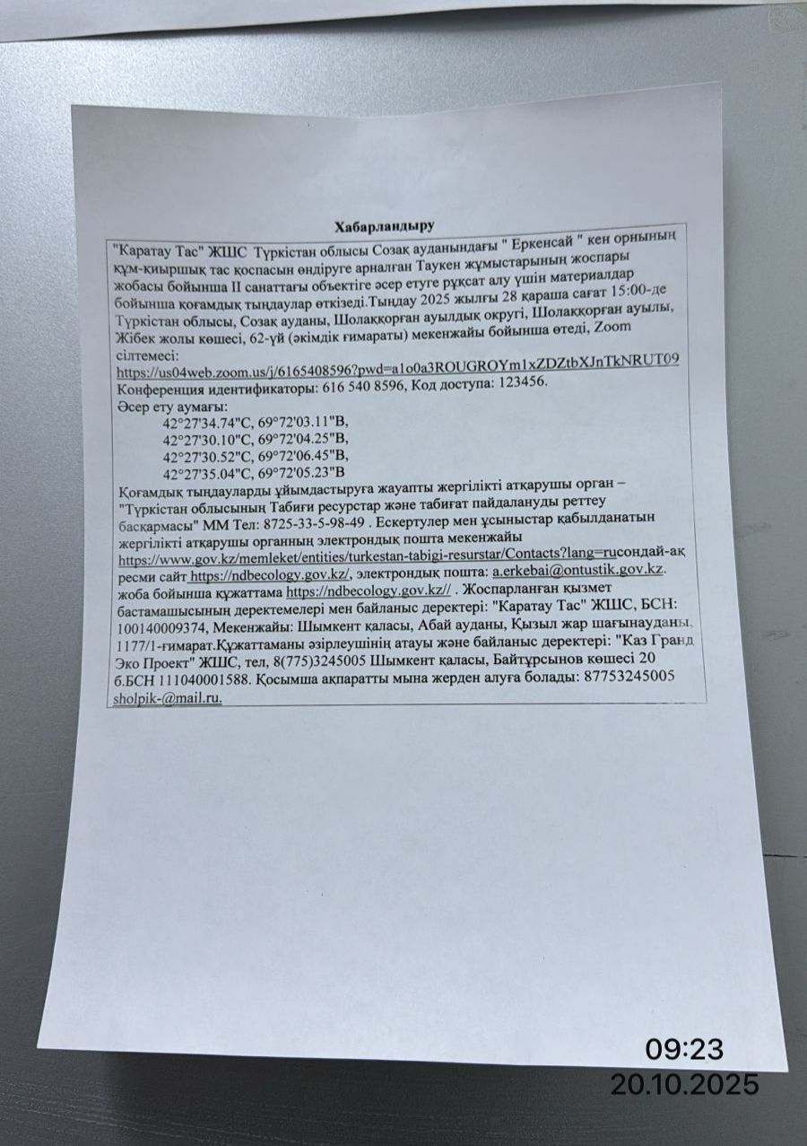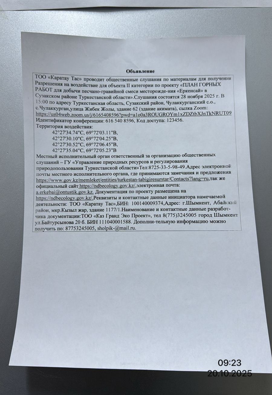 3. Общественные слушания организованны: Управление природных ресурсов и регулирования природопользования Туркестанской области, a.erkebai@ontustik.gov.kz,