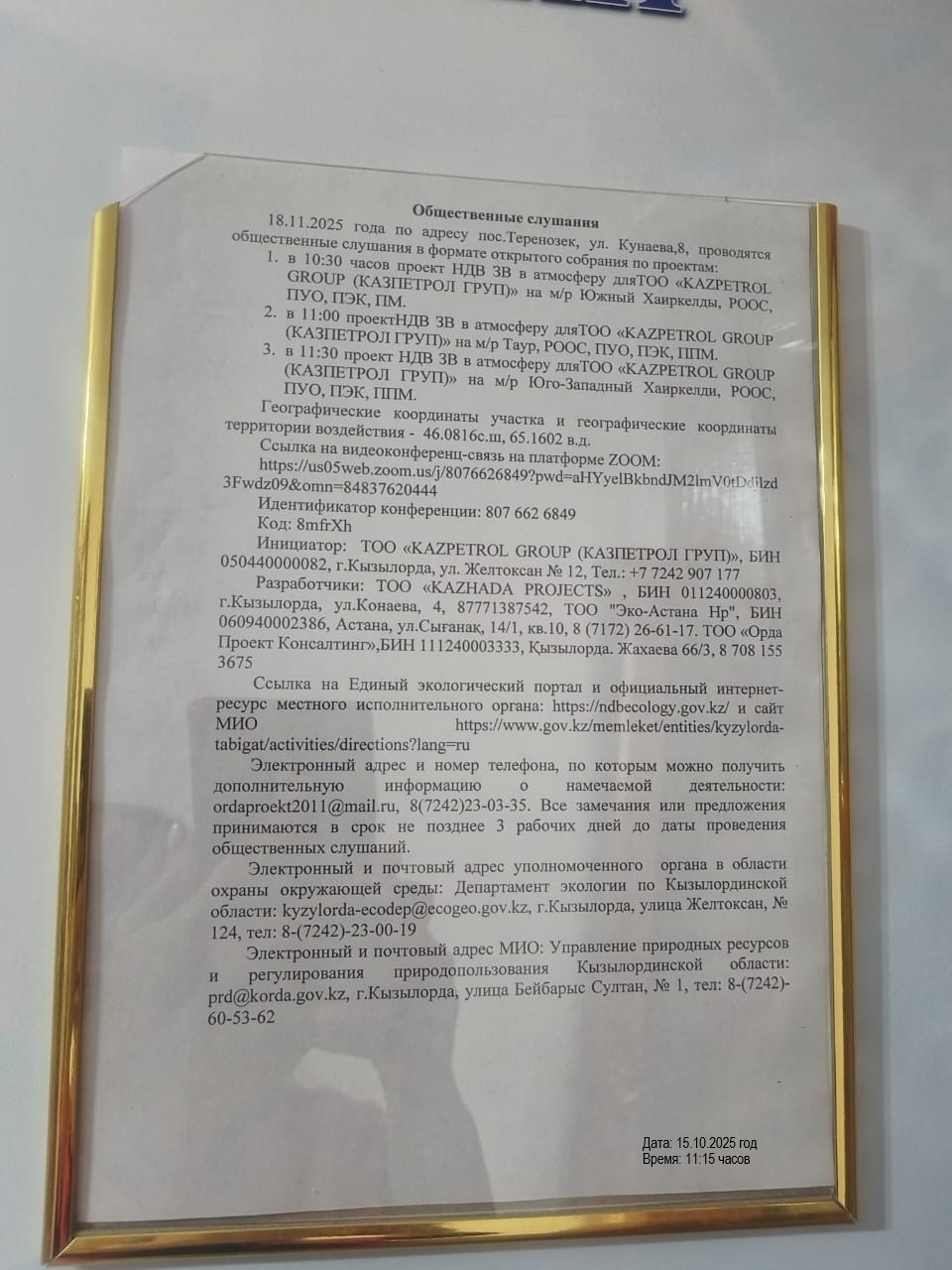 3. Общественные слушания организованны: Управление природных ресурсов и регулирования природопользования Кызылординской области, prd@korda.gov.kz 87242605362, 605369,