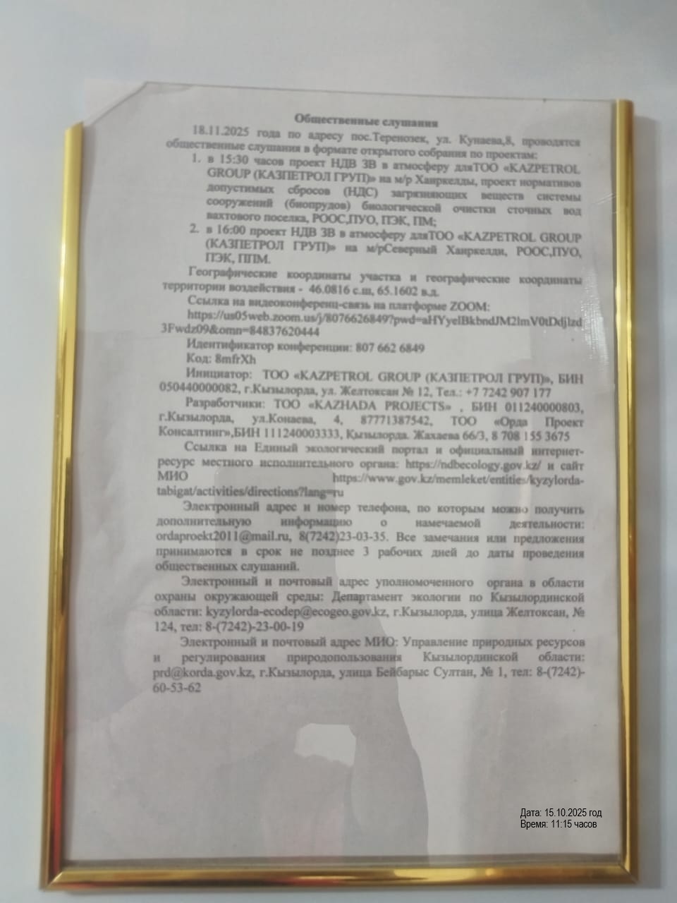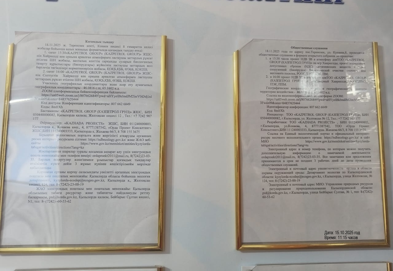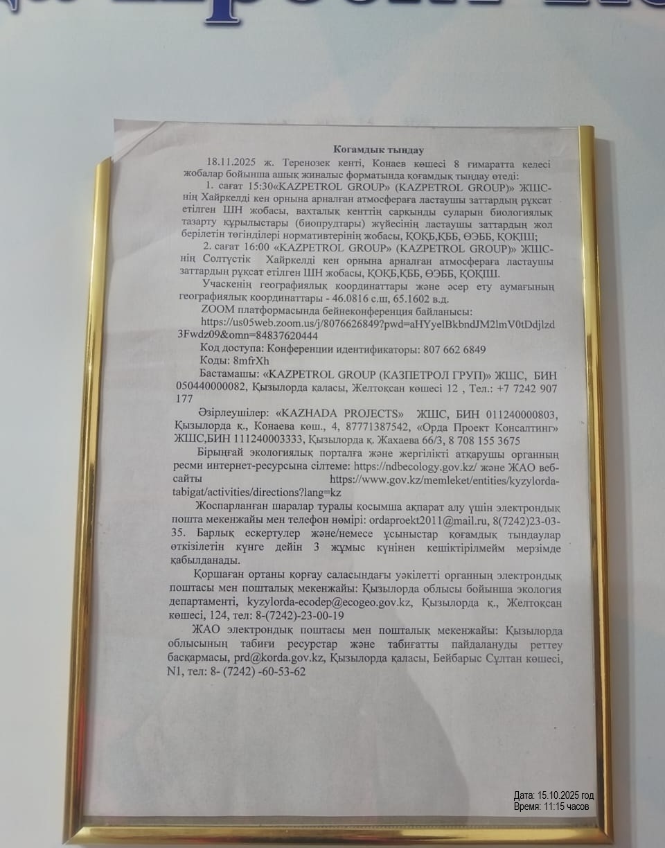 3. Общественные слушания организованны: Управление природных ресурсов и регулирования природопользования Кызылординской области, prd@korda.gov.kz 87242605362, 605369,
