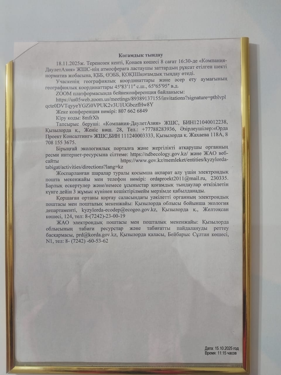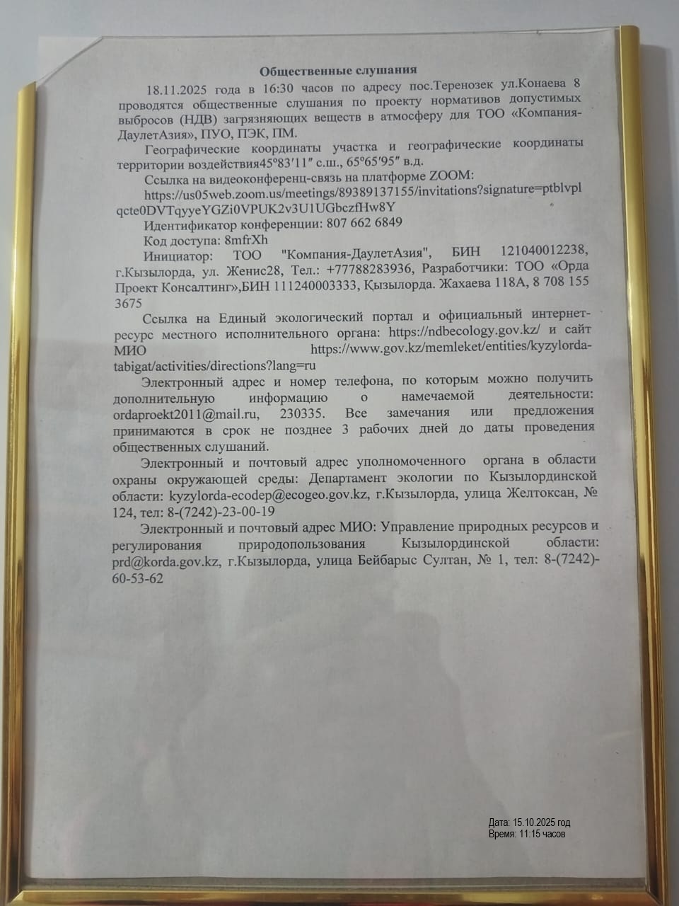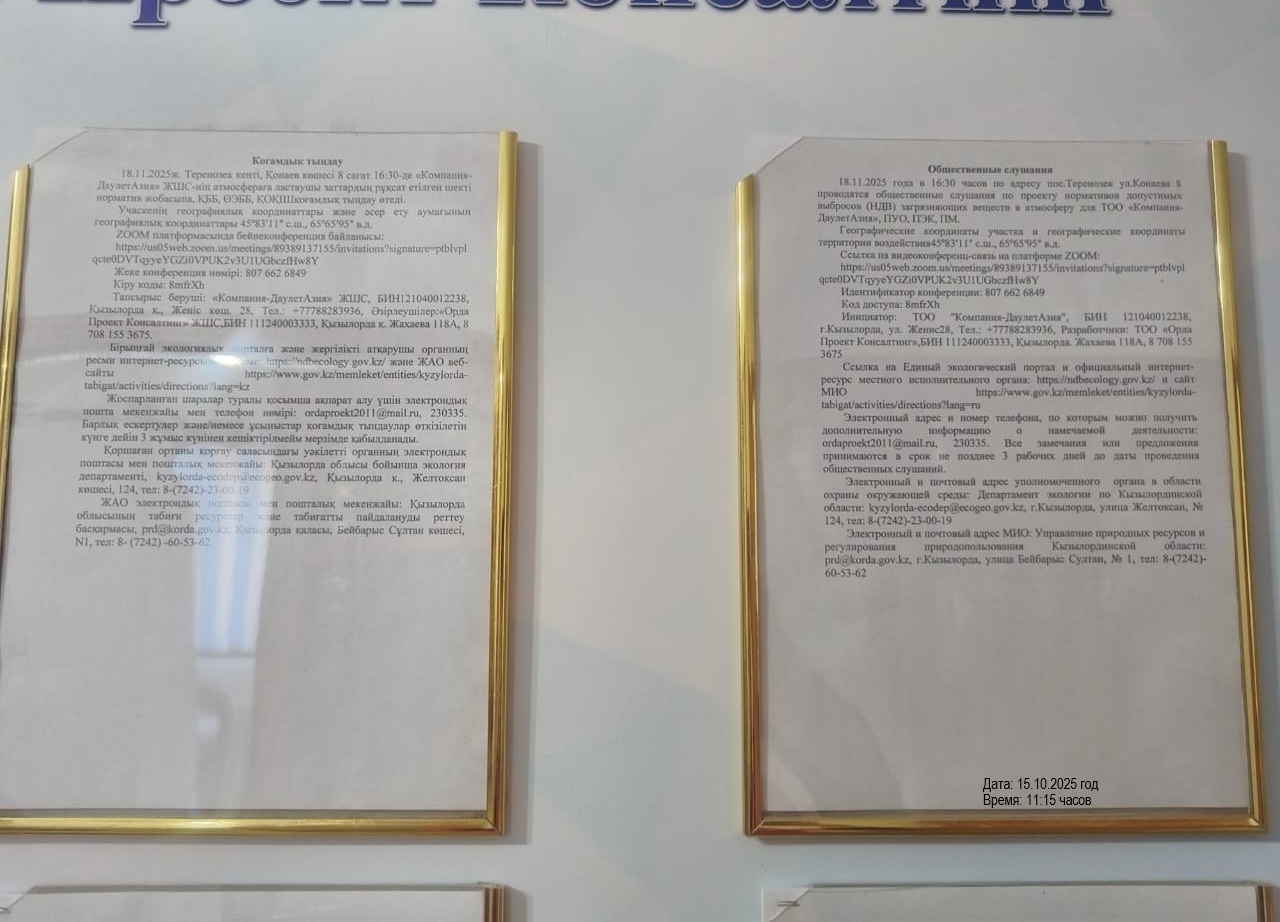 3. Общественные слушания организованны: Управление природных ресурсов и регулирования природопользования Кызылординской области, prd@korda.gov.kz 87242605362, 605369,