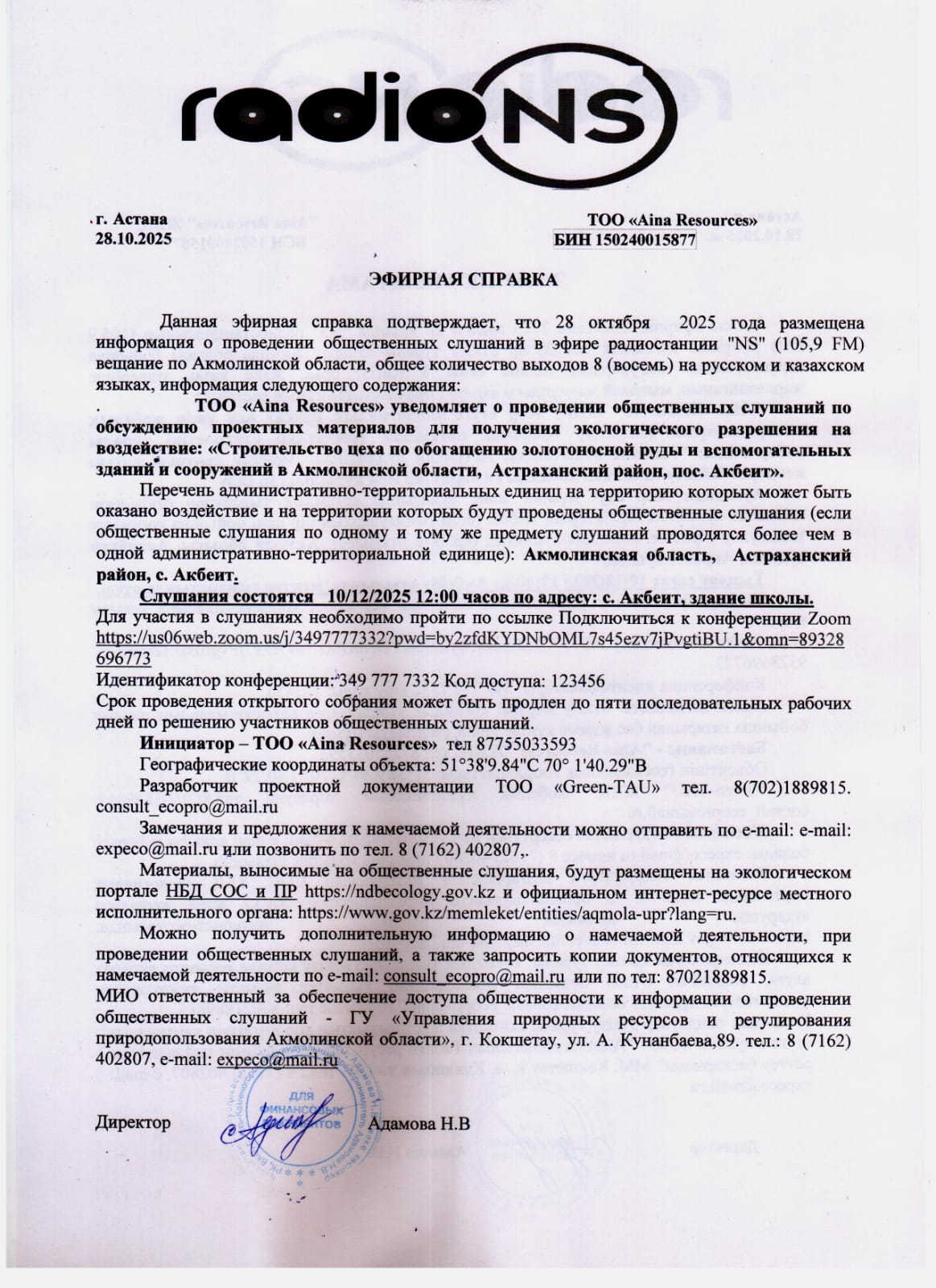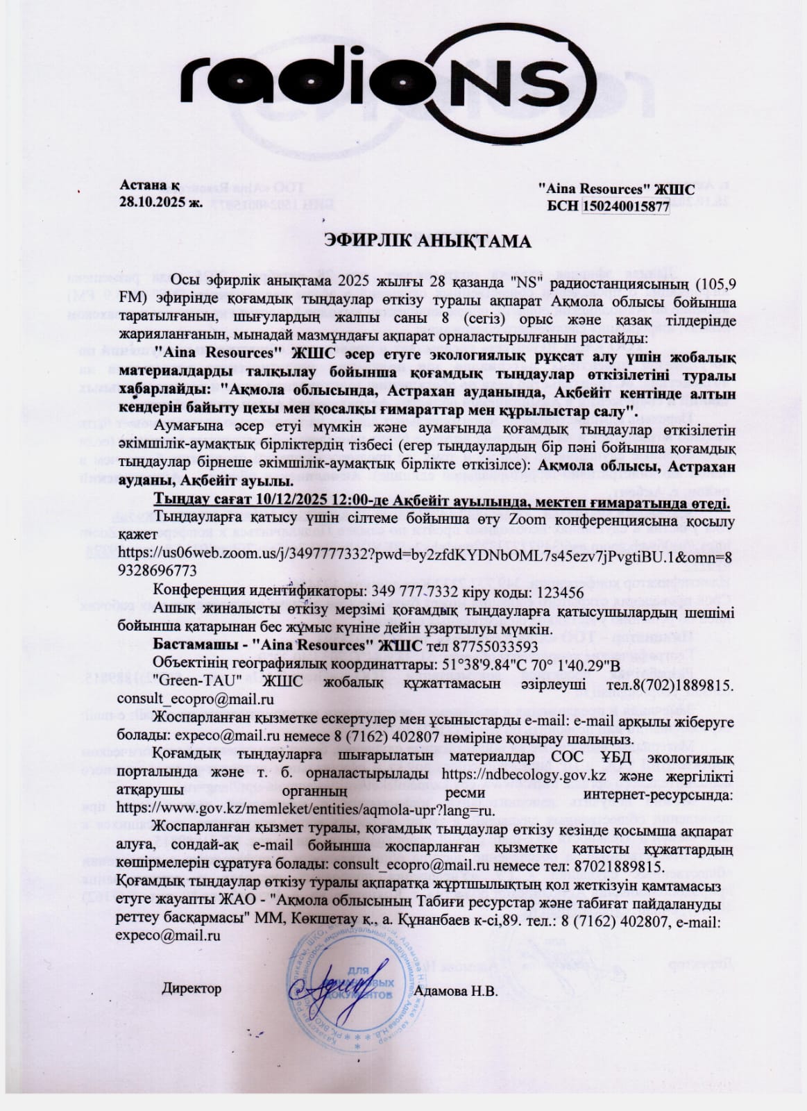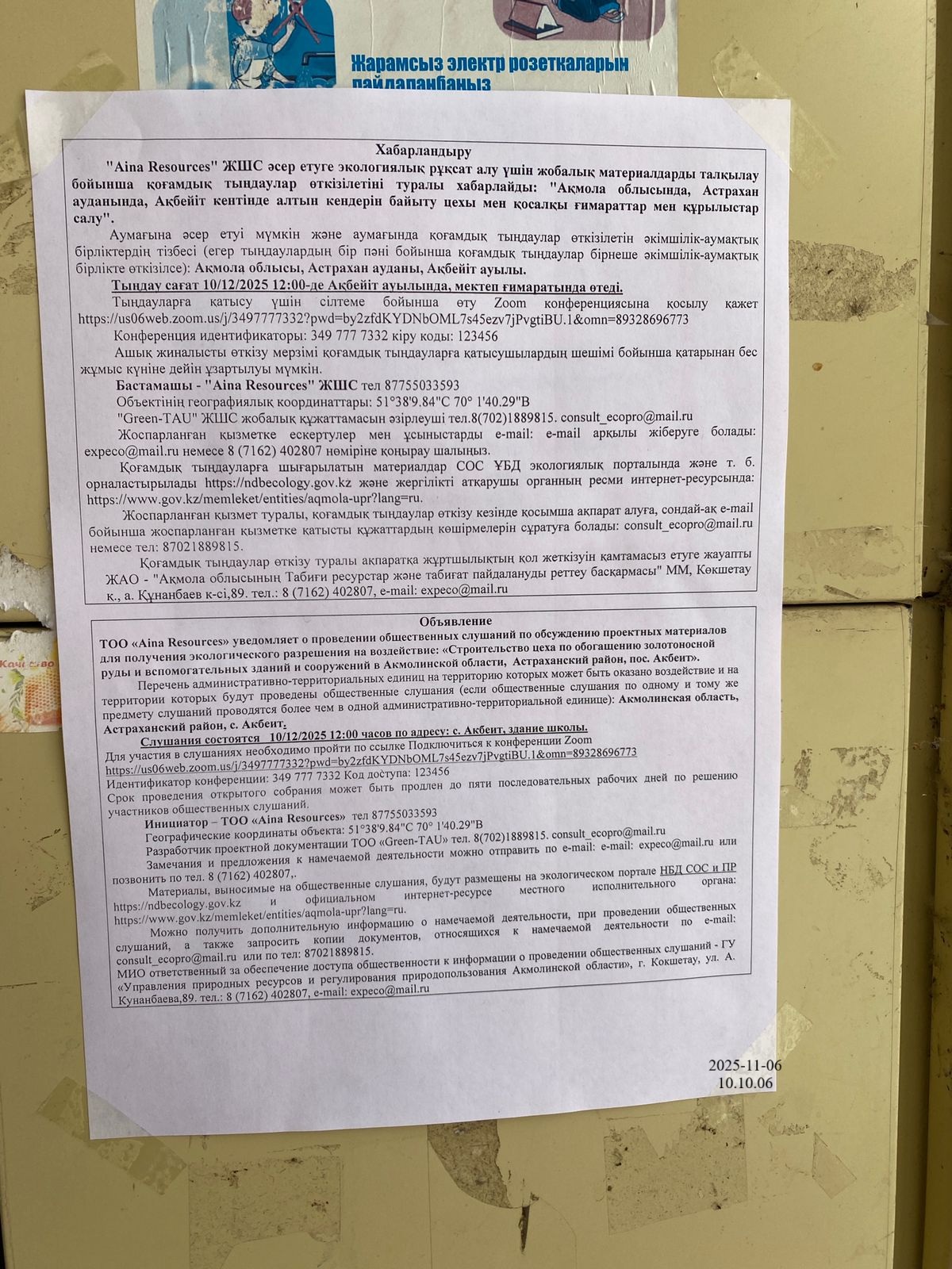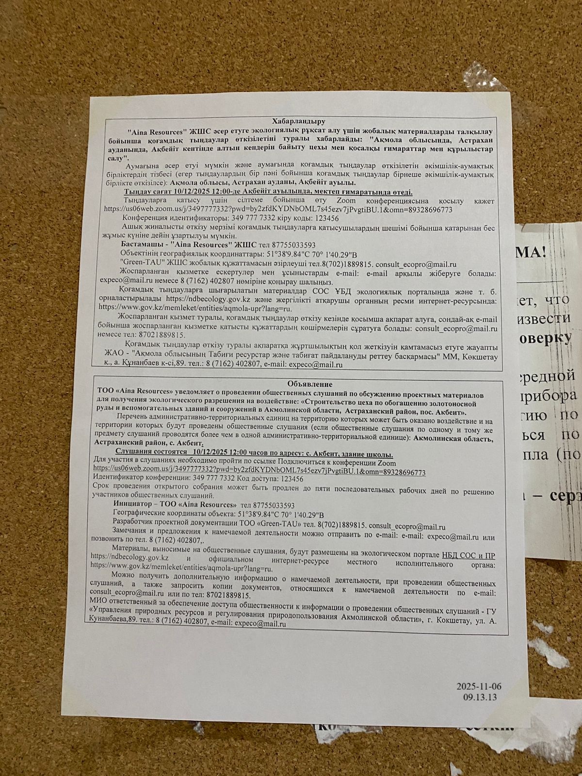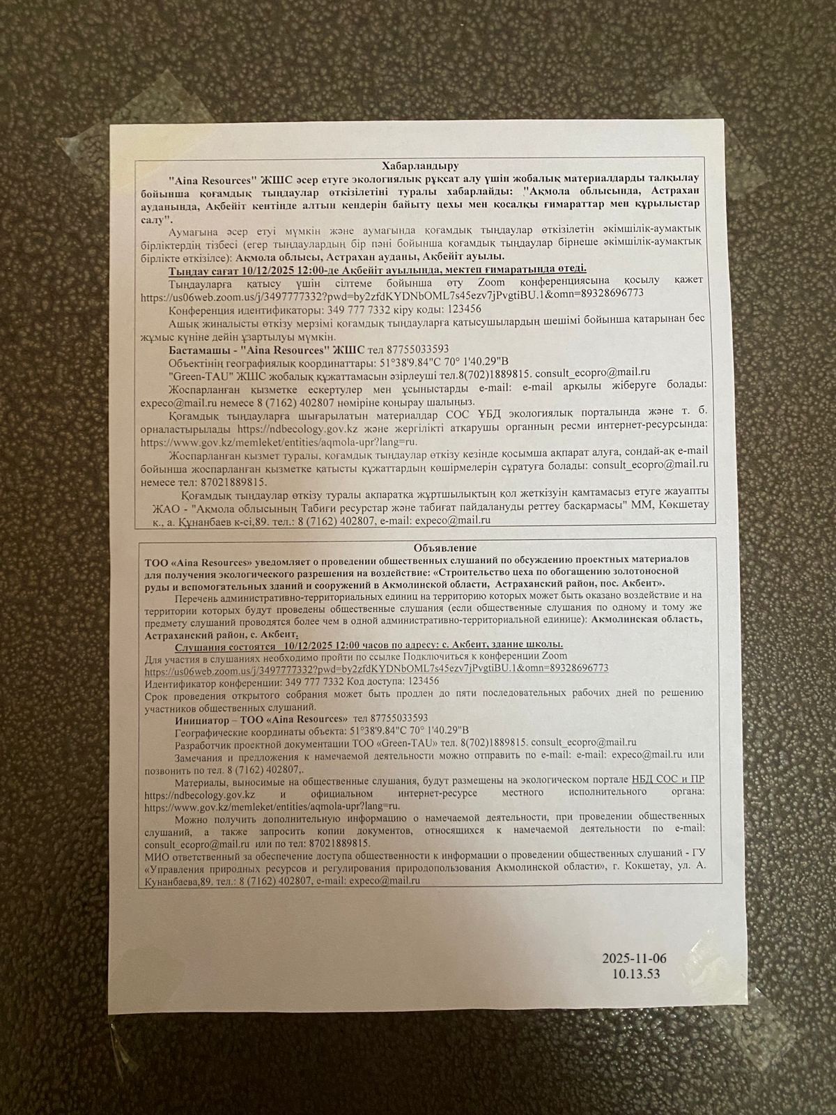 3. Общественные слушания организованны: Управление природных ресурсов и регулирования природопользования Акмолинской области, expeco@mail.ru,