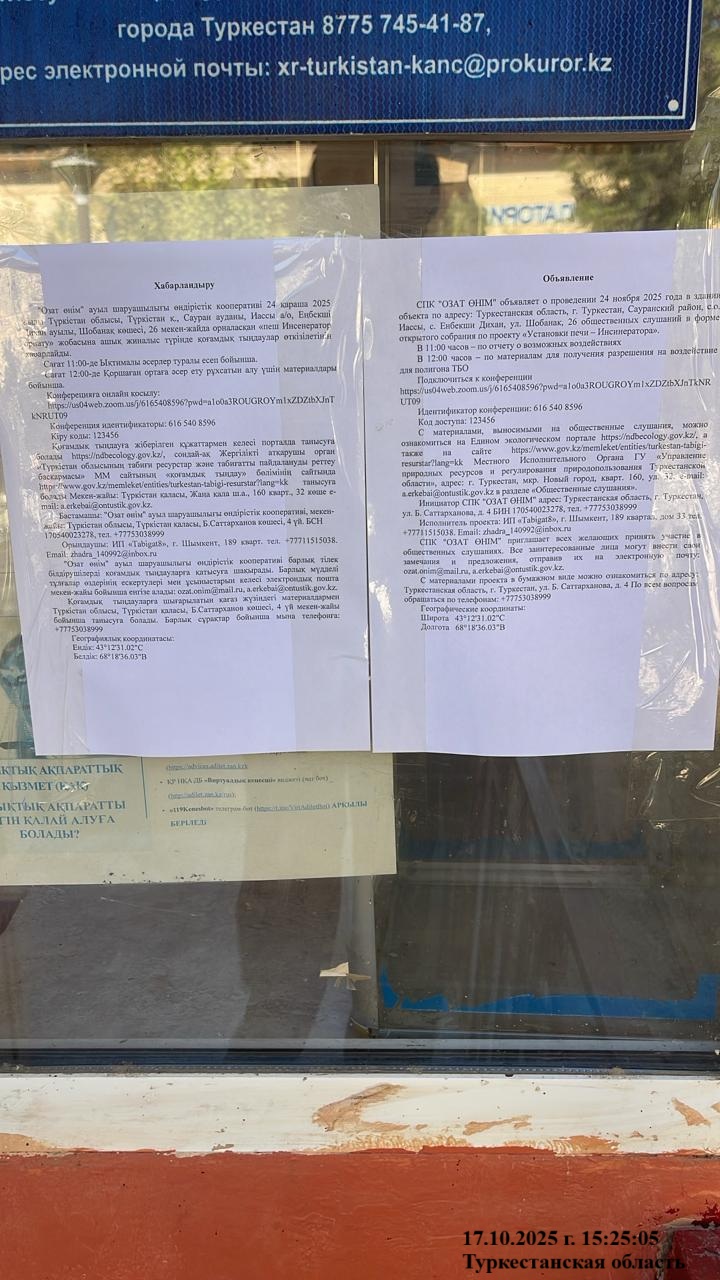3. Общественные слушания организованны: Управление природных ресурсов и регулирования природопользования Туркестанской области, a.erkebai@ontustik.gov.kz,