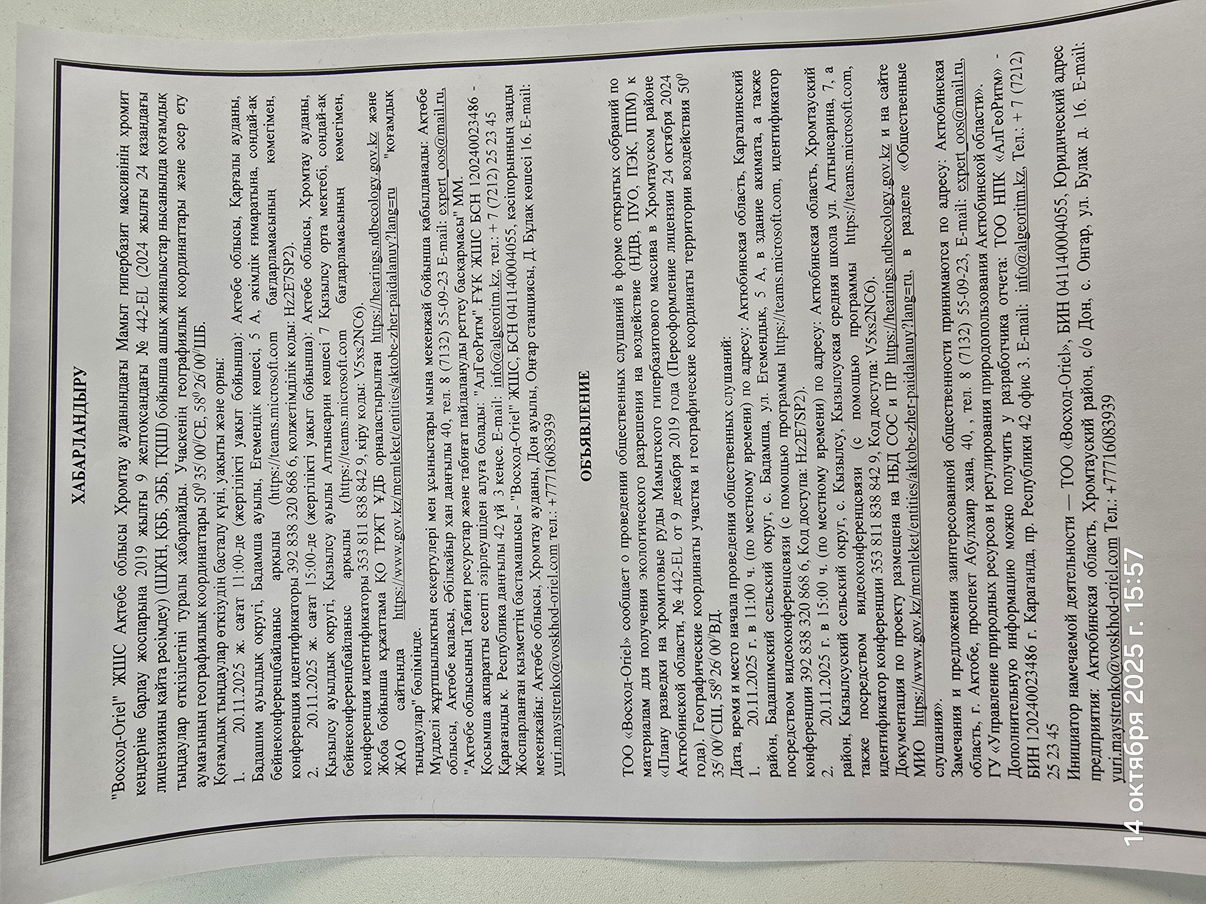 4. Повестка дня общественных слушаний: Мамытский массив расположен в наиболее оживленной зоне Актюбинской области. В 7 км на запад от массива расположен крупный пос. Батамшинский (центр никеленосного района), в 8 км юго-восточнее поселок Кызылсу, в 30 км к югу г. Хромтау центр Южно-Кемпирсайского (главного) рудного поля. В непосредственной близости расположены поселки Нов. Деревня, Бородиновка и др. В 15 км к югу от массива проходит железная дорога Никельтау-Алтынсарино, в 8-9 км к западу от Мамытского массива пролегает железная дорога Орск-Кандагач. Пространственные границы: в пределах блоков М-40-57-(10в-5в-5); М-40-57-(10в-5в-10); М-40-57-(10в-5в-15); М-40-57-(10в-5г-1); М-40-57-(10в-5г-6); М-40-57-(10в-5г-11). Ранее лицензия принадлежала ТОО "Mamyt Geo Technology", в настоящее время правообладатель лицензии №442-EL ТОО «Восход-Oriel» на основание договора об отчуждении права недропользования №ВО-454/2023 от 28 ноября 2023 г. Мамытский массив находится за пределами особо охраняемых природных территорий и за пределами земель государственного лесного фонда и особо охраняемых природных территорий со статусом юридического лица. Санаториев, лечебно-профилактических, детских дошкольных учреждений на площади предприятия нет. Обоснование выбора места намечаемой деятельности определено лицензий №442-EL от 09 декабря 2019 года (переоформление лицензии от 24 октября 2024 года), в связи с чем выбора других мест для осуществления намечаемой деятельности не предоставляется возможным. Наблюдения за фоновыми концентрациями загрязняющих веществ в атмосферном воздухе района расположения площадки участка не ведется, в связи с отсутствием стационарного поста по измерению фоновых концентраций загрязняющих веществ в атмосферном воздухе. Ссылка для подключения на общественные слушания https://teams.microsoft.com/dl/launcher/launcher.html?url=%2F_%23%2Fl%2Fmeetup-join%2F19%3Ameeting_NTEyOTQzY2QtM2YwZS00YTlkLTgyZjQtNGVkNzI2YTdjY2I1%40thread.v2%2F0%3Fcontext%3D%257b%2522Tid%2522%253a%2522a35d3724-ca92-43f3-b9bb-860daf71e87a%2522%252c%2522Oid%2522%253a%2522ec51645b-4350-48c7-b362-a5057a315b0a%2522%257d%26anon%3Dtrue&type=meetup-join&deeplinkId=9a840d77-7bca-4d0d-a64f-a879a7418365&directDl=true&msLaunch=true&enableMobilePage=true&suppressPrompt=true Идентификатор собрания: 392 838 320 868 6 Секретный код: Hz2E7SP2