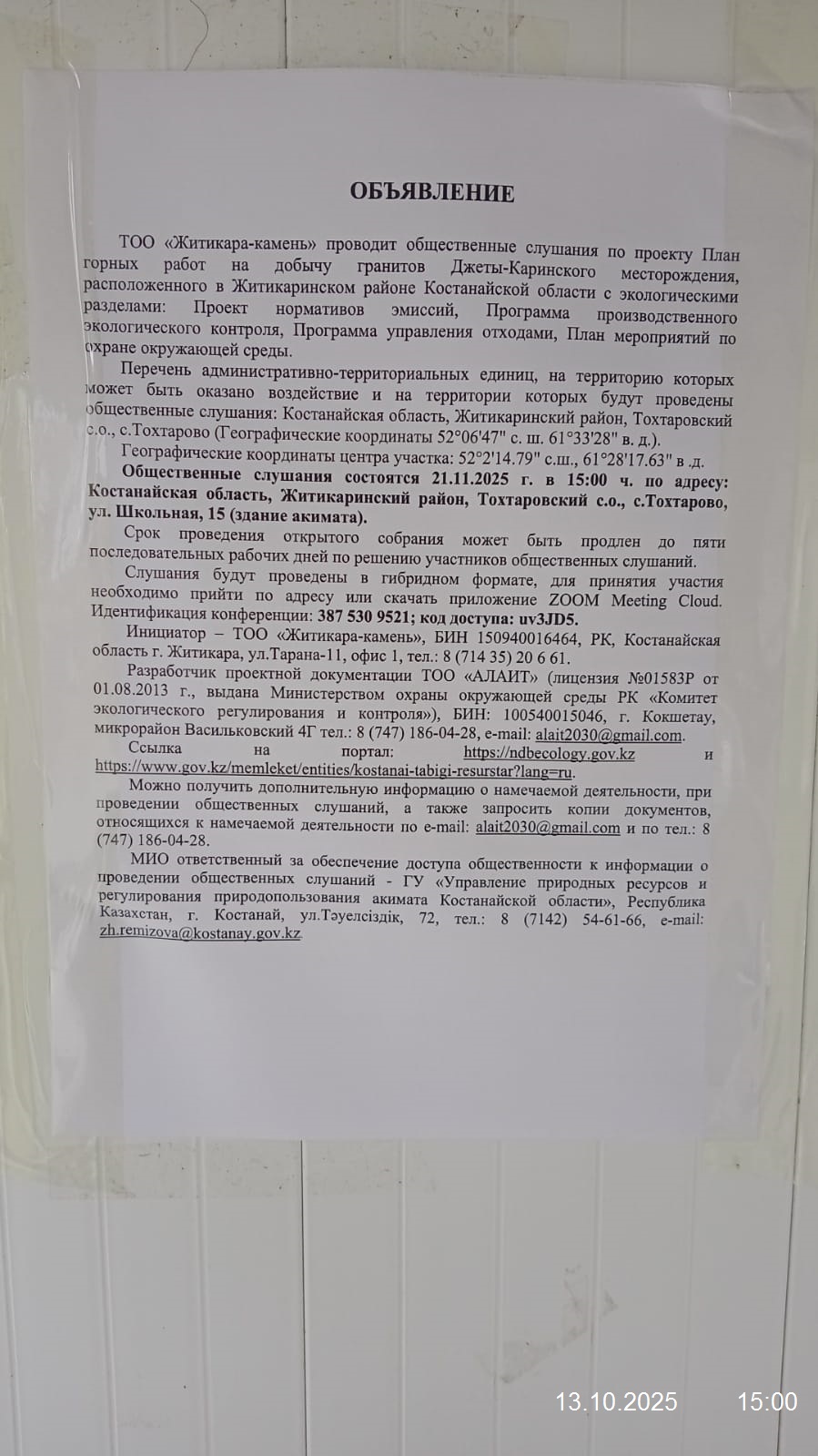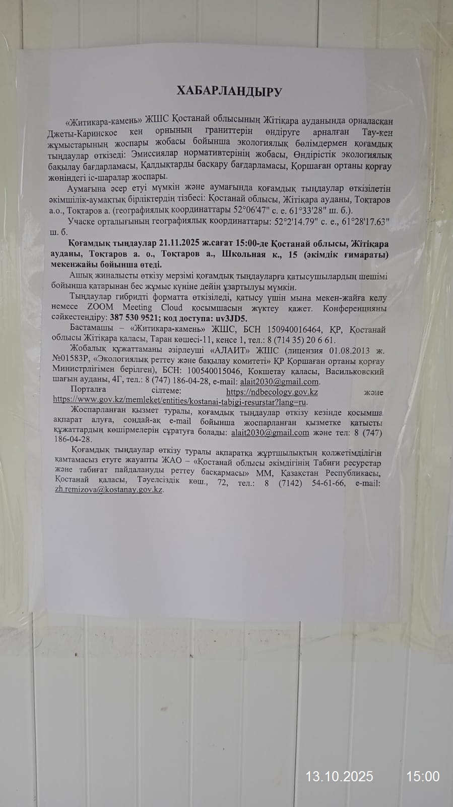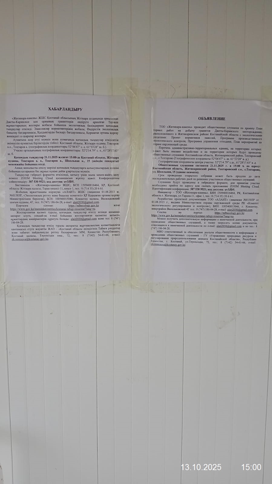 3. Общественные слушания организованны: Управление природных ресурсов и регулирования природопользования Костанайской области, zh.remizova@kostanay.gov.kz, 87142 546166,