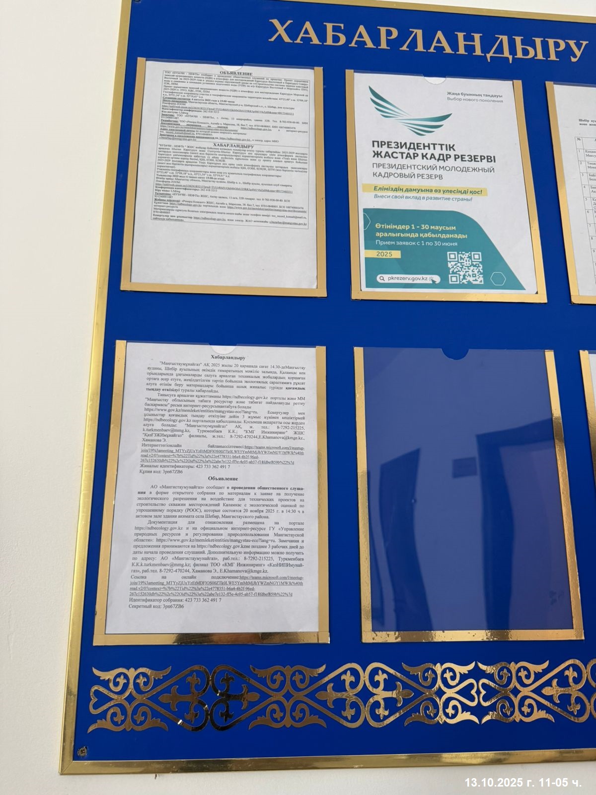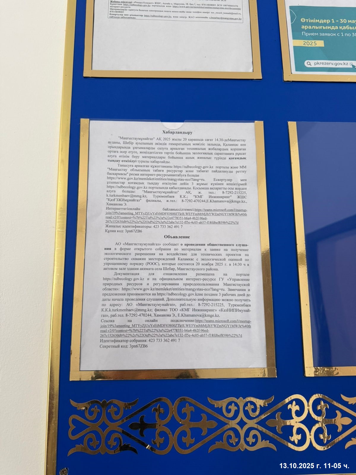 3. Общественные слушания организованны: Управление природных ресурсов и регулирования природопользования Мангистауской области, s.bazarbay@mangystau.gov.kz,