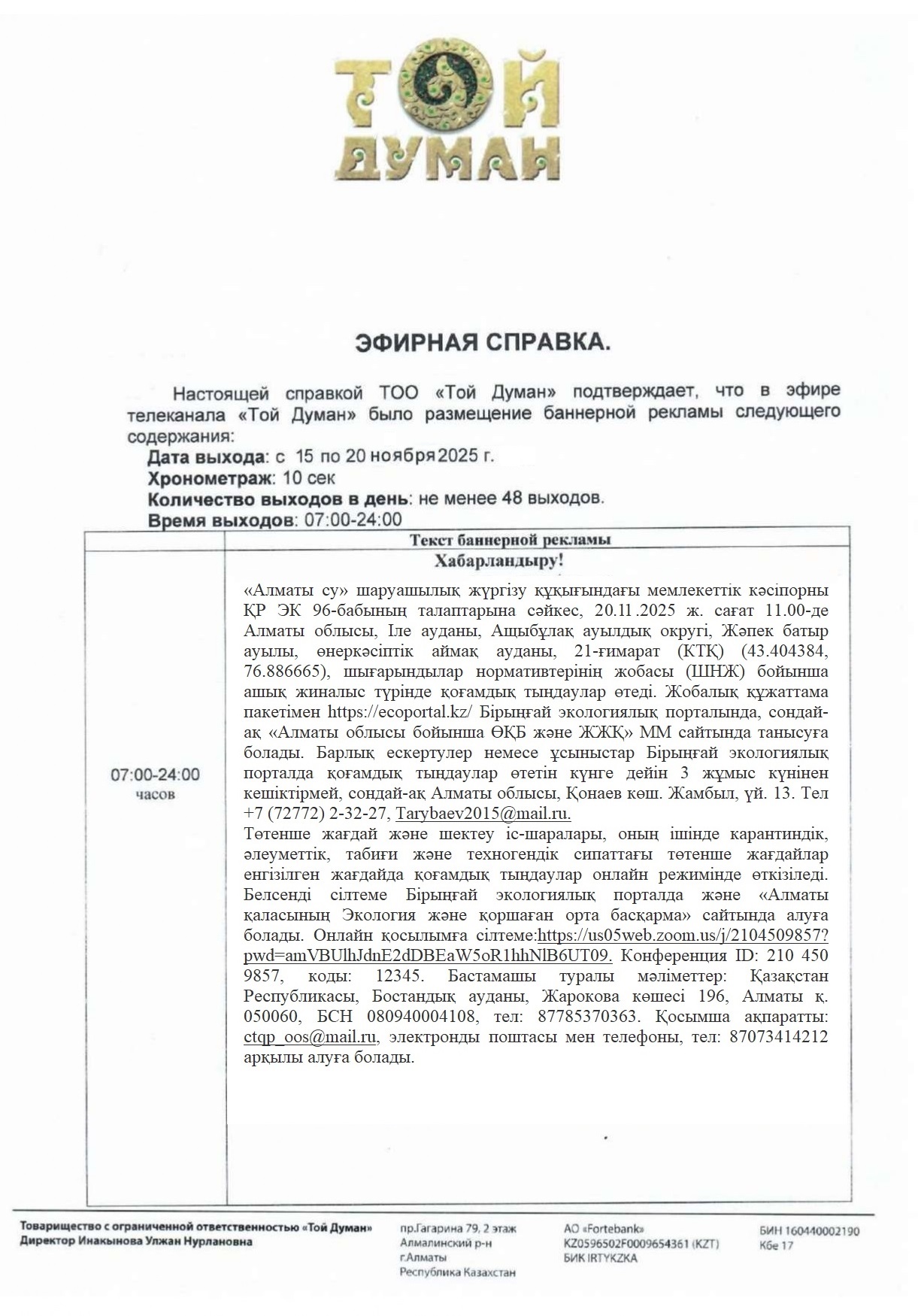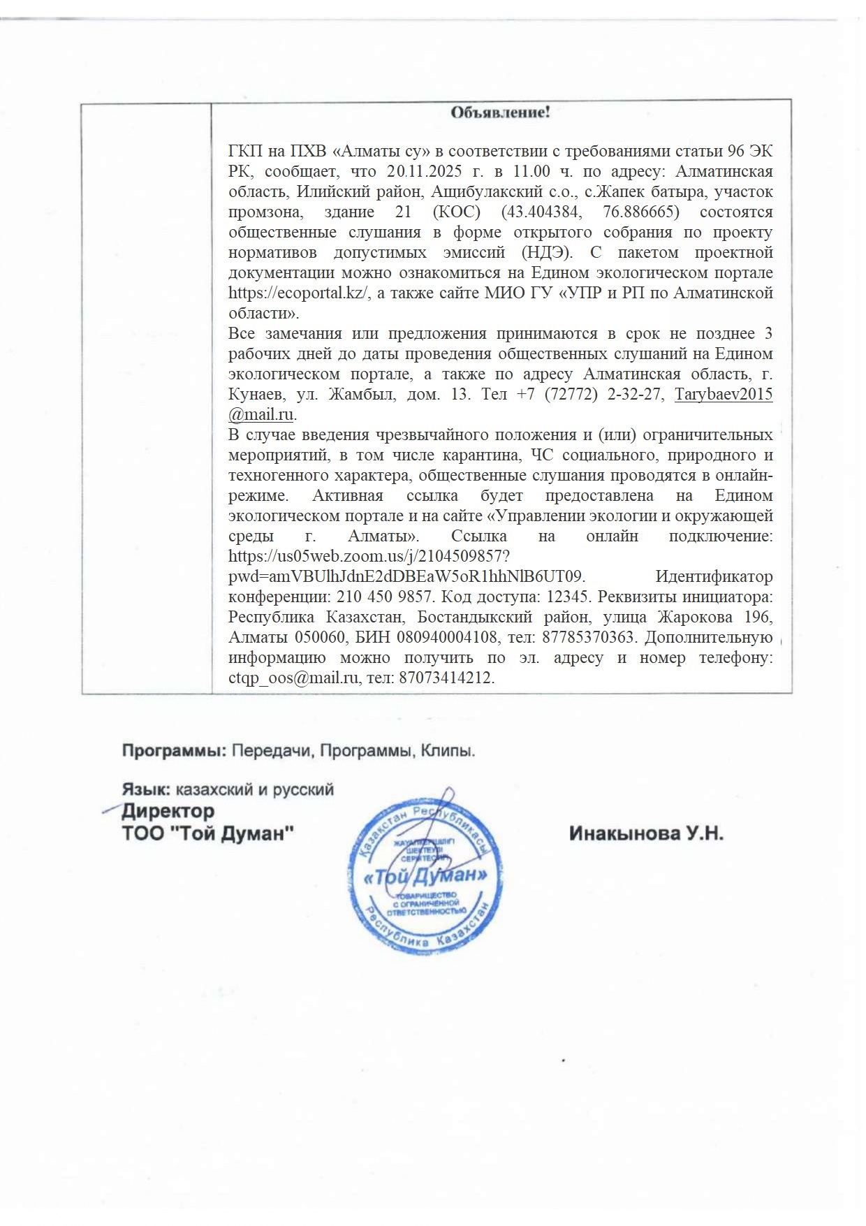 3. Общественные слушания организованны: Управление природных ресурсов и регулирования природопользования Алматинской области, 329267eco@mail.ru,