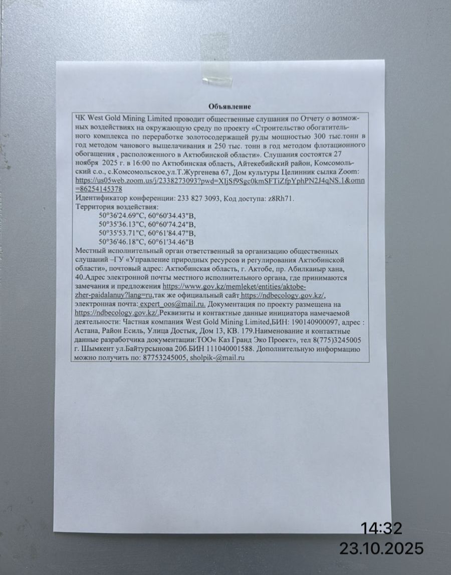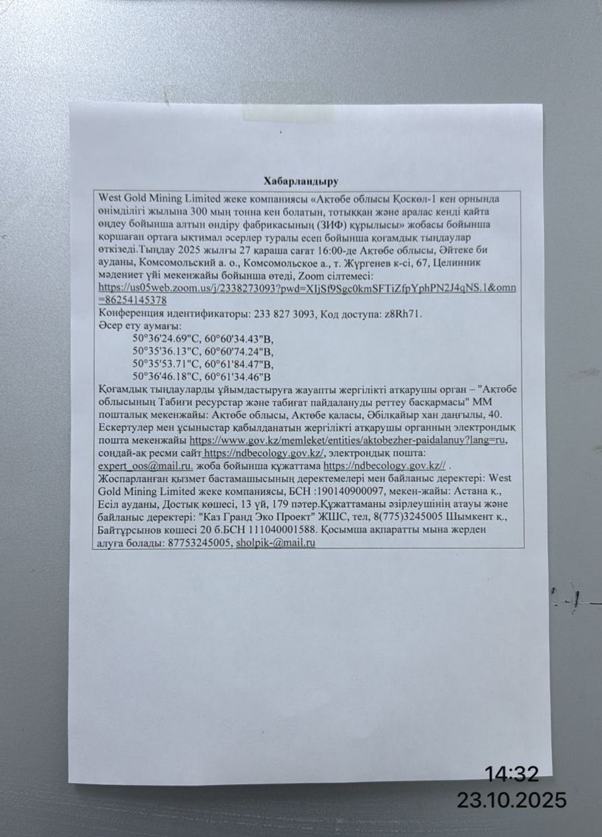 3. Общественные слушания организованны: Управление природных ресурсов и регулирования природопользования Актюбинской области, expert_oos@mail.ru,